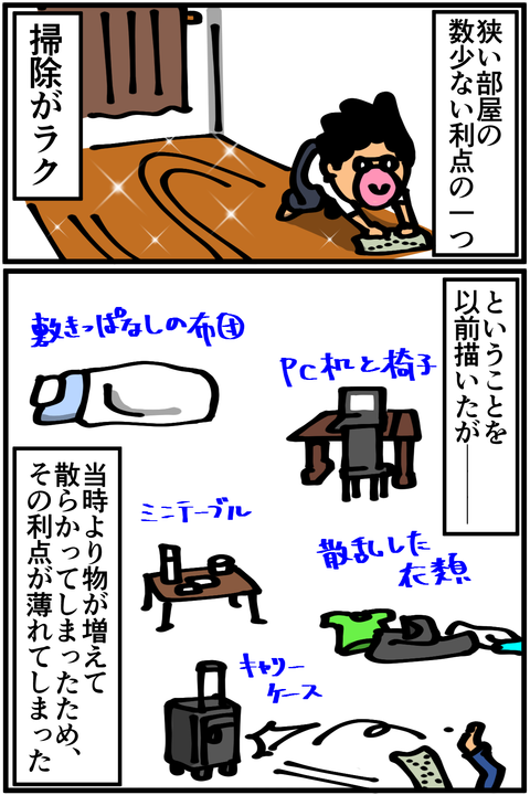 第234話「掃除がしづらくなった部屋」 人はそれを汚部屋と呼ぶ。狭い部屋の利点を無理やり見出そうとしている記事↓ ●Twitterやってます。●登録していただくと更新通知がLINEで届きます↓●Mediassortさんとプレイさせていただいたスマブラ動画の第4弾が公開されました!今回は鬼ごっこやったりしてます。 ... 2019年08月31日 続きを読む