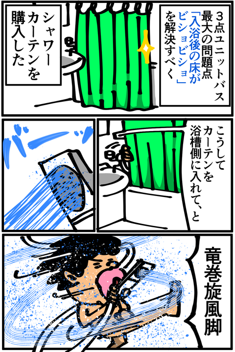 第41話「シャワーカーテンを買う」 身体を拭くためのタオルを浴室内に用意しておくとかトイレ側に足ふきマットを敷いておくとか解決策は色々あるとは思いますが、とりあえず今のところはこの強引な戦法で快適(大嘘)な風呂ライフを過ごしてます。以前コメントで教えていただいた、浴室用のサンダルが足濡れ対 ... 2019年01月18日 続きを読む