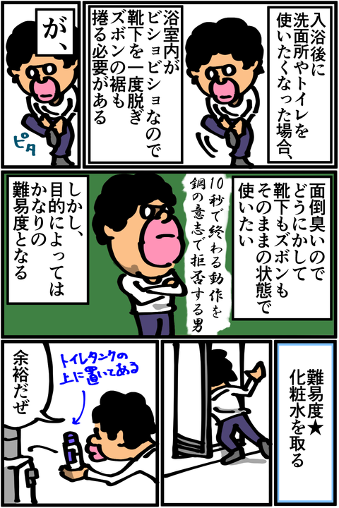 第28話「靴下を脱がずに濡れた浴室を使う」 何するにしても普通に靴下脱いだ方がよっぽどラクだった。それと前回の記事のコメントでもいただきましたが、浴室用のスリッパがあると便利そうですね。Twitterやってます。 ... 2019年01月04日 続きを読む