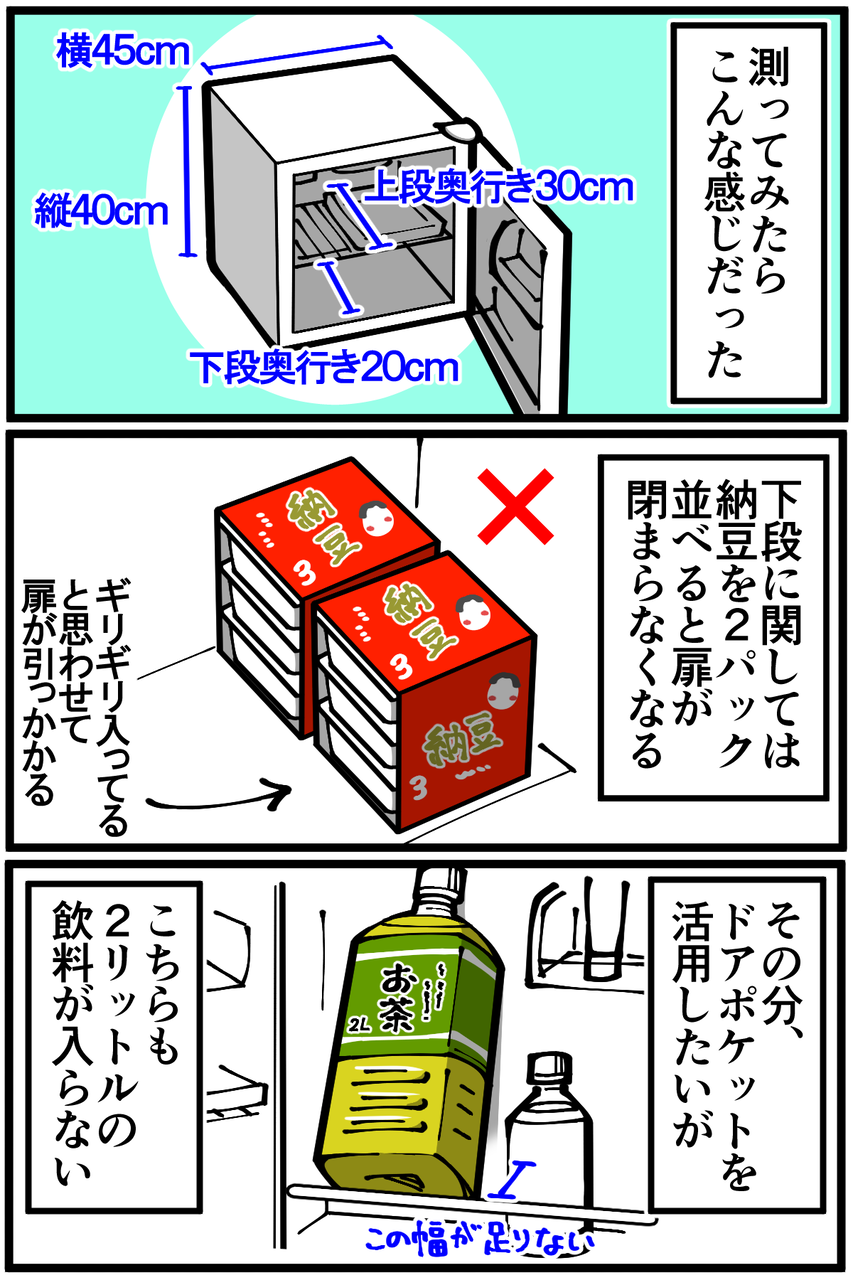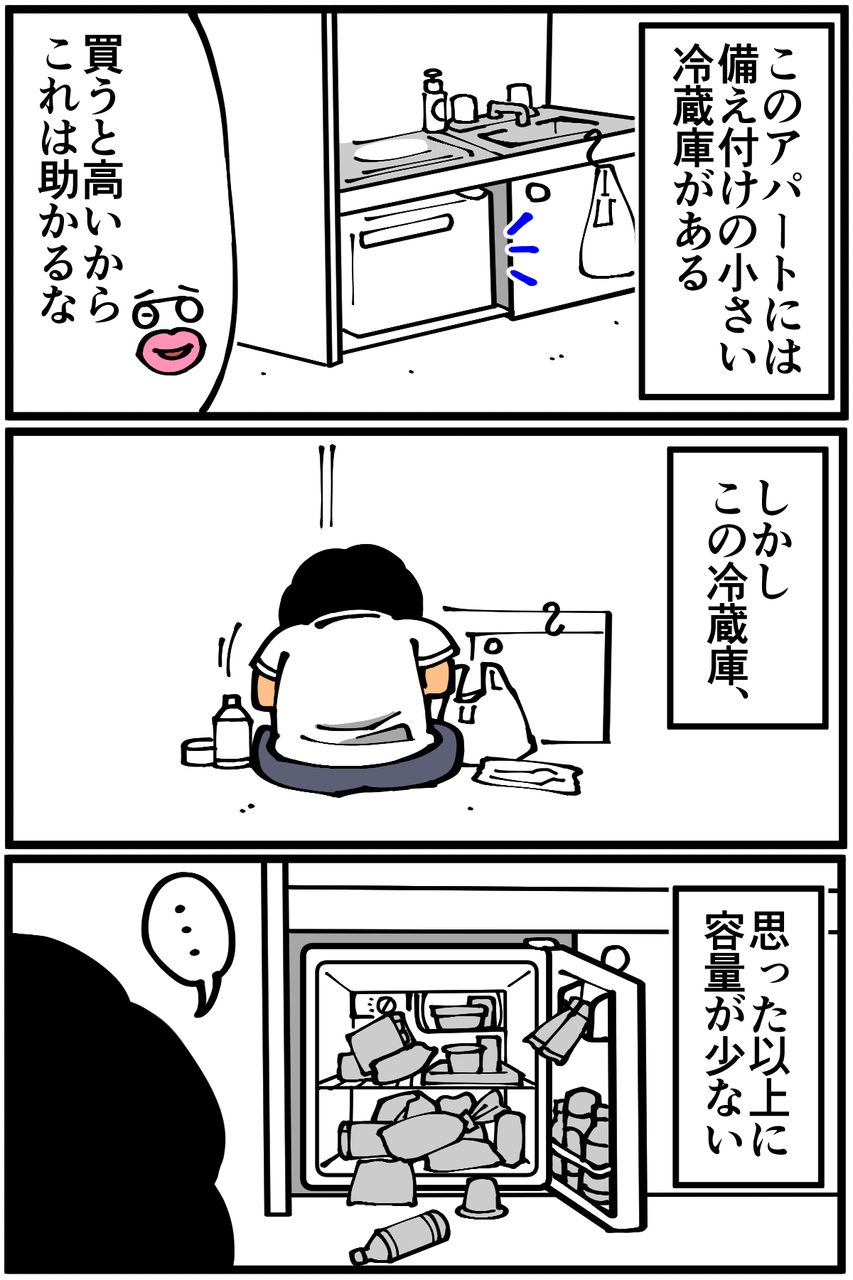 第5話「備え付けの冷蔵庫の問題点」 2018年12月12日 家賃3万円の6帖アパートでカツカツな生活を送る男の漫画ブログです。金が底を尽きてくたばるようなことがなければ毎日更新します。玄関に置いといたんですが結局お腹は壊しませんでした。スゴイ!この冷蔵庫に慣れ過ぎた結果、引っ越し後にこうなった↓ ●Twitterやってます。●Instagramでブログの過去記事など更新してます↓●登録していただくと更新通知がLINEで届きます↓●こちらのページから過去記事一覧が見られます↓●LINEスタンプ販売中です。 「絵日記」カテゴリの最新記事 < 前の記事次の記事 > コメント コメント一覧 (24) 1. 名無し 2018年12月12日 20:00 スゴイダイズ君かわいそう 0 taikutsu_ken がしました 7. 退屈健 2018年12月12日 23:19 >>1 玄関で寂しく立たされてました…笑 0 taikutsu_ken がしました 2. 2018年12月12日 20:19 スゴイダイズ君… 0 taikutsu_ken がしました 8. 退屈健 2018年12月12日 23:19 >>2 豆乳に似てるからセーフ、という理由で…笑 0 taikutsu_ken がしました 3. 11人称(仮) 2018年12月12日 20:20 スゴイダイズくん…美味しいやつだったよ… 0 taikutsu_ken がしました 9. 退屈健 2018年12月12日 23:20 >>3 割と気温が下がってからだったので割と美味しくいただけました!笑 0 taikutsu_ken がしました 4. ああああ 2018年12月12日 20:31 氷作れるところがあるから氷菓子保冷できるかなと思ったらそうでもなかったりね 0 taikutsu_ken がしました 10. 退屈健 2018年12月12日 23:20 >>4 それなんです!次の記事はまさにそのことについての漫画です!笑 0 taikutsu_ken がしました 5. かっとびランサー 2018年12月12日 20:37 冷蔵庫は買わないのですか? でも買ったら備え付けのが場所取って 更に狭くなりますかね 0 taikutsu_ken がしました 11. 退屈健 2018年12月12日 23:22 >>5 そうですね~、あると便利なんですが置くスペースもないので難しそうです!(;_;) 玄関とキッチンのスペースがあまりに狭すぎて…笑 0 taikutsu_ken がしました 6. カナ 2018年12月12日 20:44 スゴいダイズ君……君ならやれる……。 0 taikutsu_ken がしました 12. 退屈健 2018年12月12日 23:22 >>6 なんかスゴイらしいからきっと持ちこたえてくれるはず…!笑 0 taikutsu_ken がしました 13. コンタ 2018年12月13日 04:04 スゴイダイズくん劣悪環境 0 taikutsu_ken がしました 15. 退屈健 2018年12月13日 19:56 >>13 過酷な環境に耐えてもらいました…笑 0 taikutsu_ken がしました 14. ロベルト 2018年12月13日 08:03 スゴイダイズ君は無事だったのだろうか? 0 taikutsu_ken がしました 16. 退屈健 2018年12月13日 19:56 >>14 飲んでも腹は下さなかったので恐らく無事だったんだと思います!笑 0 taikutsu_ken がしました 17. はるきち 2018年12月13日 21:27 備え付け冷蔵庫は食器棚にしてもう一人暮らし用のちっこい冷蔵庫買いましょう、、 ダイズがかわいそう、、 0 taikutsu_ken がしました 19. 退屈健 2018年12月13日 22:53 >>17 あ、確かに電源落とせば普通に食器棚として使えますね! 問題は新しい冷蔵庫を置く場所が…笑 0 taikutsu_ken がしました 18. メガネ 2018年12月13日 21:37 退屈、そんな冷蔵庫で大丈夫か? 0 taikutsu_ken がしました 20. 退屈健 2018年12月13日 22:55 >>18 大丈夫じゃない、問題だ(本音) 0 taikutsu_ken がしました 21. なめこ 2022年04月29日 20:39 今読み返しますと、かなり無茶してますねアナタ。 0 taikutsu_ken がしました 23. 退屈健 2022年04月29日 21:36 >>21 生きてるのが奇跡ですね!笑 0 taikutsu_ken がしました 22. あ 2022年04月29日 20:52 元のイラストの方が面白かったですね 0 taikutsu_ken がしました 24. 退屈健 2022年04月29日 21:37 >>22 あらら!!頑張って描き直したのが仇になってしまいましたか残念…!笑 0 taikutsu_ken がしました コメントフォーム 名前 コメント 記事の評価 リセット リセット 顔 星 情報を記憶 コメントを投稿する