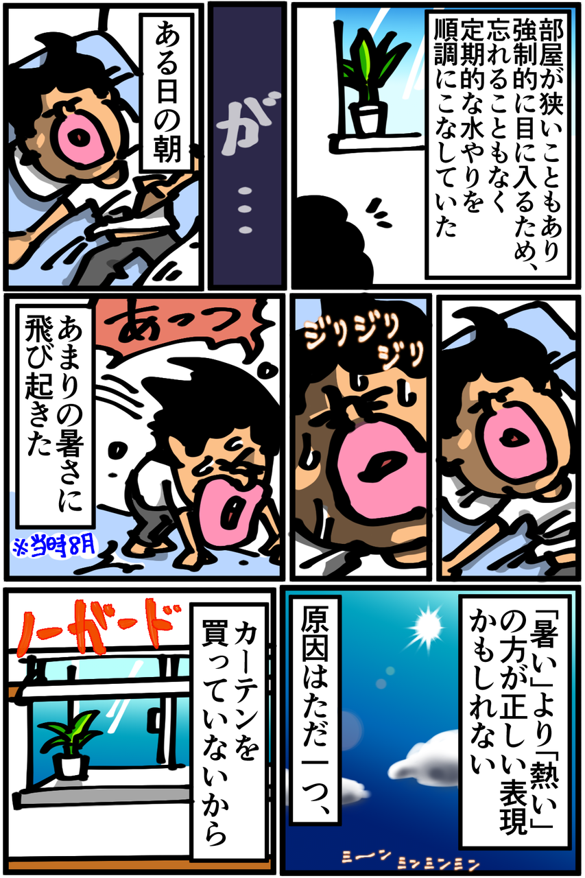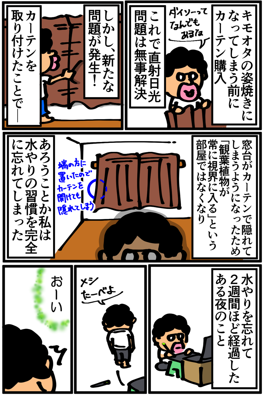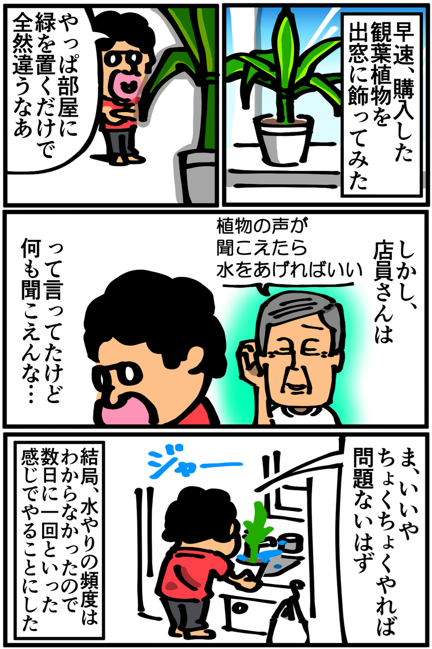第16話「観葉植物を飾る・後編」 2018年12月23日 店員さんの言う通り、声が聞こえるのは嘘ではありませんでした。と言いつつぶっちゃけた話、本当に声が聞こえたというよりは「完全に忘れ去ってたのに突然脳裏に浮かんだ」みたいな感じですが。それと前回「名前は付けないのか」といった感じのコメントをいただいたんですが今のところは付けていないので、コメント欄で名前案をいただけたら幸いです。おまけTwitterやってます。 「絵日記」カテゴリの最新記事 < 前の記事次の記事 > コメント コメント一覧 (46) 1. しげ 2018年12月23日 21:10 「サボテンジャネーヨ」((水やり)サボッテンジャネーヨとかけて) …昔そういう感じのワンシーンがドラマでありましてね… 「ネギ」とかどうでしょう 0 taikutsu_ken がしました 21. 退屈健 2018年12月24日 17:57 >>1 上手い!笑 確かに見た目はネギに近いのでありですね!笑 0 taikutsu_ken がしました 2. めがね 2018年12月23日 21:13 犬太(けんた)とか 0 taikutsu_ken がしました 22. 退屈健 2018年12月24日 17:58 >>2 口頭で聞いただけだと漢字を連想されにくそうですね!笑 0 taikutsu_ken がしました 3. モンゴスチン 2018年12月23日 21:15 ドラージュ⚫ セナちゃんとかどうですか 0 taikutsu_ken がしました 23. 退屈健 2018年12月24日 18:06 >>3 なんかめっちゃオシャレ感ありますね!笑 元ネタがわからなくてすみません(;_;) 0 taikutsu_ken がしました 4. カナ 2018年12月23日 21:32 声が聞こえたんですね✨ 念力とか使えそうなんで 「ナッシー」とかどうですか? シンプルに「みどりさん」とかでも良いかもしれない。 0 taikutsu_ken がしました 24. 退屈健 2018年12月24日 18:06 >>4 いいですね!葉がナッシーの頭そっくりなんでピッタリです!笑 0 taikutsu_ken がしました 5. 三品ポンセ 2018年12月23日 21:33 いつも楽しく読ませていただいてます、毎日の楽しみの一つになるくらい好きです。 観葉植物植物の名前は チン毛 とかどうでしょう? 0 taikutsu_ken がしました 25. 退屈健 2018年12月24日 18:09 >>5 ありがとうございます、嬉しい限りです! これまた来客に紹介しづらい名前ですね!笑 0 taikutsu_ken がしました 6. なまえがなしこ 2018年12月23日 21:35 カンタ はいかがでしょうか。 ・観葉植物の「観太」 と見せかけて ・じっと渇きに堪えている「堪太」 0 taikutsu_ken がしました 26. 退屈健 2018年12月24日 18:12 >>6 いいですね~!でも「これからも渇きに堪えてね」みたいな意味になってなかなか残酷!笑 0 taikutsu_ken がしました 7. かなかなゼミ 2018年12月23日 21:37 テレパシーに近いのでしょうか・・恋人みたいですね! ザーサイに一票。 0 taikutsu_ken がしました 27. 退屈健 2018年12月24日 18:13 >>7 恋人のような存在からの美味しそうな名前!笑 0 taikutsu_ken がしました 8. 無名 2018年12月23日 21:46 草www とかどうでしょう 0 taikutsu_ken がしました 28. 退屈健 2018年12月24日 18:13 >>8 大きく成長したら大草原不可避に改名します!笑 0 taikutsu_ken がしました 9. どすこい 2018年12月23日 21:53 タクマくんでどうでしょう 0 taikutsu_ken がしました 29. 退屈健 2018年12月24日 18:14 >>9 タクマという名前が好きすぎる人みたいになりますね!笑 0 taikutsu_ken がしました 10. メガネ 2018年12月23日 22:10 声聞こえたのかよww 退屈ジュニアはどうですか? 0 taikutsu_ken がしました 30. 退屈健 2018年12月24日 18:15 >>10 むしろ自分がドラセナジュニアに改名します! 0 taikutsu_ken がしました 11. 女 2018年12月23日 22:28 マーさん 0 taikutsu_ken がしました 31. 退屈健 2018年12月24日 18:16 >>11 叫ぶたびに呼んでるみたいになりそうです!笑 0 taikutsu_ken がしました 12. 糸田JlI 2018年12月23日 22:33 植物は日本語を話すのか!笑 名前はー、「ドラセナ先生」とかどうすかねー? 0 taikutsu_ken がしました 32. 退屈健 2018年12月24日 18:17 >>12 日本語が聞こえ(た気がし)ました!笑 シンプルにドラセナ先生いいかもしれないですね! 0 taikutsu_ken がしました 13. ンホ 2018年12月23日 22:50 命名「もう16話でビビった」ちゃん 0 taikutsu_ken がしました 33. 退屈健 2018年12月24日 18:17 >>13 何話で描いたか思い出しやすくていいかもしれないですね!笑 0 taikutsu_ken がしました 14. おじさん 2018年12月23日 23:13 「謎の草」とか…。 いつも楽しく読ませていただいてます。更新がんばってください! 0 taikutsu_ken がしました 34. 退屈健 2018年12月24日 18:18 >>14 ありがとうございます、頑張ります! その名前は最終的にラフレシアになりそうで怖い…!笑 0 taikutsu_ken がしました 15. 退屈なファン 2018年12月23日 23:40 「カーテン裏」って名前どうでしょうか 0 taikutsu_ken がしました 35. 退屈健 2018年12月24日 18:19 >>15 もはや置き場所の説明ですね!笑 0 taikutsu_ken がしました 16. マヨネーズ 2018年12月24日 00:00 土に水あげた時にシュワシュワという音を立てた情景が目に浮かびました きっと喜んだ事でしょう ドラセナ? ドラ…セナ… ド…セ… どせいさん? 0 taikutsu_ken がしました 36. 退屈健 2018年12月24日 18:19 >>16 久々の水に喜んでました! どせいさん懐かしい…!と言いつつ実はスマブラDXで初めてどせいさんの存在を知りました笑 0 taikutsu_ken がしました 17. 
