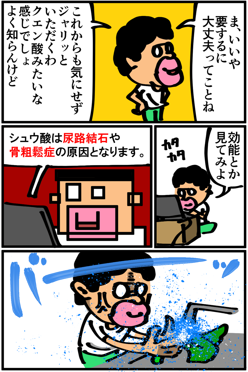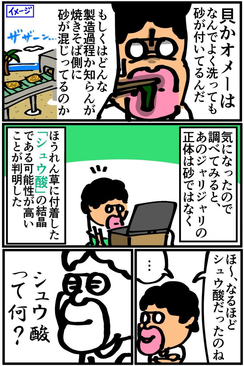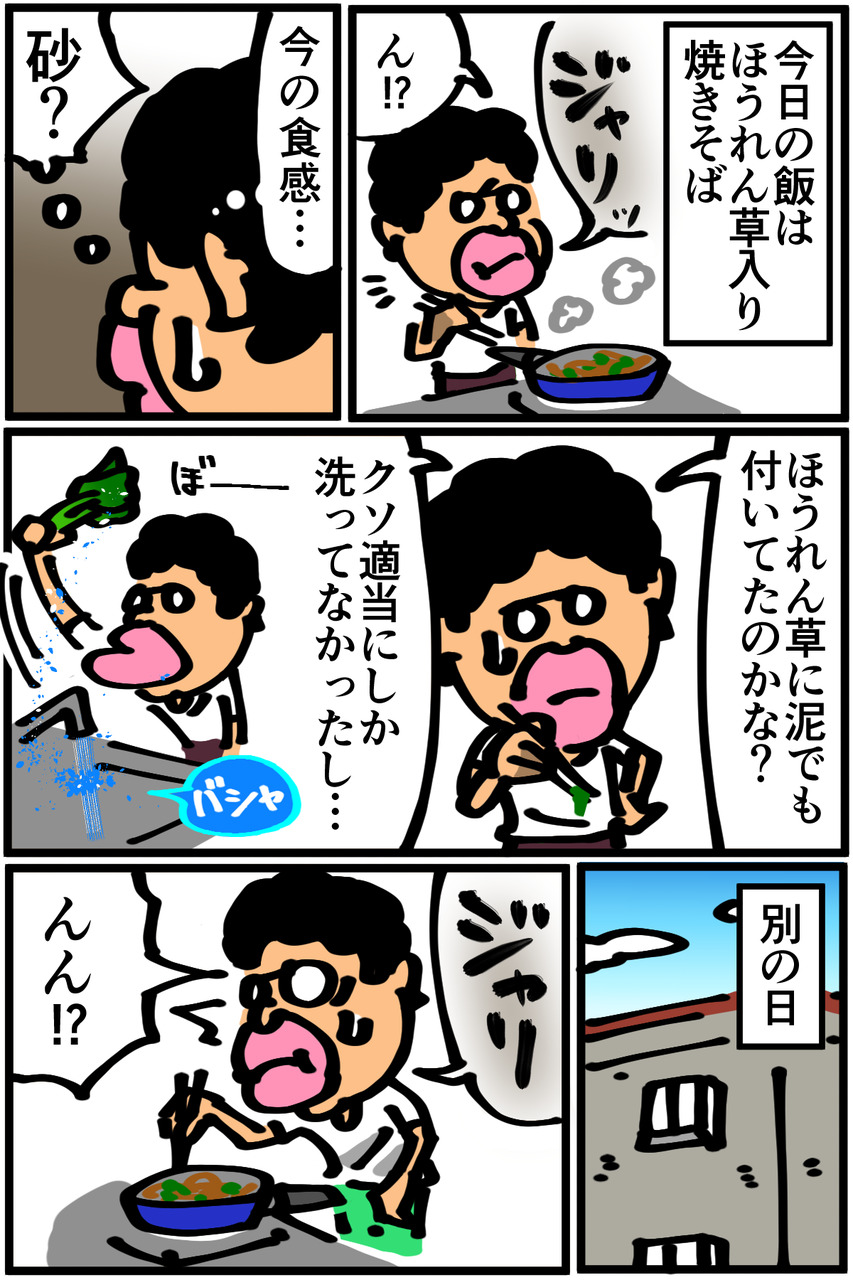 第21話「ほうれん草のジャリジャリ」 2018年12月28日 というか泥だろうがシュウ酸だろうがよく洗えやって話ですね。Twitterやってます。 「絵日記」カテゴリの最新記事 「料理」カテゴリの最新記事 < 前の記事次の記事 > コメント コメント一覧 (35) 1. ななし 2018年12月28日 20:59 ほうれん草はアク抜きした方がいいですよ……健康的にも美食的にも 0 taikutsu_ken がしました 15. 退屈健 2018年12月29日 19:59 >>1 シュウ酸、アクの成分みたいですね~(+_+)これからはアク抜きするようにします! 0 taikutsu_ken がしました 2. 悪鬼 2018年12月28日 21:00 効能知らなかったんですねw 0 taikutsu_ken がしました 16. 退屈健 2018年12月29日 19:59 >>2 どんなものなのかサッパリ知りませんでした…笑 0 taikutsu_ken がしました 3. 名無し 2018年12月28日 21:07 洗っても無駄なんじゃない?シュウ酸はほうれん草の中にあるんだから 0 taikutsu_ken がしました 17. 退屈健 2018年12月29日 20:00 >>3 アク抜きをしっかりしないとダメなんですね…!どうりでいつまでもジャリジャリしてるはずですね(;_;)笑 0 taikutsu_ken がしました 4. まいりい 2018年12月28日 21:10 僕も、知りませんでした。 料理した事ほとんど無いです。 0 taikutsu_ken がしました 18. 退屈健 2018年12月29日 20:01 >>4 自分もほぼ無いのですべてにおいて探り探りやってます…笑 0 taikutsu_ken がしました 5. 伝説くん 2018年12月28日 21:19 僕もジャリジャリした事あります! 僕の場合、自分の歯でした。 0 taikutsu_ken がしました 19. 退屈健 2018年12月29日 20:01 >>5 それは別の意味で深刻な問題が!笑 0 taikutsu_ken がしました 6. 子持ち人妻 2018年12月28日 21:30 ほうれん草じゃりじゃり分かる... 焼きそばに入れるならニラとかでもいいかもですね!塩焼きそばとかだとおススメ! 特にソースとか置いとくスペース確保も面倒だし、塩は基本なんの料理にも使いますしねw あと金欠レシピとしては、炊飯前にジャーの中に醤油と粉末ダシ入れてお好みでみりん、砂糖入れて具なし炊き込みご飯作るとオニギリにして保存できるし割といろんなおかずに合うのでおススメです!w 0 taikutsu_ken がしました 20. 退屈健 2018年12月29日 20:03 >>6 あっ、ニラもいいですね!今度買ってみます~! おお、炊き込みご飯ってそうやって作るんですか!(無知) 現在炊飯器が無いんですが欲しくなってきているので、もし買ったら試してみますありがとうございます! 0 taikutsu_ken がしました 7. 糸田JlI 2018年12月28日 21:57 まさかそんなに伏兵がいやがったとは...、今まで知らずに食べ続けてきた俺は一体...。 0 taikutsu_ken がしました 21. 退屈健 2018年12月29日 20:03 >>7 下処理をしっかりしている場合はその伏兵は既にいなかった可能性もあります!笑 0 taikutsu_ken がしました 8. 名無し 2018年12月28日 22:04 シュウ酸は茹でないと駄目じゃなかったですっけ 0 taikutsu_ken がしました 22. 退屈健 2018年12月29日 20:04 >>8 あっ、茹でないと…!どうりでいくら洗ってもジャリジャリするはずですね! 0 taikutsu_ken がしました 9. 2018年12月28日 22:15 先生~!ほうれん草は1~2分ほど茹でてシュウ酸を抜かないとダメですよ~!! 0 taikutsu_ken がしました 23. 退屈健 2018年12月29日 20:04 >>9 茹でないとダメなんですね!どうりでいくら洗ってもジャリジャリしてると!笑 0 taikutsu_ken がしました 10. カナ 2018年12月28日 22:38 退屈さん皆様コメントしておりますがホウレン草は、茹でてアク抜きしなきゃですよー。 結石は地獄の痛みらしいから気を付けてくださいよー。(父親が救急車で運ばれました) 0 taikutsu_ken がしました 24. 退屈健 2018年12月29日 20:05 >>10 物凄く痛くて地獄みたいですね…!!気を付けますありがとうございます!(;o;) 0 taikutsu_ken がしました 11. ななし 2018年12月29日 00:21 ほうれん草茹でないで使ったことないから 逆に知らなかった 0 taikutsu_ken がしました 25. 退屈健 2018年12月29日 20:06 >>11 ほぼ洗わずにバサッとフライパンにブチ込む自分みたいなのは相当稀なケースだと思います…!笑 0 taikutsu_ken がしました 12. ななし 2018年12月29日 00:36 カット野菜便利ですよね 0 taikutsu_ken がしました 26. 退屈健 2018年12月29日 20:06 >>12 カット野菜めちゃくちゃ便利ですね!包丁を使わなくて済むのがなにより便利! 0 taikutsu_ken がしました 13. 付和雷同男 2018年12月29日 08:10 えーと…す、好きです (なんか心なしか痩せてません?さすがにこんな生活してたら痩せますか…体調だけはきょうつけてください。 この世にはミカンやリンゴというものがあることも忘れないでください。) 0 taikutsu_ken がしました 14. 付和雷同男 2018年12月29日 08:12 きょうつけてください じゃなく 気をつけてください です。 申し訳ありません すいません きらいにならないでください で す 0 taikutsu_ken がしました 27. 退屈健 2018年12月29日 20:08 >>14 「きじ気で申すきです」かと思ってしまいました!笑 果物も摂りたいところなんですが高いんですよね~(+_+) 0 taikutsu_ken がしました 28. 房州三倅親父 2018年12月29日 22:52 葉物野菜ならば、ほうれん草よりも小松菜の方が下茹で要らないし、値段も安いのでお勧めですよ。 0 taikutsu_k