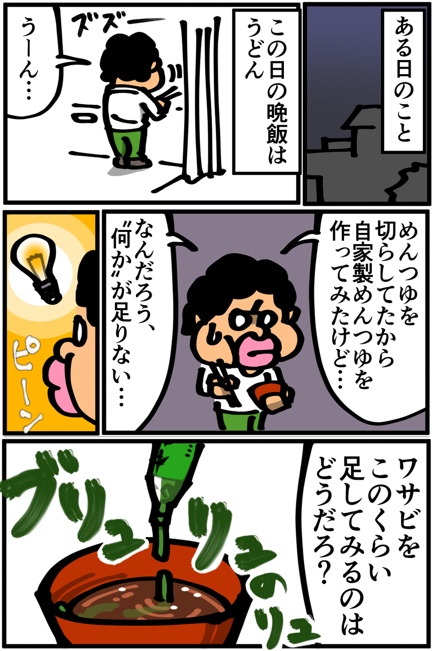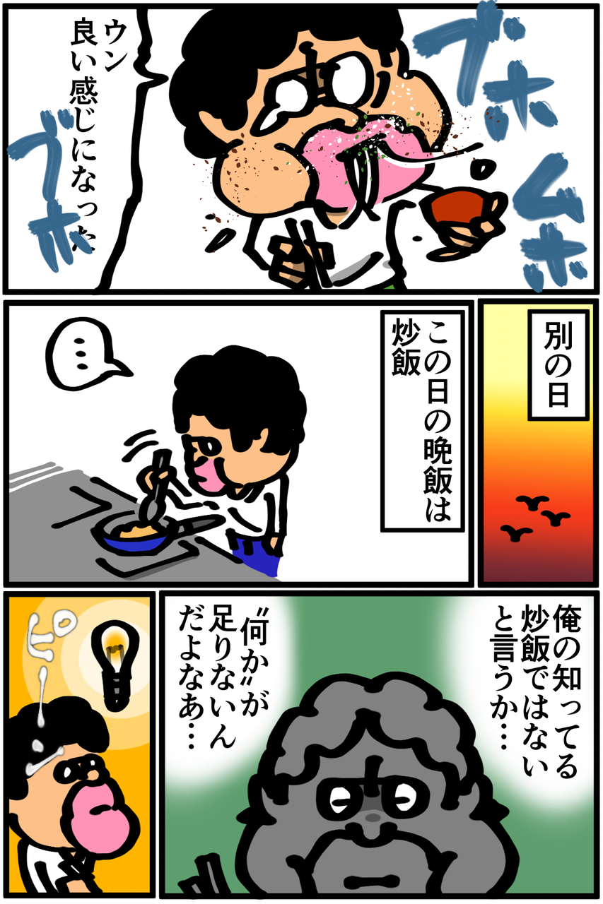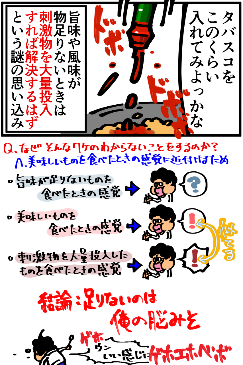 第39話「料理に"何か"が足りない時に加えるもの」 2019年01月16日 明らかに入れすぎなんですが、なぜか俺の脳はそれを「美味しい」と勘違いしているような気がします。多分、本当に足りていないのは旨味成分ってやつなんだと思う。Twitterやってます。 「絵日記」カテゴリの最新記事 「料理」カテゴリの最新記事 < 前の記事次の記事 > コメント コメント一覧 (32) 1. 名無し 2019年01月16日 21:13 脳のバグを利用して食事をするな 0 taikutsu_ken がしました 16. 退屈健 2019年01月17日 20:41 >>1 調理技術と金が不足しているのでバグで強引にカバーします!笑 0 taikutsu_ken がしました 2. え 2019年01月16日 21:16 ほんだしと中華味があればなんとかなりますよ(^^) 0 taikutsu_ken がしました 17. 退屈健 2019年01月17日 20:42 >>2 今さらながら、出汁系の万能さを改めて痛感しました…! 0 taikutsu_ken がしました 3. 赤身まぐろ 2019年01月16日 21:16 白だし最強なので 業務スーパー等で買ってみてください。 料理がガラッと変わります。 なかったら煮干しで出汁を。 0 taikutsu_ken がしました 18. 退屈健 2019年01月17日 20:42 >>3 白だしですか!まだ買ったことないので今使っているだしが切れたら買ってみます~! 0 taikutsu_ken がしました 4. 悪鬼 2019年01月16日 21:19 Twitterでレシピ晒せばワンチャン解決するのでは? 0 taikutsu_ken がしました 19. 退屈健 2019年01月17日 20:43 >>4 あまりに酷過ぎて「食材が可哀想」と炎上しそうですね!笑 0 taikutsu_ken がしました 5. 初投稿です 2019年01月16日 21:24 ポン酢とキムチ混ぜたら油淋鶏の味するよ(推奨) 0 taikutsu_ken がしました 20. 退屈健 2019年01月17日 20:43 >>5 おお、それは裏技的な!どっちも割と安めなので試してみます~! 0 taikutsu_ken がしました 6. ぴ 2019年01月16日 21:30 逆に何かが足りない麺つゆと炒飯のレシピが気になります…! 0 taikutsu_ken がしました 21. 退屈健 2019年01月17日 20:45 >>6 通常のレシピにある食材から3品くらい省いて作る感じです!笑 0 taikutsu_ken がしました 7. viscera 2019年01月16日 21:30 辛い中華料理が旨いと感じる理由はもしかして... 0 taikutsu_ken がしました 22. 退屈健 2019年01月17日 20:46 >>7 普通の料理人が作るものであれば旨味も含まれた辛味なはず…!笑 0 taikutsu_ken がしました 8. 伝説くん 2019年01月16日 21:54 白だし、めんつゆの便利さは異常ですね。 あと何か足りない時のごま油もいいですよ。 0 taikutsu_ken がしました 23. 退屈健 2019年01月17日 20:47 >>8 ごま油の存在忘れてました!こういった事態に備えて買っておこうと思います~! 0 taikutsu_ken がしました 9. しー 2019年01月16日 22:45 創味シャンタン買いましょ。 スープにチャーハン、炒め物。なんでも使えます! お湯に溶いてネギ入れるだけでくっそ美味しいですよ。 0 taikutsu_ken がしました 24. 退屈健 2019年01月17日 20:48 >>9 おお、少し前にCMで見て気になってたところでした! 万能調味料は俺みたいにズボラにもピッタリなのでチェックしてみます!笑 0 taikutsu_ken がしました 10. ななしのごんべ 2019年01月16日 23:06 退屈先生のマンガを見るのが毎晩の癒やしです。味の素、粉末昆布茶おすすめです。100円ショップで買えます(・∀・) 0 taikutsu_ken がしました 25. 退屈健 2019年01月17日 20:50 >>10 ありがとうございます(;o;) 粉末昆布茶!それは使いこなせたら面白そうですね~、探してみます! 0 taikutsu_ken がしました 11. ぽにこ 2019年01月16日 23:19 味覇買って、中華系のものに投入、 クレイジーソルト買って、洋風のものに投入、 和風の時はほんだし がおすすめですよ! 退屈先生、すべてのコメントにお返事くれててすごいですね! もっともっと人気が出ると、こんな風に丁寧に返したりはできないんだろうなぁ、と思う…とすごく寂しい😞 でも応援してます!! 0 taikutsu_ken がしました 26. 退屈健 2019年01月17日 20:51 >>11 和洋中とそれぞれに万能調味料的なものがあるんですね!むしろ全部揃えてみたいところです!笑 いえいえとんでもないです、いつもコメントで本当に力をいただいているので!! ありがとうございます! 0 taikutsu_ken がしました 12. 糸田JIl 2019年01月16日 23:56 なんか素パスタ以外も食べてて嬉しいっすね!笑 0 taikutsu_ken がしました 27. 退屈健 2019年01月17日 20:51 >>12 さすがに身体からSOS信号が出ている気がしてレパートリーをビミョ~に増やしてます!笑 0 taikutsu_ken がしました 13. 広島デヴ 2019年01月17日 00:08 タバスコやわさびはダメだけど一味ぶっかければ大抵なんとかなるぞ 0 taikutsu_ken がしました 28. 退屈健 2019年01月17日 20:52 >>13 一味いいですよね!今は七味を使ってるんですがなんにでもかけるせいで早くもなくなりそうで…笑 0 taikutsu_ken がしました 14. Sikaari Ay 2019年01月17日 04:20 私は大学4年生で、いまは卒業論文の作成をしています。 書くことがまとまらなかったり、担当教授から叱責されたり、ツラい思いでいっぱいですが、退屈先生のTwitterやブログで笑って、元気を貰っています。 コメント欄で伝えることでもないかもしれませんが…(笑) いつも、ありがとうございます。 陰ながら応援しています。私も精一杯頑張ります。 長