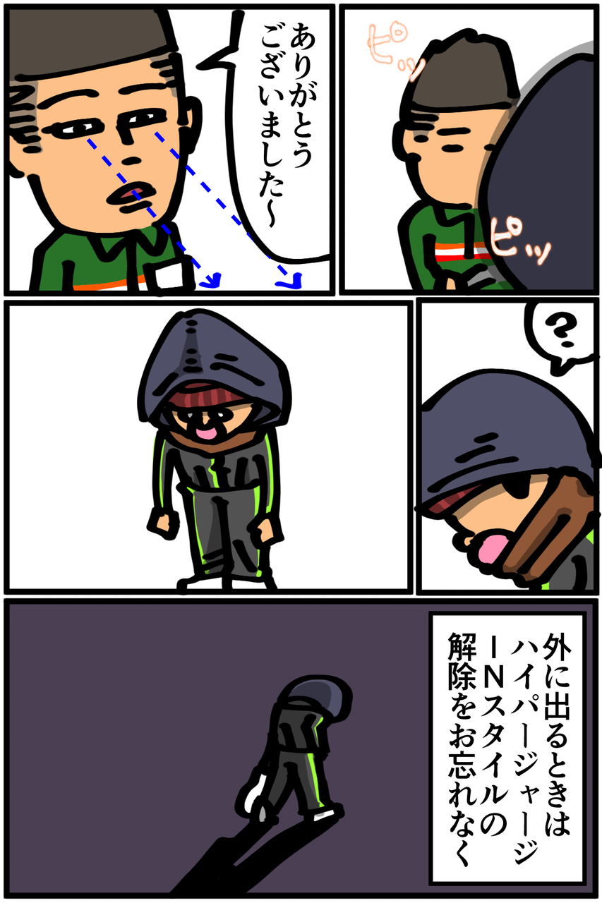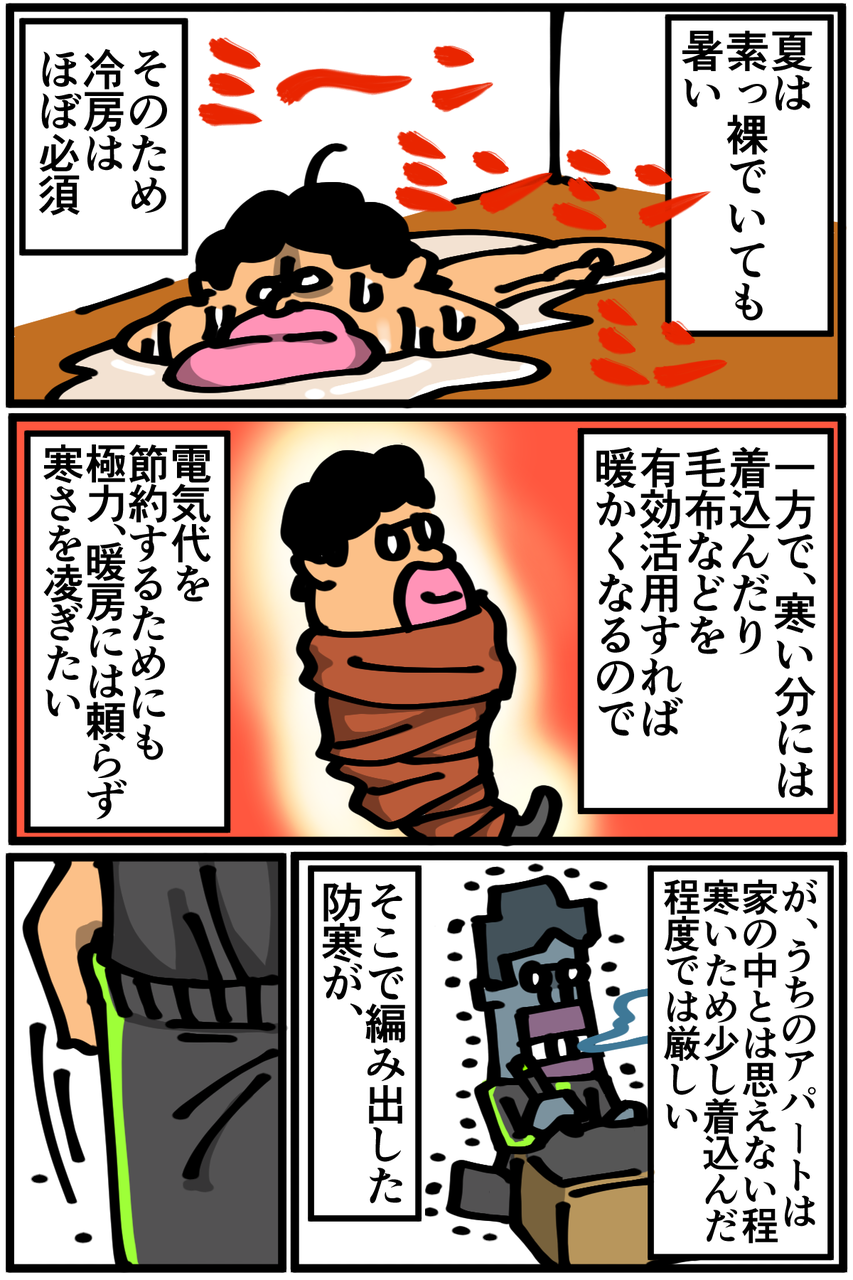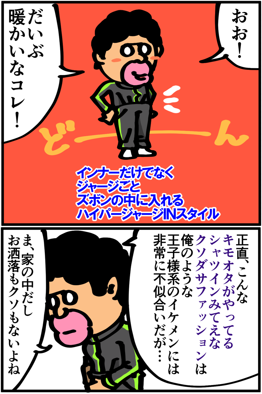 第42話「私の防寒スタイル」 2019年01月19日 なんか店員さんに見られてしまった時点でどうでもよくなったので解除せずにそのまま帰りました。あと宅急便もこのスタイルで受け取ってしまったことがある。この記事を書いている今もこのスタイルです。Twitterやってます。 「絵日記」カテゴリの最新記事 < 前の記事次の記事 > コメント コメント一覧 (20) 1. 名無し 2019年01月19日 21:21 アパートの防寒はホムセンにある隙間テープを貼るだけでも大分違いますね! まぁ気を抜くと風邪一直線ですが… 0 taikutsu_ken がしました 11. 退屈健 2019年01月20日 22:00 >>1 おお、テープですかなるほど! 確かにうちの中は外気が入り込みまくってる感じがするので試してみます! 0 taikutsu_ken がしました 2. しー 2019年01月19日 21:33 寒い時、ペットボトルにポットのお湯いれて簡易湯たんぽ作ってました。 べこって変形するけど問題なしです! ポットがなければ普通に沸かしても! お湯入れる時に100均とかにある小さい漏斗があるといいです。 やけど注意で! 0 taikutsu_ken がしました 12. 退屈健 2019年01月20日 22:01 >>2 なるほど~、それいいですね! 末端冷え性ゆえにすぐ足がキンキンに冷えてしまうので、簡易湯たんぽで凌いでみます!φ(..) 0 taikutsu_ken がしました 3. 2019年01月19日 21:36 部屋着INは必須スタイルですよね… それで外出しないように気を付けたいと思います 0 taikutsu_ken がしました 13. 退屈健 2019年01月20日 22:02 >>3 腹回りの体温が全然変わるので必須スタイルですね!笑 0 taikutsu_ken がしました 4. 名無し 2019年01月19日 21:58 寒い時期の部屋着は裏起毛がめっちゃおすすめですよ! 0 taikutsu_ken がしました 14. 退屈健 2019年01月20日 22:04 >>4 裏地がモコモコのやつでしょうか(語彙力皆無)! よさげなのを今度探してみます~! 0 taikutsu_ken がしました 5. 麒麟 2019年01月19日 22:00 退屈先生こんばんは! ハイパースタイル良いじゃないですか! 人の目なんて風邪引くよりどってことなし問題なし!! そして、ツイッターの “ズボンの裾からスマホ取り出せたら便利なのにな~って思ってたのでちょうどよかった あとたまにはスマホを地面に落としたいなとも思ってたのでちょうどよかった” 大爆笑しました!!!いつも笑顔にさせてくださってありがとうございます! 退屈先生だいちゅき☆ぶっちゅん 0 taikutsu_ken がしました 15. 退屈健 2019年01月20日 22:06 >>5 こんばんは!(^^) 風邪引くくらいなら不審者スタイルで冷たい視線浴びた方がマシですね!笑 ありがとうございます!ついに穴が拡大しまくってポケットとして機能しなくなり…笑 0 taikutsu_ken がしました 6. 糸田JIl 2019年01月19日 22:13 コメント欄とかでは自分をけなして、漫画の中ではイケメンって言うスタイルww好きです。 0 taikutsu_ken がしました 16. 退屈健 2019年01月20日 22:07 >>6 冷静に考えたらイケメンのイの字もないことに気付くという!笑 0 taikutsu_ken がしました 7. 2019年01月20日 04:15 はみ出る唇好きwww 0 taikutsu_ken がしました 17. 退屈健 2019年01月20日 22:07 >>7 ここだけはどうしてもサイズ的に収まりきらず!笑 0 taikutsu_ken がしました 8. カナ 2019年01月20日 07:42 ハイパーインスタイル良いじゃないですか(笑) 脚長効果ですよwww 今年はまだ去年より寒くないとはいえ家の向きとかの関係で部屋が冷えますよねぇ。 インフルも流行ってるみたいだし気を付けてくださいね。 0 taikutsu_ken がしました 18. 退屈健 2019年01月20日 22:09 >>8 思いっきりインすることで僅かに脚長効果がありますね!でも自分は元が短足なのでむしろ足を長く見せようと必死で可哀想な人に見えてしまいます…笑 ご心配ありがとうございます、気を付けます!(^^) 0 taikutsu_ken がしました 9. 付和雷同男 2019年01月20日 10:24 好き (インスタグラム見たらイケメンがいてビビりました笑笑。 そんなイケメン退屈先生ならジャージINも似合うはずですね。) 0 taikutsu_ken がしました 19. 退屈健 2019年01月20日 22:10 >>9 更新できるようなキラキラした写真がなく、結局インスタ半年近く放置してしまいました! とんでもないです、負のオーラ全開な顔です…笑 0 taikutsu_ken がしました 10. かなかなぜみ 2019年01月20日 11:43 ラストの物悲しさ最高です笑 0 taikutsu_ken がしました 20. 退屈健 2019年01月20日 22:11 >>10 最寄りのコンビニであのスタイルを見られたのは結構ダメージでかかったです!笑 0 taikutsu_ken がしました コメントフォーム 名前 コメント 記事の評価 リセット リセット 顔 星 情報を記憶 コメントを投稿する