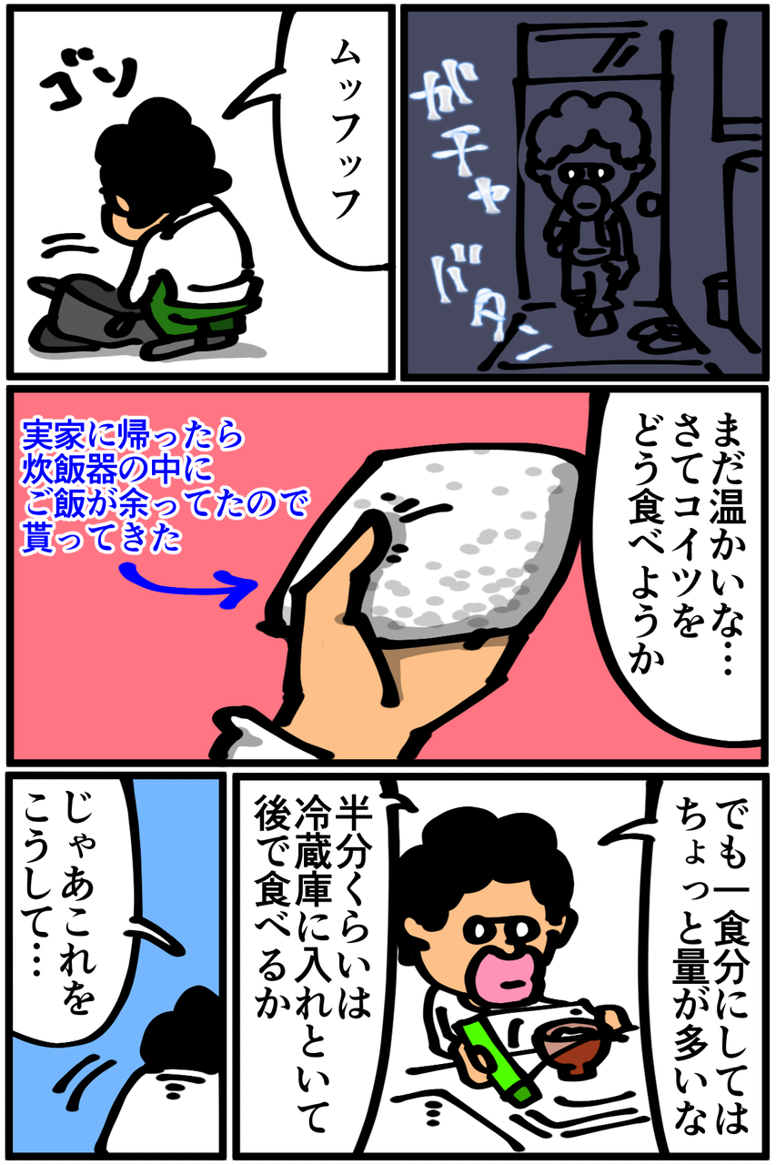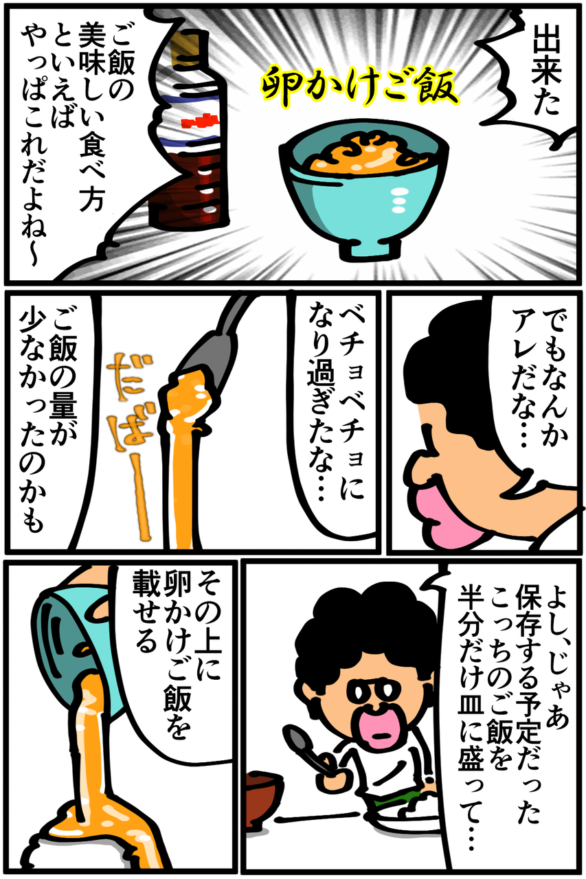 第71話「卵かけご飯を作る」 2019年02月22日 迷走しまくった上に卵の賞味期限も切れてたけど美味しかったです。Twitterやってます。●旧ブログで描いていた漫画「ニート脱却ファイタータクマくん」をMeddiasortさん制作でアニメにしていただきました。Youtubeで公開中です。第2話、近日公開予定! 「絵日記」カテゴリの最新記事 「料理」カテゴリの最新記事 < 前の記事次の記事 > コメント コメント一覧 (36) 1. チャイ 2019年02月22日 20:08 字体のおかげで豪華に見えます笑 たまごかけご飯おいしいですよね。 0 taikutsu_ken がしました 12. 退屈健 2019年02月23日 22:17 >>1 行書体にするだけでそれっぽさが出ますね!笑 0 taikutsu_ken がしました 2. ピッコリーナ 2019年02月22日 21:50 フランス風のメニュー❗ププっ❗❗ 笑いが止まらなさすぎるっ❗ 密かに『マー"』❗❗の叫び声も好き💕 最近このブログにドハマリ中➰➰🎵 0 taikutsu_ken がしました 13. 退屈健 2019年02月23日 22:17 >>2 ありがとうございます! 「~を添えて」を加えると一気にフランス料理風になって良いですね!笑 0 taikutsu_ken がしました 3. あ 2019年02月22日 22:13 勢いがほんとすきです 0 taikutsu_ken がしました 14. 退屈健 2019年02月23日 22:19 >>3 ありがとうございます!勢いでごまかしてます!笑 0 taikutsu_ken がしました 4. 中川侑樹 2019年02月22日 22:16 僕もちょうど今日の昼間に 卵かけご飯を食べました♪ 美味しいですよね\(^o^)/ でも 賞味期限切れてたら 生で食べたら危ないと思います(笑) 0 taikutsu_ken がしました 15. 退屈健 2019年02月23日 22:20 >>4 確かに賞味期限切れを生だと危険ですね!!体の免疫力を過信してギリギリの橋を渡る毎日です…!笑 0 taikutsu_ken がしました 5. moe 2019年02月22日 22:20 うちの母親には賞味期限、消費期限という概念が無かったので、卵は割ってみて白身が茶色くなってない、黄身が緑ががってない、変な味がしないものであれば食べさせられてました\(^o^)/ おかげでインフルエンザでも食欲の落ちない強い子に育ちました(寝て食うからすごい太る) 0 taikutsu_ken がしました 16. 退屈健 2019年02月23日 22:22 >>5 それは強い!でも数字にとらわれすぎず感覚で判断するのも重要ですね!笑 自分もちょくちょく、変な臭いはしないし大丈夫かなというざっくりした理由でセーフの判断を下してます!笑 0 taikutsu_ken がしました 23. moe 2019年02月24日 00:21 >>16 同じような環境で育った友人が 『とりあえずレンジでチンして、すっぱい臭いがしなければすべての食物は食べられる』と言ってました笑 ご参考までに笑 0 taikutsu_ken がしました 6. 醤油 2019年02月22日 22:21 画面の暴力 0 taikutsu_ken がしました 17. 退屈健 2019年02月23日 22:22 >>6 勢いでごまかしてます!笑 0 taikutsu_ken がしました 7. 糸田JIl 2019年02月22日 22:33 とても材料2つとは思えない料理名の長さ。笑 0 taikutsu_ken がしました 18. 退屈健 2019年02月23日 22:22 >>7 よく考えたらただの「卵かけご飯」です!笑 0 taikutsu_ken がしました 8. 名無し 2019年02月23日 00:30 物凄く美味しそう。。。いや実際美味しいけど。 0 taikutsu_ken がしました 19. 退屈健 2019年02月23日 22:23 >>8 どう転んでも美味しくて失敗しようがないというありがたい料理ですね! 0 taikutsu_ken がしました 9. はるきち 2019年02月23日 11:44 なんか美味そう。。 でもたまごかけると炒めたくなる。。デリシャスチャーハン。。 0 taikutsu_ken がしました 20. 退屈健 2019年02月23日 22:24 >>9 卵、ご飯とあるとチャーハンにもしたくなりますね~!お手軽にできるし…! 0 taikutsu_ken がしました 10. 暇 2019年02月23日 11:59 そろそろうんこかけご飯を食べそうな勢い 0 taikutsu_ken がしました 21. 退屈健 2019年02月23日 22:24 >>10 それだったら無理して何かかけようとせずご飯をそのまま食べた方が!!笑 0 taikutsu_ken がしました 11. ステロイド 2019年02月23日 21:04 卵かけご飯かけご飯はしたことがなかった。いいアイディア。 0 taikutsu_ken がしました 22. 退屈健 2019年02月23日 22:25 >>11 ご飯そのものの美味しさも楽しめるので混ぜないで食べるのもありですね! 0 taikutsu_ken がしました 24. 科学忍者隊ガッチャピン 2019年02月24日 11:12 卵かけご飯は1分ぐらいレンチンすると美味しいよ♪ 0 taikutsu_ken がしました 26. 退屈健 2019年02月24日 19:01 >>24 なるほど、確かにちょっと温かい方が美味しそうですね! 0 taikutsu_ken がしました 25. 房州三倅親父 2019年02月24日 14:14 そしてこのゴージャスな卵かけゴハンをオカズにして白米を食べましょう‼小生、チャーハンをオカズに白米を食べたことがあります…💦 0 taikutsu_ken がしました 27. 退屈健 2019年02月24日 19:01 >>25 いいですよね~!自分も割と味の濃いご飯をおかずにご飯が食べたくなるタイプです!笑 0 taikutsu_ken がしました 28. うわん 2019年02月24日 21:44 卵かけご飯を焼いたら美味しいですよ 0 taikutsu_ken がしました 29. 退屈健 2019年02月25日 19:51 >>28 美味しいチャーハンが完成しますね!笑 そういえばチャーハンは後から混ぜる派なので、今度先に混ぜた状態で作ってみます! 0 taikutsu_ken がしました 30. あんこ 2019年02月27日 19:40 凄く面白い(笑) ハマる(笑)