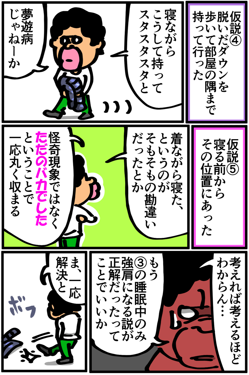 実際は「あっついなあ」と寝ぼけて脱いだダウンを床を滑らせて部屋の隅に捨てていたわけですが、個人的には全然予想してなかったので目から鱗でした。