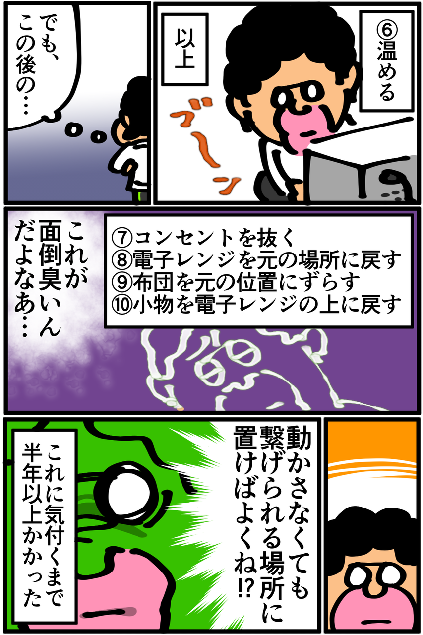 第95話「電子レンジをあまり使わない理由」 2019年03月21日 他にも延長コードとか色々解決策があったんですが何故かずっと面倒な手順で使ってました。キッチンに置くスペースがあればそれが一番ベストなんですけどね。皿一枚の置き場所に困ることがあるくらいなので無理そうです。Twitterやってます。●旧ブログで描いていた漫画「ニート脱却ファイタータクマくん」をMeddiasortさん制作でYoutubeアニメにしていただきました。第2話公開されました!先の展開がコメント次第という視聴者ブン投げ型コンテンツなので、タクマくんの将来のためにも色々なコメントお待ちしてます! 「絵日記」カテゴリの最新記事 < 前の記事次の記事 > コメント コメント一覧 (26) 1. ななし 2019年03月21日 21:32 ありますよね…「どうしてこんなことに気付かなかったんだ…?」って 気付いた後自分でも疑問に思ってしまうような事って… くす玉から明るく出て来る「面倒臭いから」が個人的お気に入りコマです。 0 taikutsu_ken がしました 13. 退屈健 2019年03月22日 21:41 >>1 灯台下暗し的に、根本的な部分だったりしますよね! ありがとうございます、クソみたいな理由なので敢えて明るく発表しました!笑 0 taikutsu_ken がしました 2. アントニオえのき 2019年03月21日 21:39 チ(ャ)ンとしなきゃ……電子レンジだけに 昨日も駄洒落言ったのに。もうやめときます 添い寝はやめたんですかね。電子レンと添い寝、退屈先生らしくて(どういう意味だ)好きでした 0 taikutsu_ken がしました 14. 退屈健 2019年03月22日 21:42 >>2 ちょうど自分もさっきTwitterで駄洒落をツイートしたところでした!笑 添い寝、実はまだしてるんです…!笑 0 taikutsu_ken がしました 3. 糸田JIl 2019年03月21日 21:56 当初は適当に踊ってれば良いみたいに言ってたのに。笑 買ってからどの位で使わなくなったんですか?笑 0 taikutsu_ken がしました 15. 退屈健 2019年03月22日 21:42 >>3 言ってましたね~! 最初からあまり使ってなかったんですが、ここにきてフル稼働してます!笑 0 taikutsu_ken がしました 4. しょう 2019年03月21日 22:03 安いカラーボックスとか買って中に小物、上に電子レンジ置いたらどうでしょう? 0 taikutsu_ken がしました 16. 退屈健 2019年03月22日 21:43 >>4 小物を収納させてなくて部屋が汚いのでそれは良さそうですね~! 0 taikutsu_ken がしました 5. チャイ 2019年03月21日 22:03 思わぬところに真実が…! 使いやすくなりましたか?? 0 taikutsu_ken がしました 17. 退屈健 2019年03月22日 21:43 >>5 めちゃくちゃラクになってフル稼働させてます!笑 0 taikutsu_ken がしました 6. 名無し 2019年03月21日 22:23 思いきって棚とかキッチンラック買いましょう 便利ですよ! 3000円以内でも買えます 0 taikutsu_ken がしました 18. 退屈健 2019年03月22日 21:44 >>6 なるほど、それいいですね! ここは一つDIYに挑戦してみるのも手ですね(無謀)! 0 taikutsu_ken がしました 7. 砂糖 2019年03月21日 23:26 たまにありますよね 0 taikutsu_ken がしました 19. 退屈健 2019年03月22日 21:44 >>7 根本的なところに気付かないケースでした…笑 0 taikutsu_ken がしました 8. たいくつしのぎ 2019年03月21日 23:35 そもそも電子レンジの上や周辺に物を置いてはいけないのでは? 取説にそう書いてあったような気がします。🙄 0 taikutsu_ken がしました 20. 退屈健 2019年03月22日 21:45 >>8 マジですか!!危ないところでした…! 取扱説明書を読まないツケがここで…笑 0 taikutsu_ken がしました 9. むら 2019年03月21日 23:54 使う前に一仕事😩になっちゃいますもんね😩レンジは一番楽な調理法?なのに。 0 taikutsu_ken がしました 21. 退屈健 2019年03月22日 21:45 >>9 場所を変えたら一気に超便利アイテムになりました!笑 0 taikutsu_ken がしました 10. ピッコリーナ 2019年03月22日 09:20 布団をずらして…で思い出したんですけど… 以前マットレス+布団だったんですけど週1で布団はベランダに干してたんですけどマットレスはソファーにもなるやつで、そのまま使ってたんですね。 ある日(半年くらい❓)マットレスをひっくり返してみたら…… 一面カビだらけでした……💦💦 フローリングは吸湿性ない上にお風呂とかでワンルームって湿気が溜まりやすいですよね~。 退屈先生リアルに布団にキノコ生えてませんか~❓(食べたらダメ🆖ですよ笑) クーラーやエアコン使わない春先がヤバイですよ。布団干せない場合は、たまに裏表代えてみてはいかがでしょうか❓ 0 taikutsu_ken がしました 22. 退屈健 2019年03月22日 21:51 >>10 そうなんです、実はその布団に関してのことは描かなければいけないことがあるので近日中に別途の記事で改めてご報告します!笑 フローリングの恐ろしさを知ることとなりました…笑 0 taikutsu_ken がしました 11. はるきち 2019年03月22日 10:33 レンジは延長コード使うのはやめといた方がいいかもなのでそのまま電源から取っといた方がいいです(╯•﹏•╰) てかなんでそんな邪魔な位置に布団あるんだw 0 taikutsu_ken がしました 23. 退屈健 2019年03月22日 21:51 >>11 本当、寝る位置が謎ですね!笑 延長コード危険なんですか!ありがとうございます、