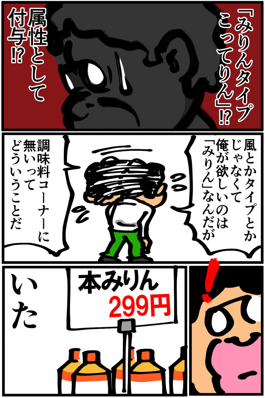 おじさんがスーパーでみりんを探す様子という世界一どうでもいいことを描いてしまい申し訳ございませんが、次回に続きます。