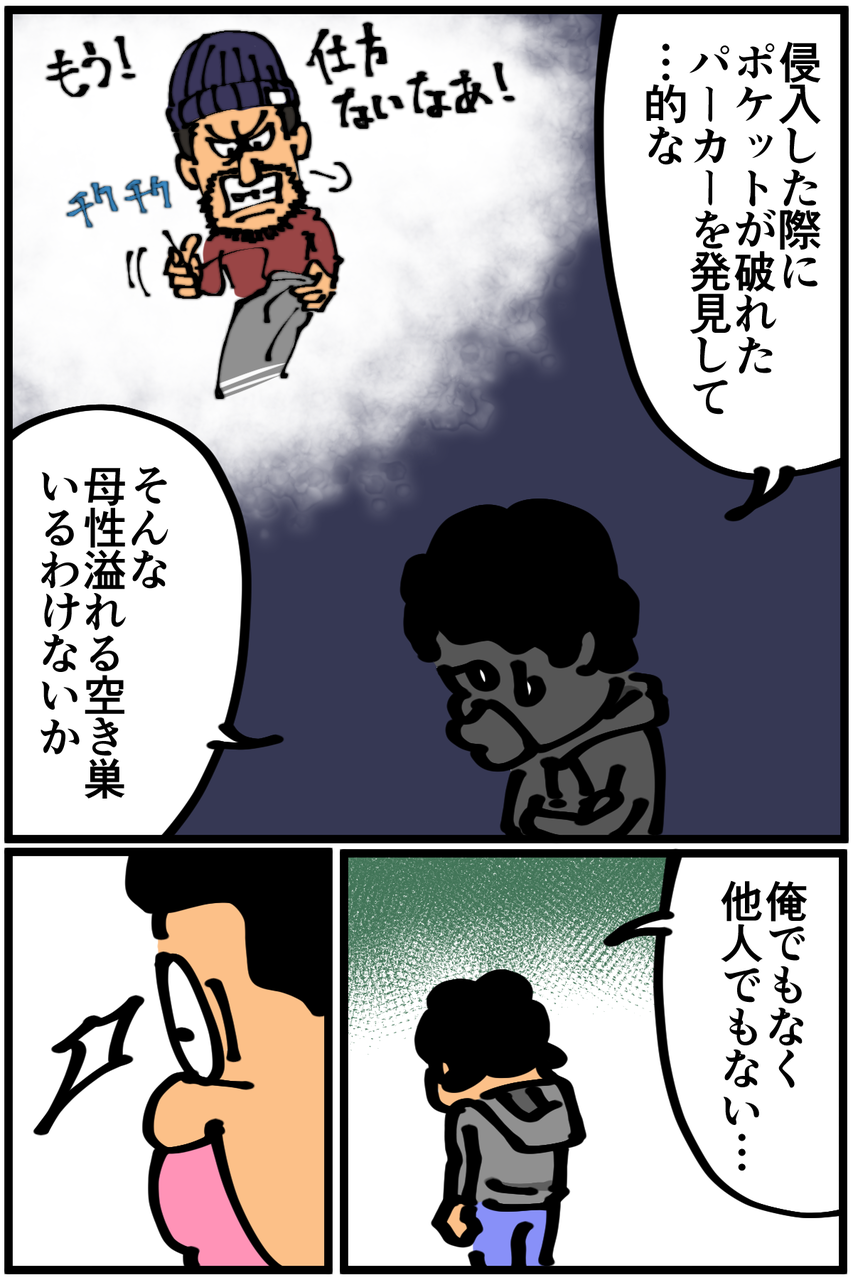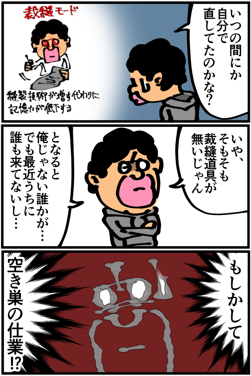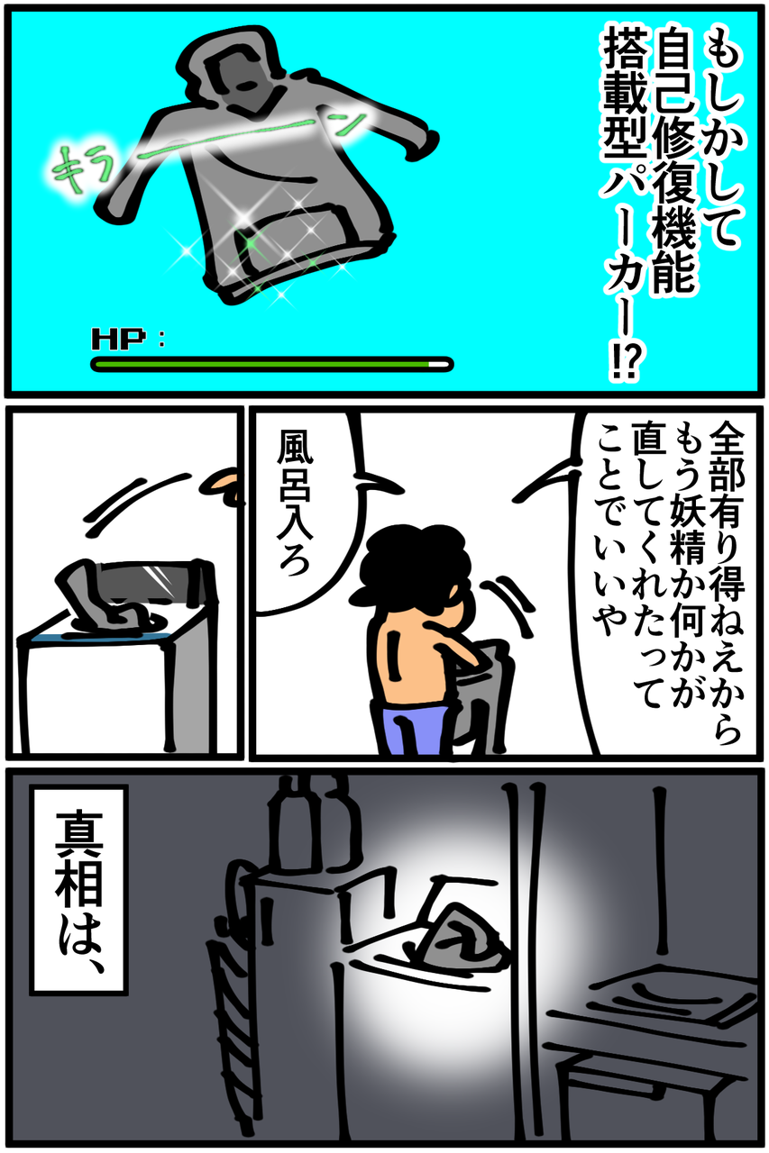 第157話「怪奇現象"破れてたはずのパーカーのポケット"」 2019年06月02日 2枚持ってきた記憶が無いので何にしろ頭がヤバい。●Twitterやってます。●登録していただくと更新通知がLINEで届きます↓●旧ブログで描いていた漫画「ニート脱却ファイタータクマくん」をMeddiasortさん制作でYoutubeアニメにしていただきました。第2話公開されました!先の展開がコメント次第という視聴者ブン投げ型コンテンツなので、タクマくんの将来のためにも色々なコメントお待ちしてます! 「絵日記」カテゴリの最新記事 < 前の記事次の記事 > コメント コメント一覧 (24) 1. 0602 2019年06月02日 20:33 ホラー物件!? からのわろた。 0 taikutsu_ken がしました 8. 退屈健 2019年06月03日 21:47 >>1 初めてのホラー体験かと思いました!笑 0 taikutsu_ken がしました 2. たかこ 2019年06月02日 20:49 おもしろー😂 0 taikutsu_ken がしました 9. 退屈健 2019年06月03日 21:47 >>2 ありがとうございます! 0 taikutsu_ken がしました 3. むら 2019年06月02日 21:05 怪奇な現象ならワクワク😍と期待してましたが空き巣が服を交換💦なんかしてたら怖いですからね。解決して良かったです。 0 taikutsu_ken がしました 10. 退屈健 2019年06月03日 21:48 >>3 「ただのバカ」という真相で安心しましたが、今度は自分の頭が心配になってきました…笑 0 taikutsu_ken がしました 4. 糸田JIl 2019年06月02日 22:03 それは気づくまでかなり怖いでしょうね。笑 僕だったら怖すぎて捨てる可能性すらあるでしょうし。笑 0 taikutsu_ken がしました 11. 退屈健 2019年06月03日 21:48 >>4 本当に知らぬ間に直ってるというケースだったら怖すぎて処分しますね!笑 0 taikutsu_ken がしました 5. ななししん 2019年06月03日 08:11 そのまま気付かず探偵ナイトスクープ行きになってほしかったw 0 taikutsu_ken がしました 12. 退屈健 2019年06月03日 21:49 >>5 同時に洗濯していなかったらいつまでも気付いてなかったかもしれないです!笑 0 taikutsu_ken がしました 6. なーこ 2019年06月03日 11:05 パーカーお直し妖精とか雪見だいふくの精とかいろいろ同居している♪ 妖精系は未経験ですがカナブンなら飼ったことあります 0 taikutsu_ken がしました 13. 退屈健 2019年06月03日 21:51 >>6 脳みそが危ない状態の人間特有の同居人が複数存在してます!笑 カナブン、よく見ると可愛いですよね~! 0 taikutsu_ken がしました 7. しー 2019年06月03日 17:23 退屈家には裁縫セットないので、裁縫セットを持ち歩く空き巣、、、笑 0 taikutsu_ken がしました 14. 退屈健 2019年06月03日 21:52 >>7 何も盗らずに縫って帰ってくれるとは感謝しかないですね!笑 0 taikutsu_ken がしました 15. お昼 2019年06月04日 12:27 妖精さんの仕業ではないでしょうか🧚♀️ 0 taikutsu_ken がしました 20. 退屈健 2019年06月05日 20:30 >>15 見るに見かねた妖精さんが直してくれたんですかね!笑 0 taikutsu_ken がしました 16. の 2019年06月04日 20:44 勝手におかんとかが来て 気付いて直してってくれたとかかと思った! そんな空き巣や機能が搭載されてるパーカーがあれば良いのに... 気に入ったのに限ってボロくなる...ヘビロテするから仕方ないんだけどさ... 0 taikutsu_ken がしました 21. 退屈健 2019年06月05日 20:35 >>16 自動で直る機能が搭載されたパーカーは是非欲しいですね!笑 よく着る服はすぐボロボロになりますよね~;; 0 taikutsu_ken がしました 17. ohim 2019年06月04日 21:19 まさか同じの2枚って(笑) 0 taikutsu_ken がしました 22. 退屈健 2019年06月05日 20:37 >>17 持ってきた記憶がありませんでした…笑 0 taikutsu_ken がしました 18. ドラきち 2019年06月04日 22:56 グリム童話?か何かで そんなお話ありましたよね! 病気のお爺さんに変わって 小人が靴を作る的な… 一瞬小人さんの仕業かな?って 思いました(笑) 0 taikutsu_ken がしました 23. 退屈健 2019年06月05日 20:39 >>18 おお、そんな話があるんですね! 小人さんには是非料理や洗濯なんかも少し手伝ってほしいところです!笑 0 taikutsu_ken がしました 19. ワカメちゃん 2019年06月05日 14:55 増えるパーカー 0 taikutsu_ken がしました 24. 退屈健 2019年06月05日 20:42 >>19 せっかくならこのままどんどん増殖してほしいですね!笑 0 taikutsu_ken がしました コメントフォーム 名前 コメント 記事の評価 リセット リセット 顔 星 情報を記憶 コメントを投稿する