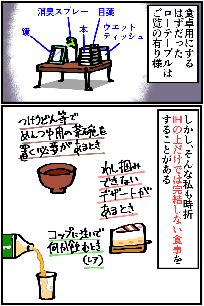 前にも書いたかもしれませんが、コンビニで買った弁当もIHの上に置いて立ち食いします。
