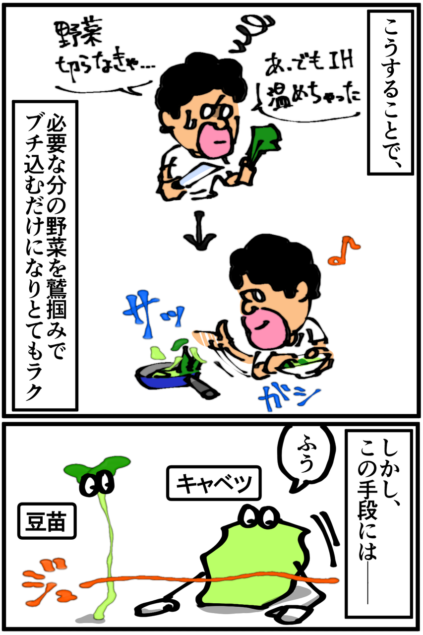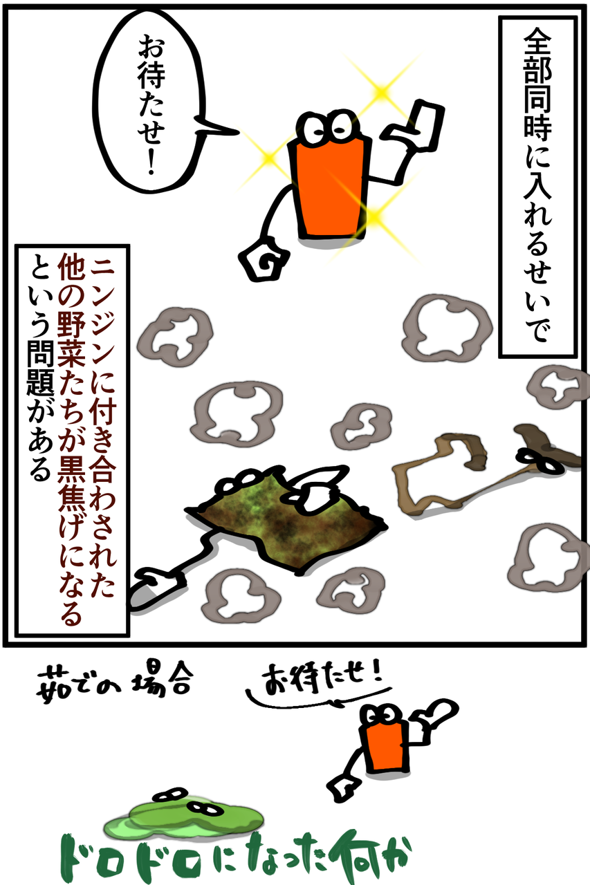 俺の包丁遣いが酷いせいで薄く切れていないのも相まって、ニンジンだけ耐熱加工でもしてあるんじゃないかと思うほど火が通りにくい。