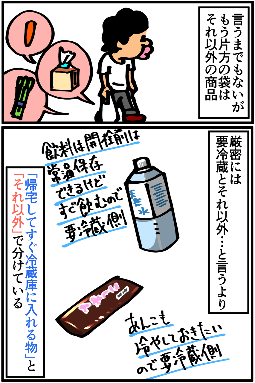 うちには冷凍庫が無いので、「帰宅後すぐ食べるもの=冷蔵庫には入れない物」という認識になるアイスは「それ以外の方」に分けられます。