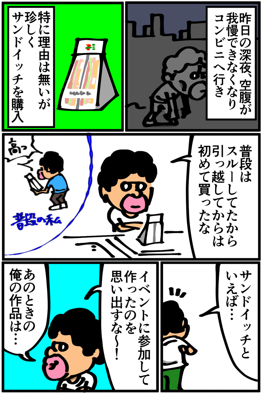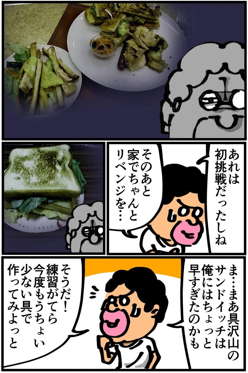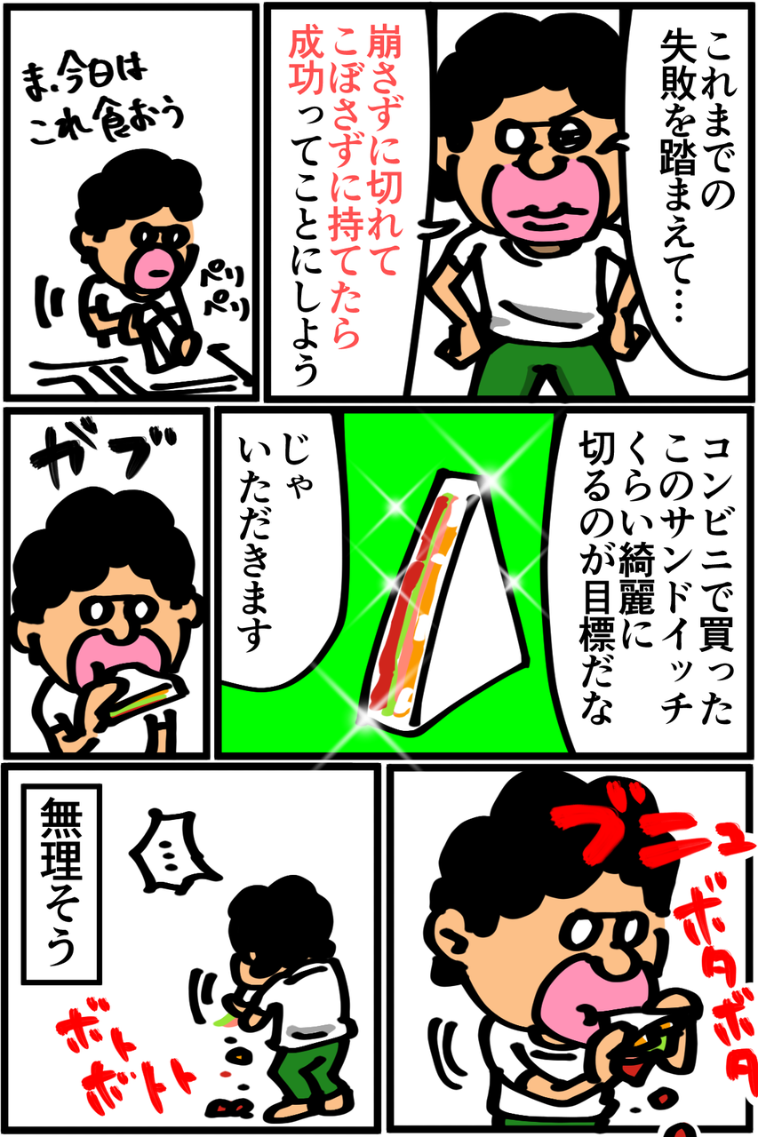 第218話「サンドイッチリベンジの計画を立てる」 2019年08月12日 「これが理想形だな!」とか言いながら具が3分の1くらい床に落ちたので食べ方を改善しないと無理そうです。でも近日中にまたサンドイッチ作りに挑戦しようと思います!以前、イベントに参加した時の様子→自宅でリベンジした時の様子→●Twitterやってます。●登録していただくと更新通知がLINEで届きます↓●Mediassortさんとプレイさせていただいたスマブラ動画第3弾が公開されました! 今回はポケモンバトル回。 「絵日記」カテゴリの最新記事 < 前の記事次の記事 > コメント コメント一覧 (10) 1. あおきんぐ 2019年08月12日 20:47 素サンドイッチなら成功するかもしれませんよ! 0 taikutsu_ken がしました 6. 退屈健 2019年08月14日 22:20 >>1 食パンを重ねて食べてるだけ!笑 0 taikutsu_ken がしました 2. 糸田JIl 2019年08月12日 22:59 なぜ床に落ちるのだ、、。笑 先生の部屋だけ重力おかしいんじゃないすか?笑 0 taikutsu_ken がしました 7. 退屈健 2019年08月14日 22:21 >>2 実は重力が通常より強めに設定されてる可能性はありますね!笑 0 taikutsu_ken がしました 3. オジョギリ 2019年08月12日 23:04 色々な失敗を経験しつつもチャレンジ精神を忘れない先生ェ・・・応援してます! 0 taikutsu_ken がしました 8. 退屈健 2019年08月14日 22:21 >>3 ありがとうございます!成功したためしがないですが常にチャレンジ精神を持って挑んでいきます!笑 0 taikutsu_ken がしました 4. 毒キノコ 2019年08月13日 10:52 鋭角のとこから食べないと… 0 taikutsu_ken がしました 9. 退屈健 2019年08月14日 22:22 >>4 てっぺん?部分から食べてしまいました…笑 0 taikutsu_ken がしました 5. まゆ 2019年08月14日 01:48 いかにサンドイッチ食べ慣れてないかバレちゃいましたね(笑)リベンジ楽しみにしてます! 0 taikutsu_ken がしました 10. 退屈健 2019年08月14日 22:23 >>5 サンドイッチ全然食べないんですよね~;;笑 ありがとうございます、近日中に更新します! 0 taikutsu_ken がしました コメントフォーム 名前 コメント 記事の評価 リセット リセット 顔 星 情報を記憶 コメントを投稿する