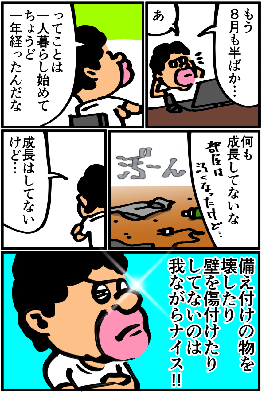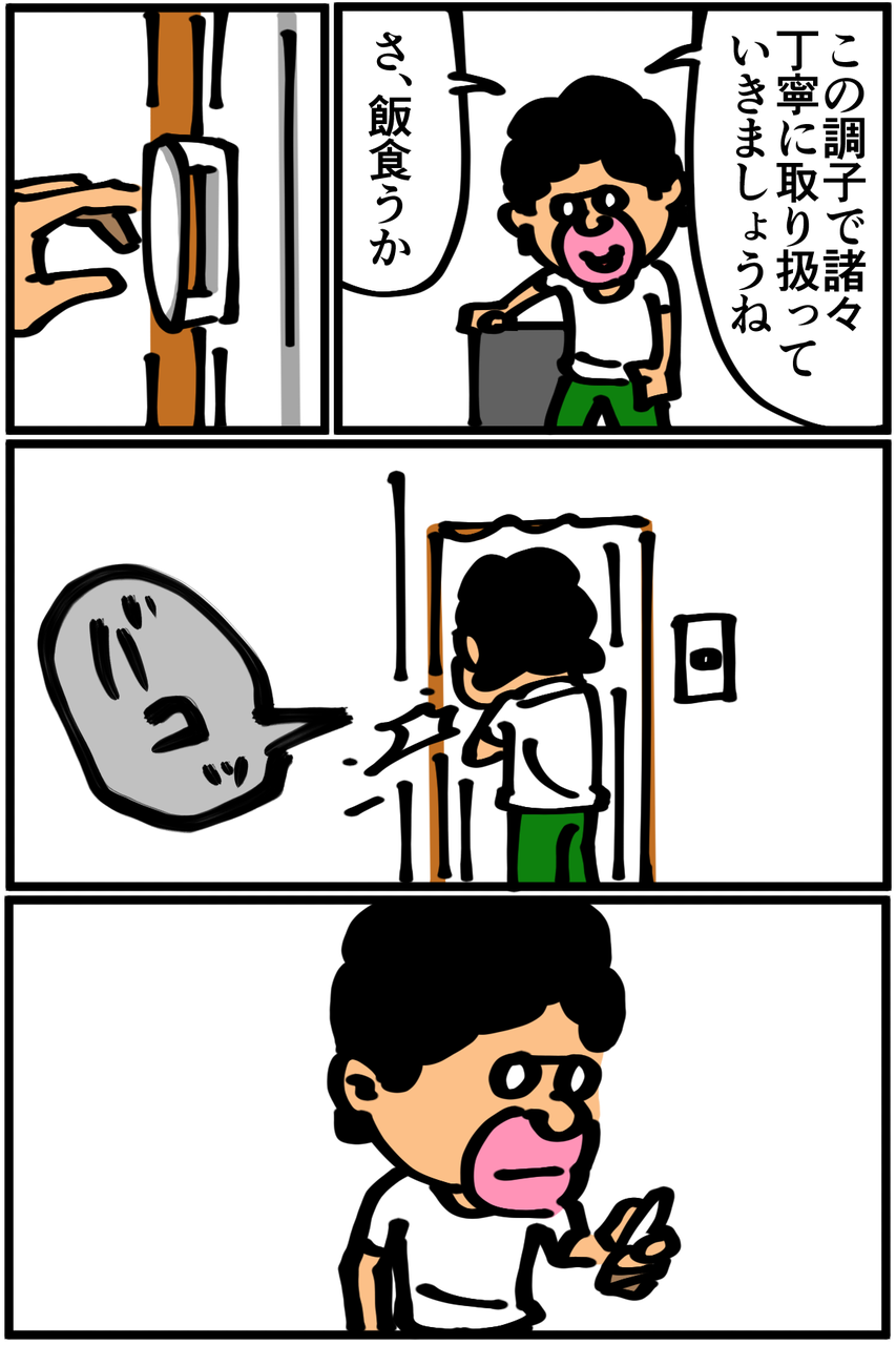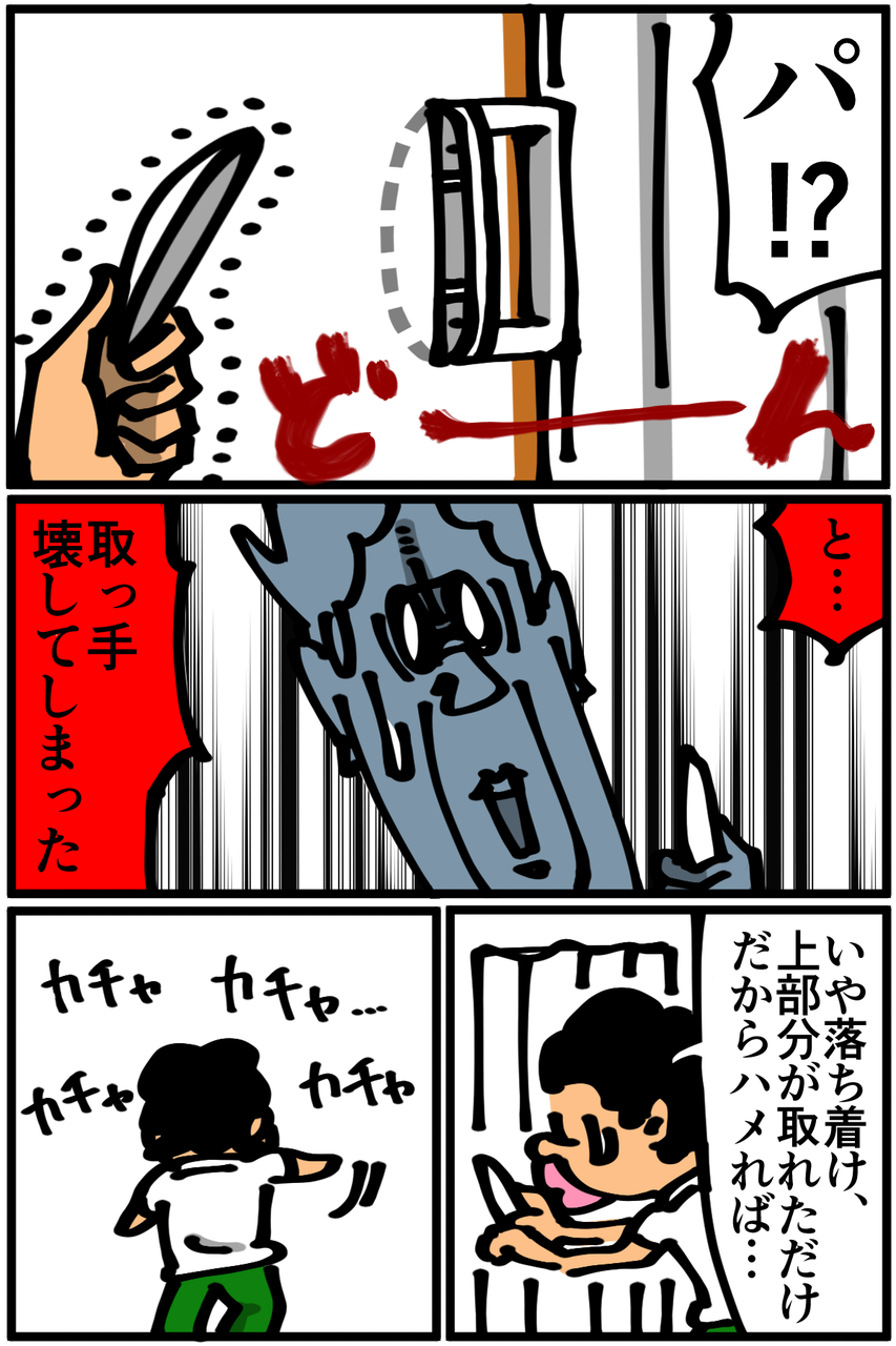 第220話「一人暮らしちょうど一年目に起きた事件」 2019年08月14日 次回 に続きます。●Twitterやってます。●登録していただくと更新通知がLINEで届きます↓●Mediassortさんとプレイさせていただいたスマブラ動画第3弾が公開されました! 今回はポケモンバトル回。 「絵日記」カテゴリの最新記事 < 前の記事次の記事 > コメント コメント一覧 (14) 1. 伝説くん 2019年08月14日 22:00 秘技、アロンアルファ 0 taikutsu_ken がしました 8. 退屈健 2019年08月23日 22:08 >>1 逆におかしな付け方で固めてしまいそうで怖いです!笑 0 taikutsu_ken がしました 2. 糸田JIl 2019年08月14日 22:02 これはやっちまいましたね。笑 とりあえず適当にアロンアルファでくっつけときましょ。笑 0 taikutsu_ken がしました 9. 退屈健 2019年08月23日 22:08 >>2 ついにやっちまいました…笑 0 taikutsu_ken がしました 3. ふーちゃ 2019年08月14日 22:45 アロンアルファを……(便乗) 0 taikutsu_ken がしました 10. 退屈健 2019年08月23日 22:08 >>3 アロンアルファが圧倒的な支持を!笑 0 taikutsu_ken がしました 4. 3210+ 2019年08月15日 01:23 大抵こういうのははめ込み式ですが安く上げるために何箇所か点付けで接着剤でとめてあるだけなんてのもあります。 接着剤の跡とかがあるなら材質に合った物を買ってきて接着しなおすで良いかと。 はめ込み式で留め具が壊れてたら逆に管理の人とか照会先の不動産屋に見せて説明するほうが良いと思います。 下手に素人修理して逆に取っ手どころか扉の交換台請求された(数万円)なんて話を聞いたことが… 0 taikutsu_ken がしました 11. 退屈健 2019年08月23日 22:10 >>4 おおお、そうなんですか!! きちんと見ていないんですが接着剤の跡はなかったように思います…! 結局無理やりハメ直してしまったので扉ごと交換という最悪の事態にならないことを祈ります;; 0 taikutsu_ken がしました 5. と 2019年08月15日 09:05 取っ手を取ってしまったんですね… 0 taikutsu_ken がしました 12. 退屈健 2019年08月23日 22:10 >>5 とっても上手い! 0 taikutsu_ken がしました 6. カナヘビ 2019年08月15日 09:45 経年劣化もありますし賃貸の契約書に減価償却の項目とかで修理費用がかかるかどうか書いてあるはずです。 通常は費用がかからず、勝手に直すと費用請求されるケースが多いですね。 退去時に気づかれないことも多いですが 0 taikutsu_ken がしました 13. 退屈健 2019年08月23日 22:11 >>6 えっ、そうだったんですか! それは恐ろしい…きちんと全文読んでいなかったので改めて目を通しておきます! 0 taikutsu_ken がしました 7. いつも見てます 2019年08月15日 22:01 アラビックヤマトで・・・・(逆らう) 0 taikutsu_ken がしました 14. 退屈健 2019年08月23日 22:12 >>7 俺だけかもですが小学生時代を思い出して懐かしくなるアレですね!笑 0 taikutsu_ken がしました コメントフォーム 名前 コメント 記事の評価 リセット リセット 顔 星 情報を記憶 コメントを投稿する