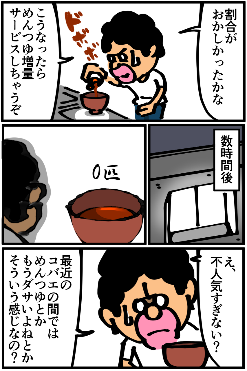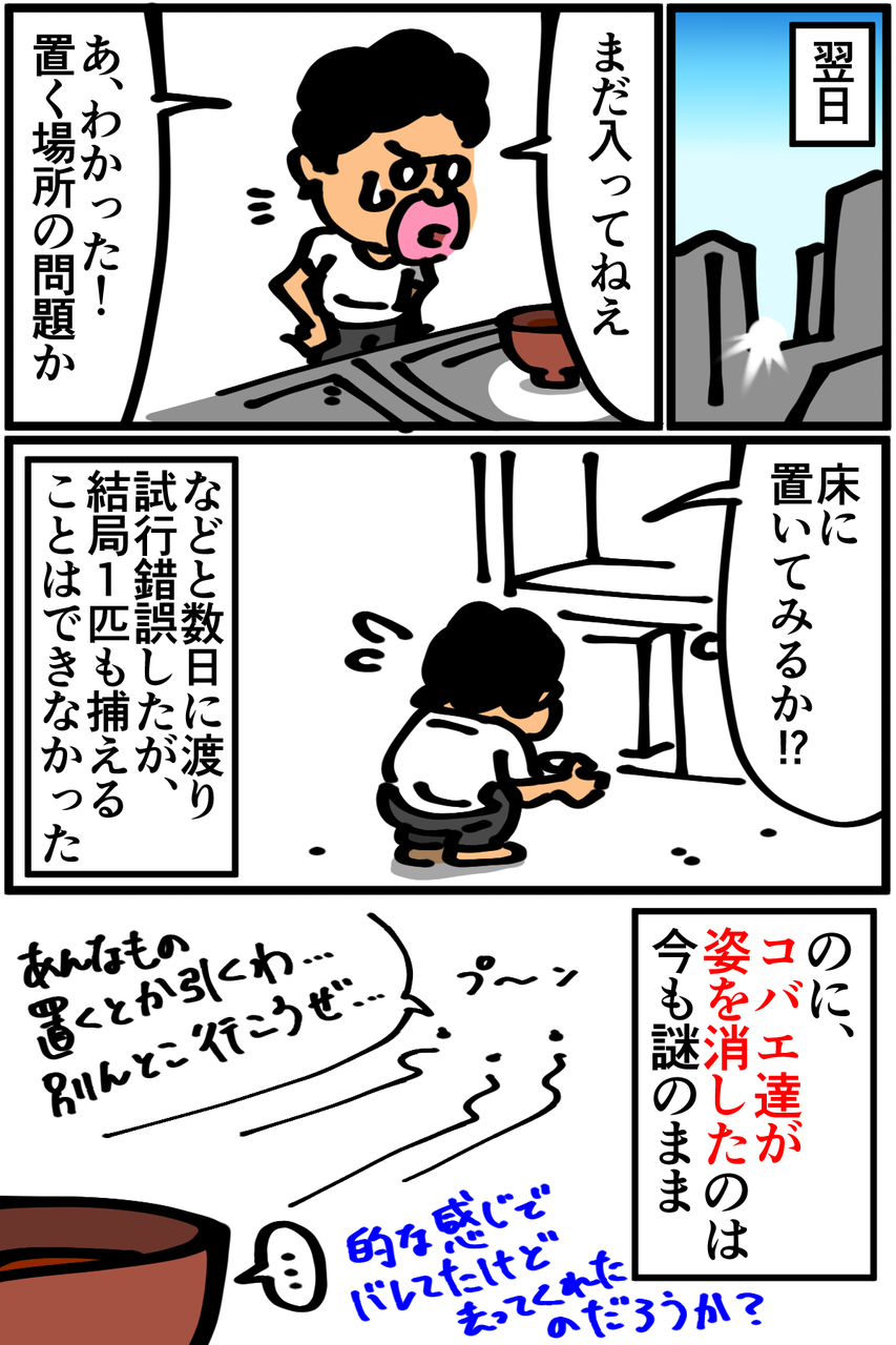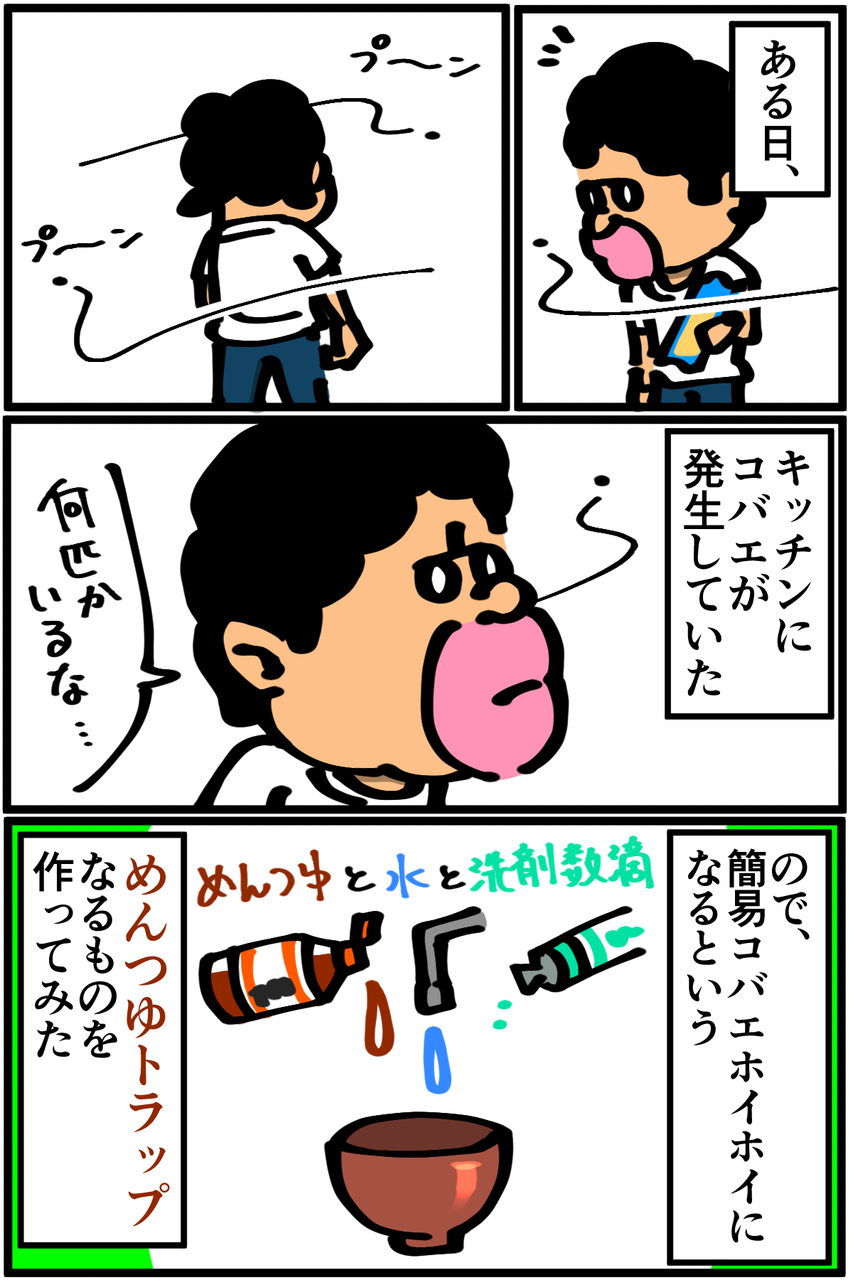第222話「めんつゆトラップを作る」 2019年08月16日 なぜ捕獲できないのかばかりに気を取られてましたが、気付いたらいなくなってました。結果オーライではあるけど何かに負けた気分。●Twitterやってます。●登録していただくと更新通知がLINEで届きます↓●Mediassortさんとプレイさせていただいたスマブラ動画第3弾が公開されました! 今回はポケモンバトル回。 「絵日記」カテゴリの最新記事 < 前の記事次の記事 > コメント コメント一覧 (19) 1. 眠い人 2019年08月16日 20:41 私もめんつゆトラップ作ったけど全然かかりませんでした、お酢もサービスしたのに… 結局コバエホイホイが一番すごい 0 taikutsu_ken がしました 10. 退屈健 2019年08月23日 22:17 >>1 お酢すらもスルーするとは…! やっぱり市販品は偉大ですね! 0 taikutsu_ken がしました 2. コバエ 2019年08月16日 20:43 僕が試した時はちゃんとコバエが中で臨終してたので効果はあったのですが、それ以上にめんつゆの匂いが不快になってきたのでやめました..... 僕は食器用洗剤を使ってましたね、柑橘系の強い香りと麺つゆのダシの香りが悪魔合体します.... 0 taikutsu_ken がしました 11. 退屈健 2019年08月23日 22:19 >>2 確かに、逆にこっちが不快になってギブアップしますね!笑 爽やかな柑橘とめんつゆの香りの合体はかなりキツい…! 0 taikutsu_ken がしました 3. トラップに使われた鰹(本物) 2019年08月16日 20:46 コバエの種類によって好きな物が違うのでハエを見分けないと難しいっすよね どっちにしろ発生源を潰さないとあれだけど しかし居なくなったことを考えると大量の蛆を退屈先生が食べた説濃厚 0 taikutsu_ken がしました 12. 退屈健 2019年08月23日 22:20 >>3 気づかぬうちに蛆をそんな形で処理してたとは! 素パスタに混ざってたけど知らずに全部食べてた可能性はありますね!笑 0 taikutsu_ken がしました 4. ナナシ 2019年08月16日 21:32 白色の器でトラップを作り、光が当たる場所に置くと異常な数のコバエ(赤い目)がかかります! 0 taikutsu_ken がしました 13. 退屈健 2019年08月23日 22:20 >>4 なるほど、光でおびき寄せる方法ですか! そういえばキッチンは薄暗いままだった気がします…! 0 taikutsu_ken がしました 5. 糸田JIl 2019年08月16日 21:43 まぁ結果オーライってことでいいじゃないすか。笑 それより先生の方が引っかかりそうと仰ってましたが大丈夫でしたか?笑 0 taikutsu_ken がしました 14. 退屈健 2019年08月23日 22:21 >>5 「めんつゆ捨ててなかったんだったな、じゃあこれ使い回してうどんでも食うか」みたいなことにならなくてよかったです!笑 0 taikutsu_ken がしました 6. あおきんぐ 2019年08月16日 22:01 その作ったトラップ勿体無いので、うどんかなんか買ってつけて食べれば節約になりますね! 0 taikutsu_ken がしました 15. 退屈健 2019年08月23日 22:22 >>6 洗剤の爽やかな風味が夏にピッタリ!(死去) 0 taikutsu_ken がしました 7. いつも見てます 2019年08月16日 22:45 トラップより先生の殺気にビビッてにげたのでは・・・・ 先生のコバエホイホイの絵を置いとけばより良いのではないでしょうか? 0 taikutsu_ken がしました 16. 退屈健 2019年08月23日 22:22 >>7 まさかそんなところで覇気が使えていたとは…!笑 0 taikutsu_ken がしました 8. チャイ 2019年08月16日 23:41 コバエが増えたってオチかな?と思ったら…。 なんで消えたんでしょう?食べ物ない!って思ったのかな。 0 taikutsu_ken がしました 17. 退屈健 2019年08月23日 22:23 >>8 なるほど、それはありそうですね! 食べ物がないという状況がこんな形で活きるとは!笑 0 taikutsu_ken がしました 9. つるぎ 2019年08月19日 22:48 僕も同じことがありましたが、めんつゆを日本酒に変えると面白いように小バエが死んでました。アルコールに集まるような気がします。酒が少々もったいないですけどね… 0 taikutsu_ken がしました 18. 退屈健 2019年08月23日 22:24 >>9 なるほど!! もしまた発生したら酒を入れて再チャレンジしてみます!と思ったんですが家に酒がありませんでした…笑 0 taikutsu_ken がしました 19. 今更すみません 2025年07月06日 17:18 コバエは沈んで溜まるのでみえなかったのでは! 0 taikutsu_ken がしました コメントフォーム 名前 コメント 記事の評価 リセット リセット 顔 星 情報を記憶 コメントを投稿する