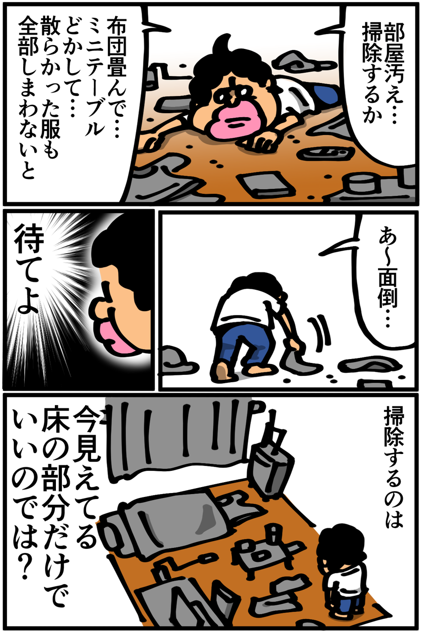 第234話「掃除がしづらくなった部屋」 2019年08月31日 人はそれを汚部屋と呼ぶ。狭い部屋の利点を無理やり見出そうとしている記事↓ ●Twitterやってます。●登録していただくと更新通知がLINEで届きます↓●Mediassortさんとプレイさせていただいたスマブラ動画の第4弾が公開されました!今回は鬼ごっこやったりしてます。 「絵日記」カテゴリの最新記事 < 前の記事次の記事 > コメント コメント一覧 (18) 1. ひょう 2019年08月31日 20:58 俺と全く同じやんけ… 0 taikutsu_ken がしました 10. 退屈健 2019年09月08日 21:19 >>1 あるあるですよね~;;笑 0 taikutsu_ken がしました 2. なめこ 2019年08月31日 21:27 ある意味潔いような。 0 taikutsu_ken がしました 11. 退屈健 2019年09月08日 21:20 >>2 いっそのこと掃除しないという振り切り方にしました!笑 0 taikutsu_ken がしました 3. 名無し 2019年08月31日 21:57 完全に私と同じじゃないですか そのままにしておくと足の踏み場がなくなって、通る所だけ獣道が出来るようになりますよ そして地味にGが出たとき対処に困ります(体験談) 今なら引き返せますよ! 0 taikutsu_ken がしました 12. 退屈健 2019年09月08日 21:20 >>3 た、確かに…! 今この部屋にGに出られたら隠れやすい場所がありすぎて確実に見失いますね!笑 0 taikutsu_ken がしました 4. 物は縦に積み上げる派 2019年08月31日 22:22 光らせちゃだめな電球w この形の電球の漫符の寿命はどれぐらいあるんでしょうか 0 taikutsu_ken がしました 13. 退屈健 2019年09月08日 21:21 >>4 思えば最近はこの形の電球もしばらく見てないですね~φ(..) 0 taikutsu_ken がしました 5. 名無し 2019年08月31日 22:30 布団はまめに畳んだほうがいいですよ! 0 taikutsu_ken がしました 14. 退屈健 2019年09月08日 21:21 >>5 確かに、カビたりしたら大変なことになりますね…! 0 taikutsu_ken がしました 6. 糸田JIl 2019年09月01日 01:30 部屋の片付ける場所を減らすってのは発想が柔軟すぎます!笑 てかキャリーバッグでコケてるの地味に笑いました。笑 0 taikutsu_ken がしました 15. 退屈健 2019年09月08日 21:22 >>6 キャリーバッグ、掃除のとき地味~に邪魔で困ってます!笑 0 taikutsu_ken がしました 7. なおみ 2019年09月01日 07:56 退屈先生のお母様は、先生のお宅に来たりしますか? 息子の部屋が退屈先生んち並みだったらどうしよう… 恐ろしくて抜き打ち訪問などは出来ない笑笑 0 taikutsu_ken がしました 16. 退屈健 2019年09月08日 21:23 >>7 引っ越し当初に何度か来てたんですがここ最近は来てないですね~! おかしな状態になっていないか、抜き打ちでなくとも確認しに行くのはよいことだと思います!笑 0 taikutsu_ken がしました 8. カルピス 2019年09月01日 08:00 あらら。。お部屋がお汚部屋になって底辺だけにていへんだwこりゃ 0 taikutsu_ken がしました 17. 退屈健 2019年09月08日 21:23 >>8 ていへんよくできました! 0 taikutsu_ken がしました 9. チャイ 2019年09月01日 08:24 どんどん部屋散らかる理論が共感すぎてつらいです、、笑笑 関係ないコメントで恐縮ですが、タイムズ紙の表紙、ニョロゾでしたよ〜 0 taikutsu_ken がしました 18. 退屈健 2019年09月08日 21:23 >>9 えっ!ニョロゾがそんなところで華々しい活躍をしていたとは!!笑 0 taikutsu_ken がしました コメントフォーム 名前 コメント 記事の評価 リセット リセット 顔 星 情報を記憶 コメントを投稿する