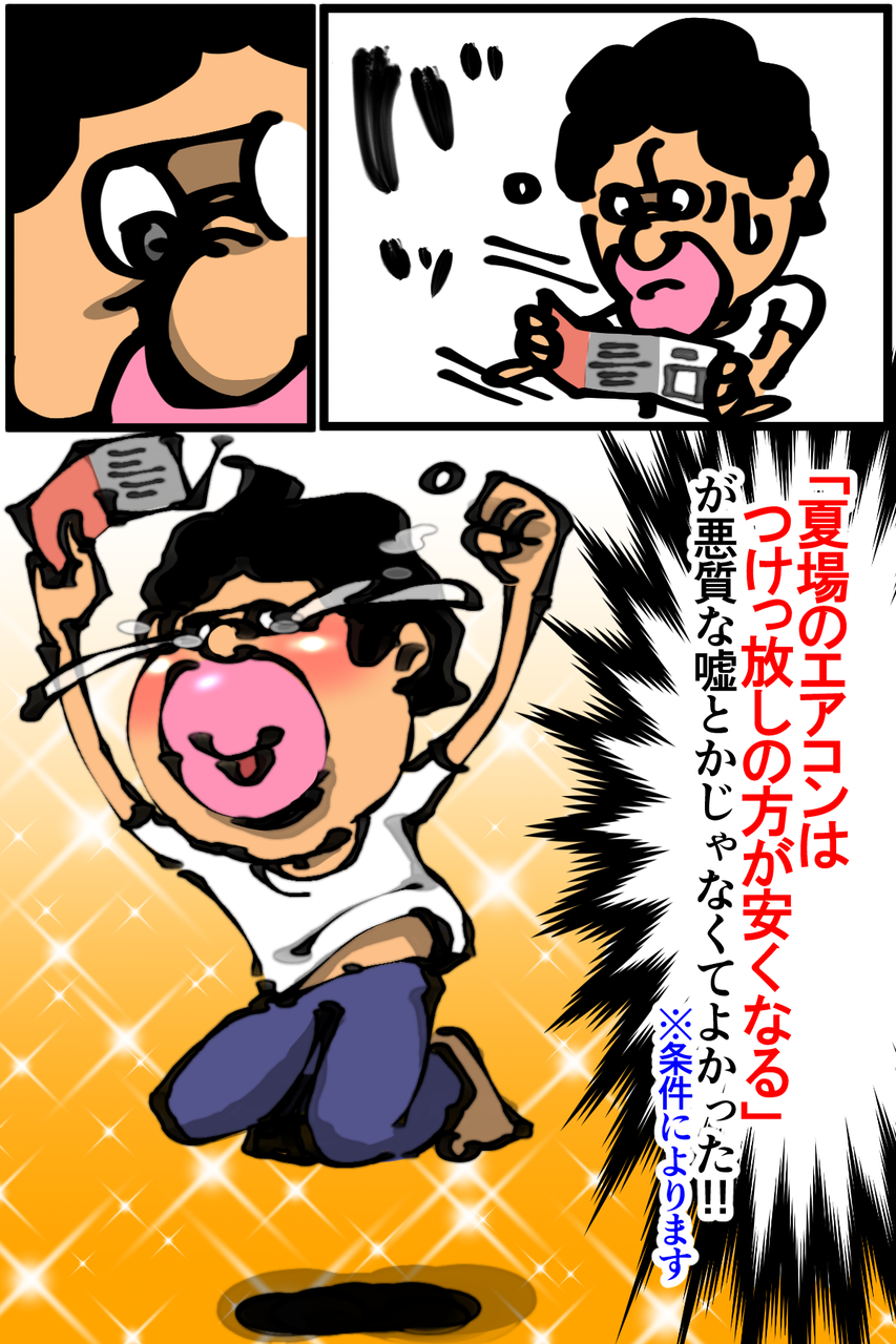 エアコンのつけっぱは結構真実ですね、去年の秋から温度差に弱いペットがいるので今年はつけっぱなしにしましたが、去年夏のつけたり消したりするよりも断然安くなりました٩(ˊᗜˋ*)وヤッタネ!