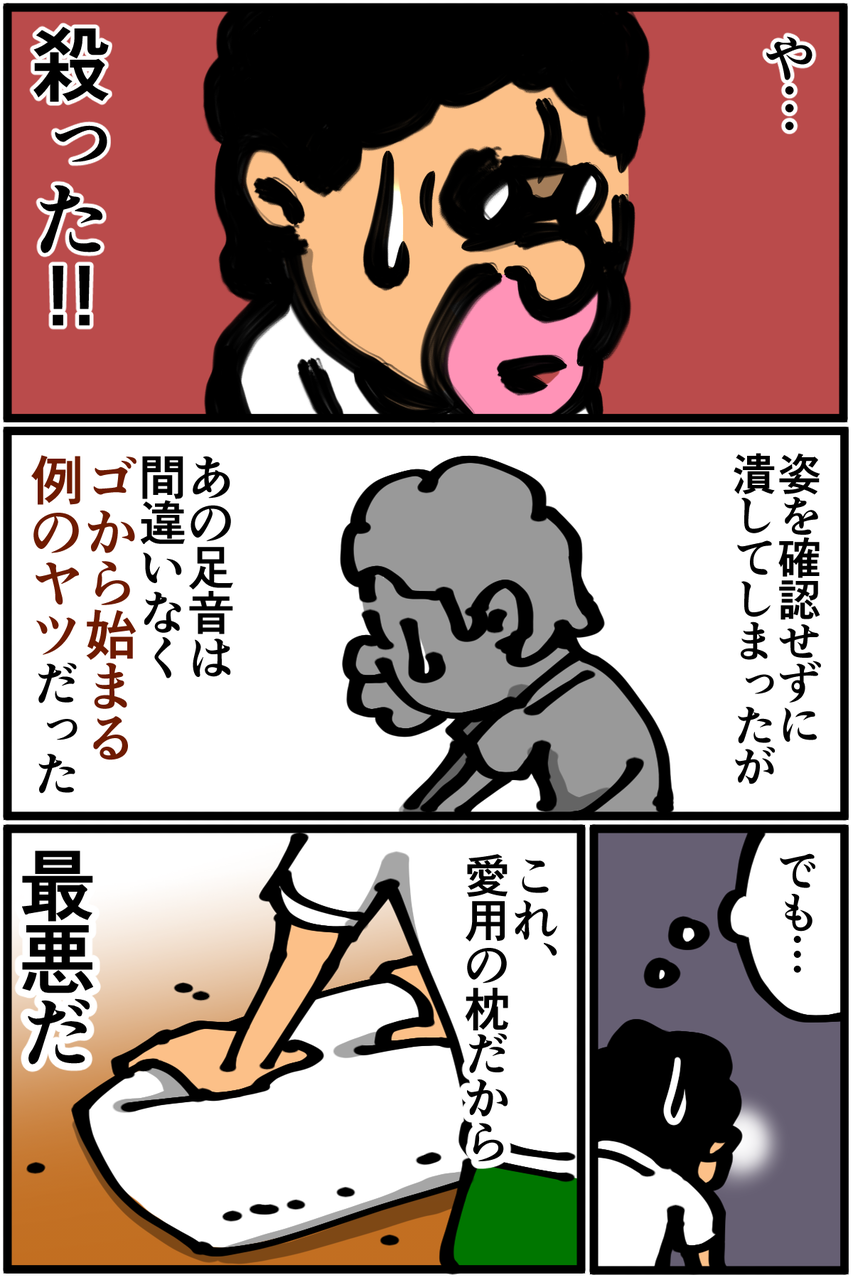 第256話「背後で聞こえたカサカサ音」 2019年10月01日 俺にしてはなかなか良い振り向きダイビング枕アタックだと思ったんですが人違いでした。というか例のヤツじゃなかったのはよかったけど、床にお菓子の袋を放置してるような部屋だと本当に遭遇するのも時間の問題な気もします。●Twitterやってます。●登録していただくと更新通知がLINEで届きます↓●Mediassortさんとプレイさせていただいたスマブラ動画の第4弾が公開されました!今回は鬼ごっこやったりしてます。 「絵日記」カテゴリの最新記事 < 前の記事次の記事 > コメント コメント一覧 (22) 1. じ 2019年10月01日 21:21 Gにダイビング枕アタックってマジ勇者 0 taikutsu_ken がしました 12. 退屈健 2019年10月05日 00:38 >>1 死角に逃げられてしまう恐怖感が僅かに勝りました…!笑 0 taikutsu_ken がしました 2. なめこ 2019年10月01日 21:25 枕で潰したら毎晩Gの夢見るはめになるかもですよ😱 ちなみに先生はトランクス派なんですか? 0 taikutsu_ken がしました 13. 退屈健 2019年10月05日 00:39 >>2 それは地獄ですね!笑 わかりづらくてすみません、干しているのはハーフパンツです!が、パンツはトランクス派ですよ~!笑 0 taikutsu_ken がしました 3. かっとびランサー 2019年10月01日 21:50 枕取ってから潰すまでの躍動感の凄さ 0 taikutsu_ken がしました 14. 退屈健 2019年10月05日 00:39 >>3 盛って描いておりますが実際はもっと鈍臭かったと思います!笑 0 taikutsu_ken がしました 4. 糸田Jll 2019年10月01日 22:00 咄嗟とはいえ良くもまぁゴッキーダイブできましたね。笑 私なら振り返ることなく外に逃げ出します。笑 0 taikutsu_ken がしました 15. 退屈健 2019年10月05日 00:40 >>4 死角に逃げられてしまう恐怖感が僅かに勝りました…!笑 0 taikutsu_ken がしました 5. あおきんぐ 2019年10月01日 22:00 ゴから始まる例のやつ ゴミ 0 taikutsu_ken がしました 16. 退屈健 2019年10月05日 00:40 >>5 ゴミなのである意味正解でしたね!笑 0 taikutsu_ken がしました 6. みどり 2019年10月01日 22:20 6コマ目、超カッコイイ。 やられる前にやるタイプなんですね。 0 taikutsu_ken がしました 17. 退屈健 2019年10月05日 00:41 >>6 基本超絶チキンなんですが、死角に逃げられてしまってその空間で暮らすという事態がイヤすぎて…!笑 0 taikutsu_ken がしました 7. H.1 2019年10月01日 22:22 その反応出来るの羨ましい! 私は固まります。 か、 警察沙汰レベルの悲鳴が出ます。 0 taikutsu_ken がしました 18. 退屈健 2019年10月05日 00:42 >>7 俺も基本は超絶チキンなんですが、死角に逃げられてその空間で暮らすという事態になるのがイヤすぎて…!笑 0 taikutsu_ken がしました 8. 名無し 2019年10月01日 22:55 漫画とかではよく「カサカサ」って擬音用いられますけど実際は何も音しませんよね~ 0 taikutsu_ken がしました 11. もぐら 2019年10月03日 16:45 >>8 物の上を這いずる時に音が発生するんや。ドアを開けたときに慌ただしくガサガサ動き回ってる音もすれば消灯後にどこからかカサカサ…ってかすかに移動する音が部屋に響くんだよ… 部屋でお菓子を食べない、紙類やダンボールを溜め込まないようにすることが大事やで 0 taikutsu_ken がしました 19. 退屈健 2019年10月05日 00:42 >>8 確かに、床を歩くだけではカサカサならなさそうですね!笑 0 taikutsu_ken がしました 9. ぷょ子 2019年10月01日 23:48 枕じゃ絶対仕留められないww 私はデカめの蜘蛛・Gの場合は掃除機で吸い込み派です… 会社の掃除中(1人時)にヤモリが出た時は本当に困ったので、是非今度撃退方法(枕以外)を教えてください( ´•ω•` ) 0 taikutsu_ken がしました 20. 退屈健 2019年10月05日 00:43 >>9 なるほど、掃除機で…!これは壊れたハンドクリーナーの復活が望まれますね!笑 ヤモリ…難しい!うまく誘導して逃げてもらうとかでしょうか…!笑 0 taikutsu_ken がしました 10. 2019年10月02日 12:43 豆菓子食べてる先生かわいい なんだかんだでGには洗剤が効きますよ 0 taikutsu_ken がしました 21. 退屈健 2019年10月05日 00:43 >>10 洗剤いいらしいですね~!ただ、ノロマな俺がそれをぶっかける段階に持っていけるかどうか…!笑 0 taikutsu_ken がしました 22. 退屈_mania 2023年08月31日 11:58 ゴから始まる例のやつじゃなくて、ちゃんとゴキブリって言え!彼にも名前があるんだ!ゴキブリ!ゴキブリ!癶(:゚;益;゚:;癶)癶癶癶(癶;゚ω゚;)癶 癶シュー(`・ω・´)r鹵꒱꒱꒱꒱꒱꒱꒱꒱꒱꒱꒱꒱┌(・ ω ・ ┐┐)┐カサカサカサ 癶( 癶;:゚;益;゚;)癶🪳 0 taikutsu_ken がしました コメントフォーム 名前 コメント 記事の評価 リセット リセット 顔 星 情報を記憶 コメントを投稿する