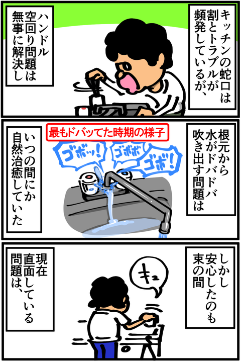 第187話「トラブル続きのキッチンの蛇口」 2019年07月06日 何か一つ状態異常がないといけない性質なんでしょうか。●Twitterやってます。●登録していただくと更新通知がLINEで届きます↓●旧ブログで描いていた漫画「ニート脱却ファイタータクマくん」をMeddiasortさん制作でYoutubeアニメにしていただきました。第2話公開されました ... 2019年07月06日 続きを読む