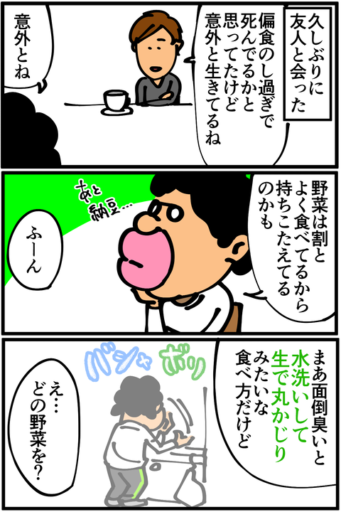 第322話「ブロッコリーでクリスマスツリーを作る・後編」 2019年12月17日 前回の記事 の続きです。つい数日前に描いた水道水云々の記事とほぼ同じ汚え終わり方。箸かフォークか使えボケと思うかもしれませんが、ブロッコリーをいい感じで持てて食べることができたのでミニトマトとアボカドもそのノリで手づかみで食べることにしました。ノリで、と言 ... 2019年12月17日 続きを読む