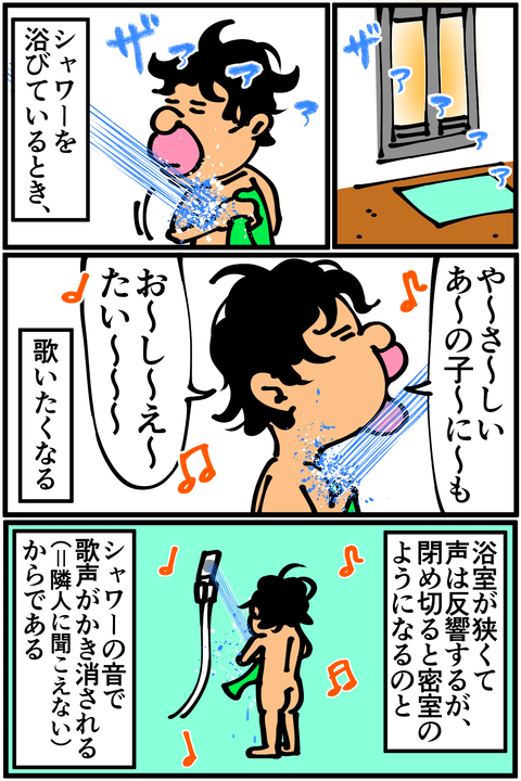 第378話「浴室ヒトカラ」 2020年02月21日 歌ってる最中にどなたかが通ったかは定かではないですが、浴槽が外廊下側の壁際にあるのでめちゃくちゃ漏れてたと思う。でも、 スピッツの「優しいあの子」は名曲ですね。●Twitterやってます。●登録していただくと更新通知がLINEで届きます↓ ... 2020年02月21日 続きを読む