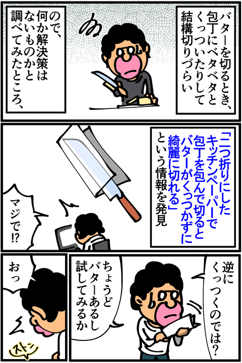 第385話「バターを綺麗に切る方法」 2020年02月29日 正しい切り方を見たらバターは押さえずに左手でキッチンペーパーを固定してスムーズに切っていたので、ただ単に俺が不器用すぎるというのが原因です。というかもし俺の腕の数が増えてもその分失敗が増えるだけな気もする。●Twitterやってます。●登録していただくと更新通知 ... 2020年02月29日 続きを読む