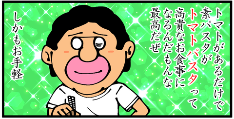 第804話「私が作るトマトパスタ」 2021年07月31日 安アパートでカツカツな生活を送る男の漫画ブログです。金が底を尽きてくたばるようなことがなければ毎日更新します。半分に切ったトマトを粉末だしで味付けしたパスタに乗っけて完成!ちなみにいつもはフライパンから食べているのでこれは皿に盛っているだけまだマシです。 ... 2021年07月31日 続きを読む