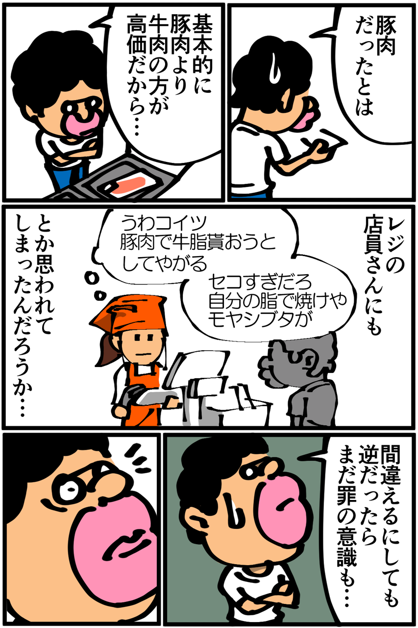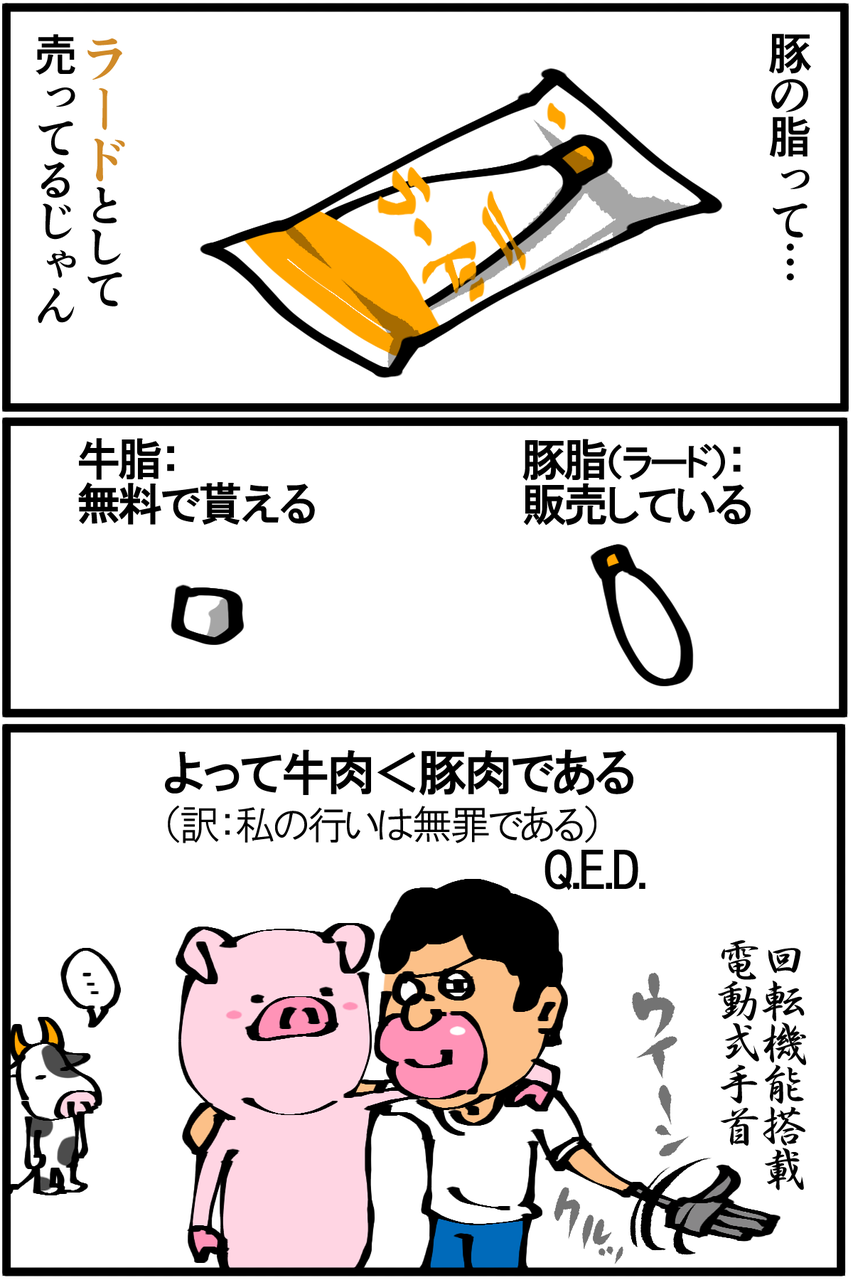 ちなみにこの後、「肉屋で働いてますがたまに豚肉を購入されて牛脂をお持ち帰りになるお客様もいます」みたいな意見を見てまた手首返してました。