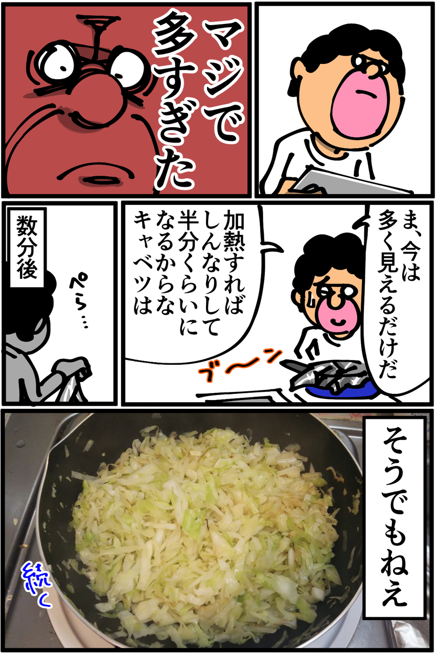 第302話「巣ごもり卵を作る・前編」 2019年11月24日 前後編に分けるような内容の記事でもないんですが続きます。次回→ ●Twitterやってます。●登録していただくと更新通知がLINEで届きます↓ 「絵日記」カテゴリの最新記事 「料理」カテゴリの最新記事 < 前の記事次の記事 > コメント コメント一覧 (15) 1. あおきんぐ 2019年11月24日 21:09 それに小麦粉と水を足してお好み焼きにするのはいかがでしょうか?w 0 taikutsu_ken がしました 9. 退屈健 2019年12月07日 13:23 >>1 あっ!そうすべきでした!笑 0 taikutsu_ken がしました 2. なめこ 2019年11月24日 21:40 もしや毎回野菜押さえずに切ってます? そりゃ散らばりますって😓 0 taikutsu_ken がしました 10. 退屈健 2019年12月07日 13:24 >>2 一応、実際は抑えて切ってます!が、ヘタすぎて散らばってます…笑 0 taikutsu_ken がしました 3. 昼寝部 2019年11月24日 22:01 いっそ、可変して広島焼きを作るか 0 taikutsu_ken がしました 11. 退屈健 2019年12月07日 13:24 >>3 それが最善策でした!笑 0 taikutsu_ken がしました 4. 糸田Jll 2019年11月24日 22:48 先生のレベルになると包丁に手すら添えないんですね。笑 てか、1人暮らしなのにキャベツ丸々は無理があります。笑 0 taikutsu_ken がしました 12. 退屈健 2019年12月07日 13:24 >>4 刻んだら余計にとんでもない量になりました!笑 0 taikutsu_ken がしました 5. ぽぽ 2019年11月25日 03:04 真ん中の目玉焼きに失敗して、 結局キャベツと混ぜ炒めたと予想 m9(。・`ω´・。) 0 taikutsu_ken がしました 7. なめこ 2019年11月25日 23:09 >>5 当たりましたわねぇ(笑) 0 taikutsu_ken がしました 8. ぽぽ 2019年11月26日 08:14 >>7 ねぇ(笑) 0 taikutsu_ken がしました 13. 退屈健 2019年12月07日 13:25 >>5 ご名答!!笑 0 taikutsu_ken がしました 6. かまたま 2019年11月25日 21:22 巣ごもり過ぎて卵迷子になりそうな予感 0 taikutsu_ken がしました 14. 退屈健 2019年12月07日 13:25 >>6 とんでもない豪邸になりました…笑 0 taikutsu_ken がしました 15. すな 2023年10月02日 06:15 巣がデカ過ぎる😂 0 taikutsu_ken がしました コメントフォーム 名前 コメント 記事の評価 リセット リセット 顔 星 情報を記憶 コメントを投稿する