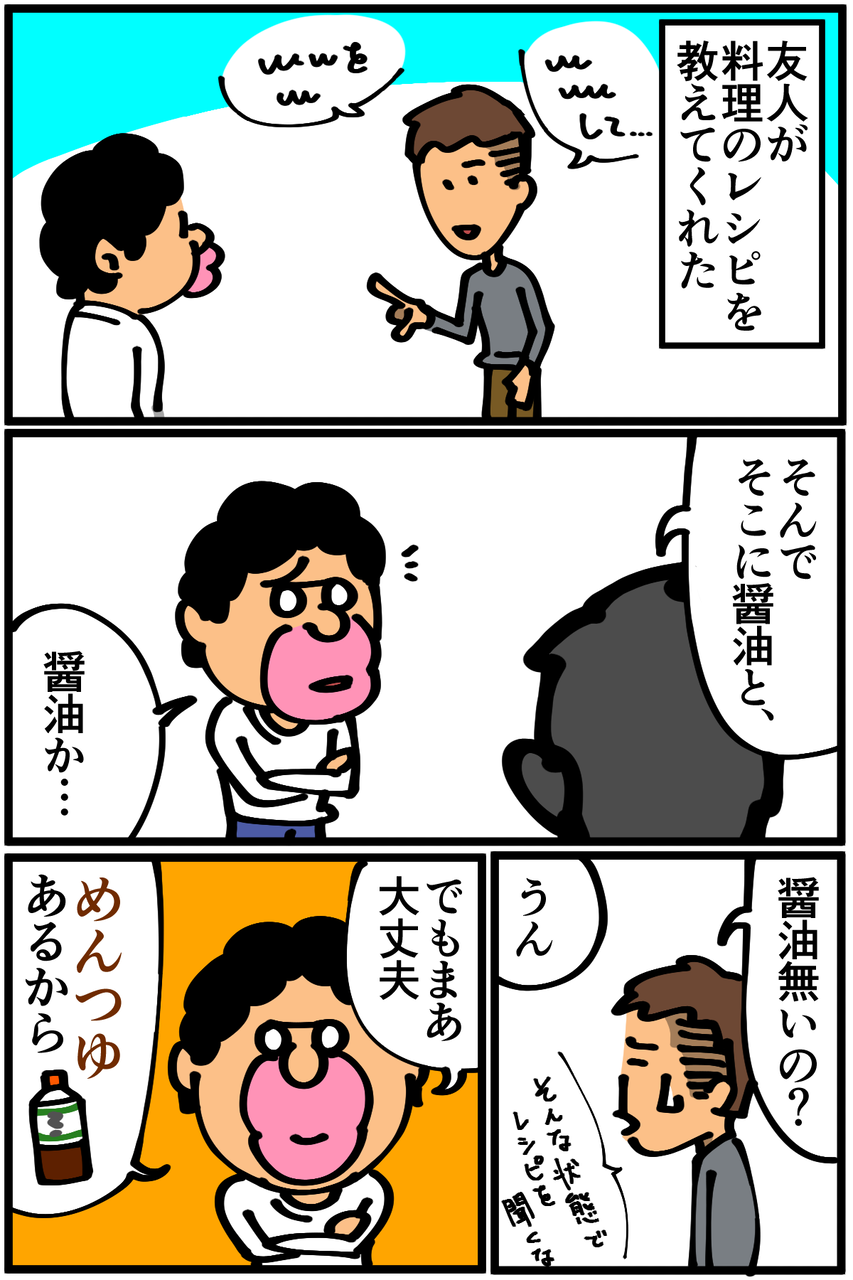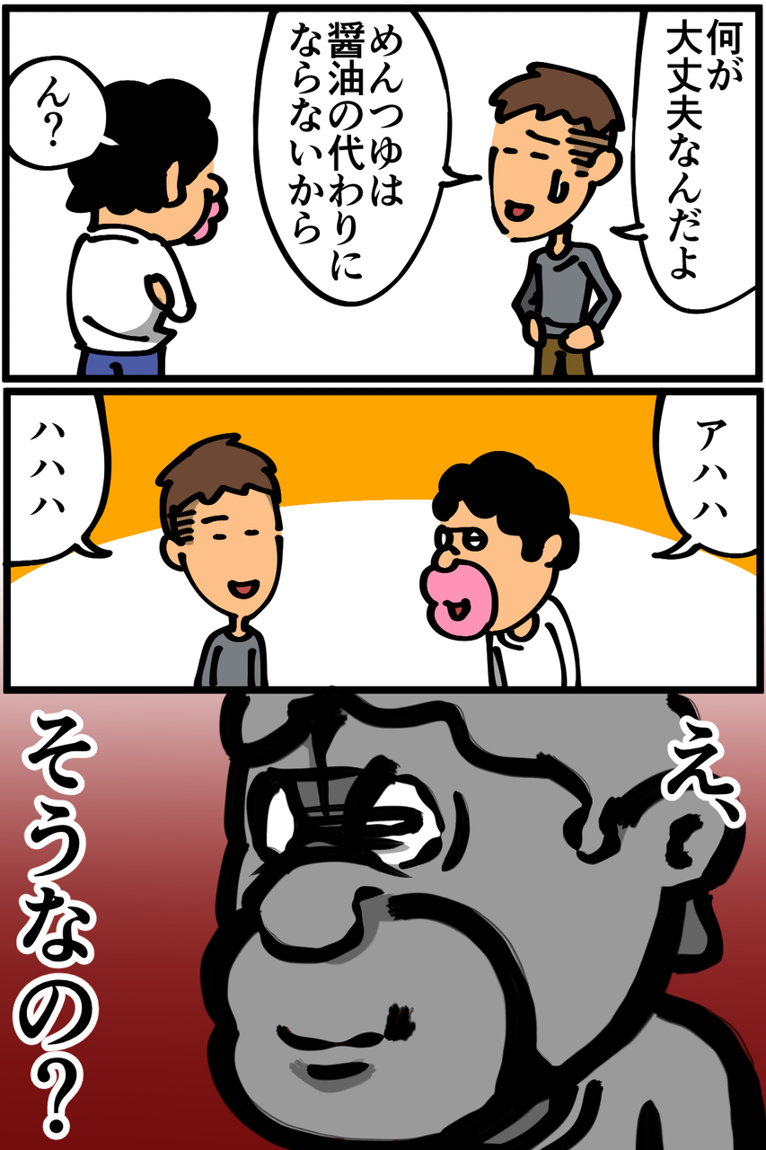 第311話「醤油とめんつゆ」 2019年12月04日 知らなかった。似たような色しててどっちもしょっぱいから代用できると思ってました。そして醤油に関しては、無いというよりとある事情があるのでそれに関しては次回描こうと思います。●Twitterやってます。●登録していただくと更新通知がLINEで届きます↓ 「絵日記」カテゴリの最新記事 < 前の記事次の記事 > コメント コメント一覧 (30) 1. まつ 2019年12月04日 20:46 まあ、麺つゆも出汁醤油も同じようなもんっすよ 麺つゆがあれば大体なんとかなる 0 taikutsu_ken がしました 16. 退屈健 2019年12月07日 14:17 >>1 めんつゆの万能感はやばいですね! 0 taikutsu_ken がしました 2. なめこ 2019年12月04日 20:46 え、知らなかったの⁉️ 0 taikutsu_ken がしました 17. 退屈健 2019年12月07日 14:17 >>2 し、知りませんでした…!笑 0 taikutsu_ken がしました 3. ななし 2019年12月04日 21:21 先生の家計的に厳しいかもしれませんが、今後も色々と料理にトライするのであればまずは「レシピ通りの材料で作る」をきちんとこなしていくことをした方がいいような…? 何かで代用するっていうのは基礎あって初めてできる応用編なので 0 taikutsu_ken がしました 18. 退屈健 2019年12月07日 14:18 >>3 おかしなことをせずにまずはレシピに沿って作るべきですね…! と言いつつ写真を撮りだめている分の謎料理記事を更新してしまうと思うのでご了承を…!笑 0 taikutsu_ken がしました 4. ( °_° ) 2019年12月04日 21:30 麺つゆはちょっと甘みが強いですね… 醤油は万能ですよ 0 taikutsu_ken がしました 19. 退屈健 2019年12月07日 14:18 >>4 確かにちょっと甘めですね~! 0 taikutsu_ken がしました 5. ポプラ 2019年12月04日 21:35 なんで麺つゆがあって醤油がないんすか 0 taikutsu_ken がしました 20. 退屈健 2019年12月07日 14:18 >>5 実はあるんですが使えなくて…!笑 0 taikutsu_ken がしました 6. 1204 2019年12月04日 21:38 醤油がない理由 なんやろ 大豆アレルギー 0 taikutsu_ken がしました 21. 退屈健 2019年12月07日 14:19 >>6 大豆アレルギーではないですね~! 0 taikutsu_ken がしました 7. あらあら 2019年12月04日 21:43 これは醤油の高度なステマ 0 taikutsu_ken がしました 22. 退屈健 2019年12月07日 14:19 >>7 醤油最高皆買おう!!(ダイマ) 0 taikutsu_ken がしました 8. dfsa 2019年12月04日 21:46 醤油がない理由が気になる 0 taikutsu_ken がしました 23. 退屈健 2019年12月07日 14:19 >>8 理由は後日更新いたします!笑 0 taikutsu_ken がしました 9. 糸田Jll 2019年12月04日 21:50 なんかその調子だと料理のさしすせそすら知らなそうっすね。笑 まぁチャレンジ料理を作って食べるのが先生のいい所なので無理に覚える必要はそこまで無いと思うんですけどね。笑 0 taikutsu_ken がしました 24. 退屈健 2019年12月07日 14:21 >>9 さしすせそ、未だに揃っておりません…!笑 いつかきちんとした料理を作りたいところですね~! 0 taikutsu_ken がしました 10. みり子 2019年12月04日 21:50 お弁当とかに付いてる小さい袋醤油を集めて使ってるとか…?^^; 0 taikutsu_ken がしました 25. 退屈健 2019年12月07日 14:21 >>10 どうですかね~!笑 0 taikutsu_ken がしました 11. 初投稿です 2019年12月04日 21:54 僕は刺し身も卵かけご飯もめんつゆです。いけるいける。 0 taikutsu_ken がしました 26. 退屈健 2019年12月07日 14:21 >>11 確かに刺身にめんつゆも合いそうですね! 0 taikutsu_ken がしました 12. ティン 2019年12月04日 23:02 めんつゆ万能っすよね~~~~~~^^ あと焼肉のたれ^^ツートップ^^ 0 taikutsu_ken がしました 27. 退屈健 2019年12月07日 14:22 >>12 焼き肉のたれも最強ですね!初期に買ってすぐ使い切っちゃいました…笑 0 taikutsu_ken がしました 13. ぷょ子 2019年12月05日 12:10 めんつゆから醤油は作れないけど、醤油+みりん+出汁顆粒+水でめんつゆ作れますよーヽ(´▽`)ノ 0 taikutsu_ken がしました 28. 退屈健 2019年12月07日 14:23 >>13 おお、自家製めんつゆ良いですね! 0 taikutsu_ken がしました 14. kyakya 2019年12月05日 13:03 そぅそ。 他の方も書かれてるけど 逆に、醤油あればめんつゆ作れますよ😅 0 taikutsu_ken がしました 29. 退屈健 2019年12月07日 14:23 >>14 自家製めんつゆいつか作ってみます~! 0 taikutsu_ken がしました 15. mohishi 2019年12月05日 21:52 醤油は使い切れずに不味くなるからとか? 酸化したり蒸発?して味が濃くなったり香りがなくなったりしますよね〜 私も一人暮らしの時はコスパ重視でデカイ醤油買って美味しい期間に使い切れず、クソまずい醤油を使い続けて醤油嫌いになってましたw 今は真空になるタイプもあるし、家族が増えて使う機会増えて使いきれるように! 麺つゆ使うと同じ味になりがちですけど、醤油は色々に変化出来るから今は麺つゆのが使う機会が減ってきました〜 でもやっぱり一人暮らしには麺つゆ最強ですけどね! 0 taikutsu_ken がしました 30. 退屈健 2019年12月07日 14:24 >>15 おおお、やっぱり酸化したりするとまずくなってしまうんですね…! 真空パックの醤油いいですよね! 俺はズボラなので今のところめんつゆで完結させちゃうことが多いですね~;;笑 0 taikutsu_ken がしました コメントフォーム 名前 コメント 記事の評価 リセット