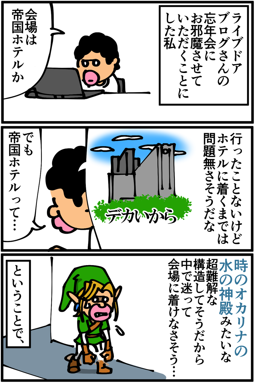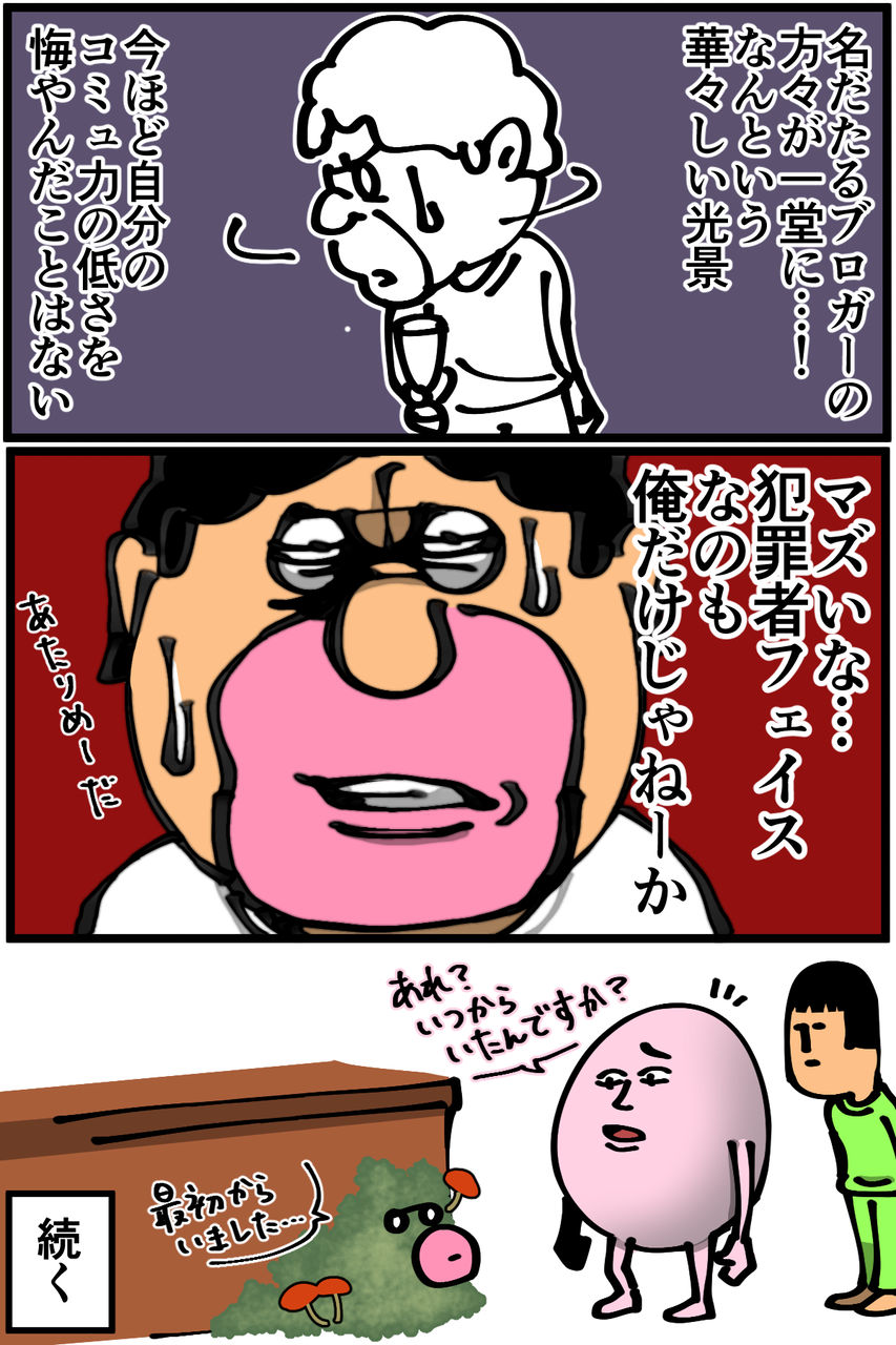 第323話「ライブドアブログさんの忘年会に参加してきた・前編」 2019年12月18日 再現度が低すぎて一体どのブロガーさんを描いたのかわからないという問題が発生していますが念のため補足しておくと、ブロガーさんの服装や会話されている様子は実際とは大きく異なります。俺が端っこの方でカビになってたのだけ本当です。リンクなどきちんと貼っていなくて申し訳ございません!忘年会記事の最後にまとめて貼らせていただきます。次回に続きます。次回→ ●Twitterやってます。●登録していただくと更新通知がLINEで届きます↓ 「絵日記」カテゴリの最新記事 < 前の記事次の記事 > コメント コメント一覧 (47) 1. なめこ 2019年12月18日 22:04 氷のモアイ? 0 taikutsu_ken がしました 24. 退屈健 2019年12月25日 16:43 >>1 ツリーのつもりがモアイに!笑 0 taikutsu_ken がしました 2. なめこ 2019年12月18日 22:06 緑の人かわいい(´・∀・) 0 taikutsu_ken がしました 25. 退屈健 2019年12月25日 16:44 >>2 緑の人!何名かいらっしゃるのですがどなたでしょうか…!笑 0 taikutsu_ken がしました 46. なめこ 2019年12月25日 19:26 >>25 にわとりの上の方です。 0 taikutsu_ken がしました 3. 砂糖 2019年12月18日 22:06 そういえばつぶガンで退屈先生を見つけて、そこからTwitterまで追っかけてきたんだったなぁ… 0 taikutsu_ken がしました 26. 退屈健 2019年12月25日 16:44 >>3 ありがとうございます、嬉しい限りです!;; 0 taikutsu_ken がしました 4. 名無し 2019年12月18日 22:11 風船はだれだろ? 0 taikutsu_ken がしました 27. 退屈健 2019年12月25日 16:44 >>4 七野ワビせんさんです~! 0 taikutsu_ken がしました 5. 2019年12月18日 22:18 色んな人がいますね~(*´﹀`*) 全員分からないですが 0 taikutsu_ken がしました 28. 退屈健 2019年12月25日 16:44 >>5 錚々たる顔ぶれに委縮しっぱなしでした! 0 taikutsu_ken がしました 6. チャイ 2019年12月18日 22:20 退屈先生イケメンだから声かけられにくいかもしれないですね! 0 taikutsu_ken がしました 29. 退屈健 2019年12月25日 16:45 >>6 まさかのイケメン説! ただの地味顔です!笑 0 taikutsu_ken がしました 7. 糸田Jll 2019年12月18日 22:23 せっかくなんですし写真くらい載せても良かったんじゃないですか?笑 もしくは頑張って1から全部描いてみるとか。笑 0 taikutsu_ken がしました 30. 退屈健 2019年12月25日 16:45 >>7 1から全部描くのは危険すぎますね!笑 写真は次記事で少し載せてみました~! 0 taikutsu_ken がしました 8. dd 2019年12月18日 22:25 ブロガーさん達のイラスト、ご本人達が描いているイラストそのものですね、凄い✨😊 0 taikutsu_ken がしました 31. 退屈健 2019年12月25日 16:46 >>8 本当ですか、ありがとうございます! 全然上手く描けなくて…!笑 0 taikutsu_ken がしました 9. 伝説くん 2019年12月18日 22:34 水の神殿は草 0 taikutsu_ken がしました 32. 退屈健 2019年12月25日 16:46 >>9 水位を上げたり下げたりする構造でなくてよかったです!笑 0 taikutsu_ken がしました 10. あやめ 2019年12月18日 22:56 いやいや、結構ちゃんと再現されてるのではないですか?普段読んでいる絵日記ブロガーさんに関しては「あ、あの人だ」ってイラストで分かりますよ。 0 taikutsu_ken がしました 33. 退屈健 2019年12月25日 16:46 >>10 おお、本当ですか!それはなによりです~!! 0 taikutsu_ken がしました 11. 孝 2019年12月18日 22:56 他のブロガーの人たちの再現度が(退屈先生風の絵柄のままなのに)高くてすごい やっぱ二次創作マンガが上手い人は少ない描写で特徴とらえるのうまいのかな 0 taikutsu_ken がしました 34. 退屈健 2019年12月25日 16:47 >>11 おお、本当ですか! 全然上手く描けなくて申し訳ない限りなんですがそう言っていただけてなによりです! 0 taikutsu_ken がしました 12. 1217 2019年12月18日 23:04 他の人の漫画読まないから分からん 0 taikutsu_ken がしました 35. 退屈健 2019年12月25日 16:47 >>12 皆様のブログ面白いので是非! 0 taikutsu_ken がしました 13. 昼寝部 2019年12月18日 23:11 素朴な疑問:公式じゃなくても参加できるのね。 0 taikutsu_ken がしました 36. 退屈健 2019年12月25日 16:48 >>13 ありがたい限りです;; 0 taikutsu_ken がしました 14. H-5 2019年12月18日 23:39 やしろあずきさん 0 taikutsu_ken がしました 37. 退屈健 2019年12月25日 16:48 >>14 やしろさんいらっしゃいました! 0 taikutsu_ken がしました 15. kyakya 2019年12月18日 23:43 まめことまるさん いますよね? 0 taikutsu_ken がしました 38. 退屈健 2019年12月25日 16:49 >>15 まめこさんいらっしゃいました! 月野まるさんもいらっしゃったんですが、すみませんこの記事では描いていなくて…! 0 taikutsu_ken がしました 16. やま 2019年12月19日 00:23 カビ退屈先生が地味にかわいいです。笑 0 taikutsu_ken がしました 39. 退屈健 2019年12月25日 16:49 >>16 終始、端で菌類と化してました!笑 0 taikutsu_ken がしました 17. まんのもの 2019年12月19日 01:52 マメカスもいたんだな 0 taikutsu_ken がしました 40. 退屈健 2019年12月25日 16:50 >>17 流石のオーラに圧倒されました! 0 taikutsu_ken がしました 18. みり子 2019年12月19日 08:06 はじめの猫さんはイッチャンマンさん、エリィさん (左から)NOBUさん、佐藤さん、てぶどりさん、横山先生