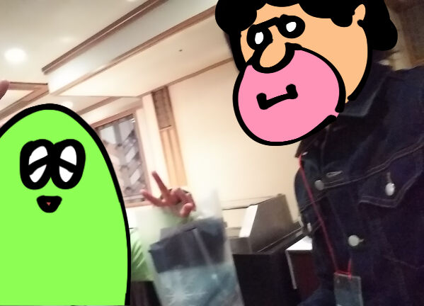 忘年会終了間際に「マジで何も写真撮ってないな」と焦った俺の謎自撮りに付き合っていただいてしまった気の毒な「も~さんの隙あらば自分語り」のも~さん。