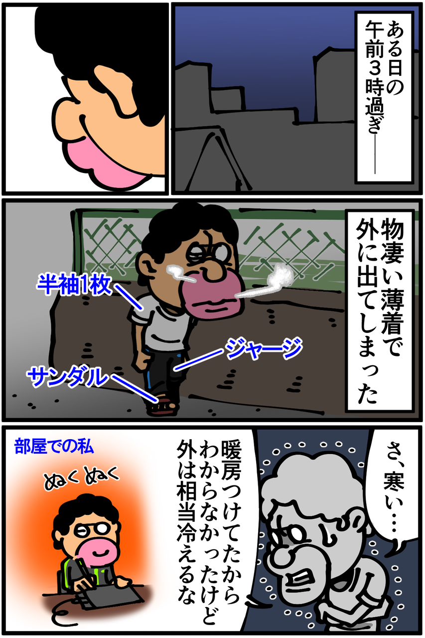 第381話「薄着で外出してしまった夜・前編」 2020年02月24日 死ぬほどどうでもいい話を前後編に分けて申し訳ございません。次回に続きます。続き→ ●お知らせ●スマブラ記事を更新しました(画像クリックで記事に飛びます)。最新作の驚いた要素を挙げてみます。●Twitterやってます。●登録していただくと更新通知がLINEで届きます↓ 「絵日記」カテゴリの最新記事 < 前の記事次の記事 > コメント コメント一覧 (16) 1. あパ 2020年02月24日 22:00 ある日の午前3時過ぎ って書いてある時点でもう不審者案件ですね! おまわりさんとエンカウントしなくてよかったです。 私が警察なら職務質問したいと思います。 0 taikutsu_ken がしました 2. 2020年02月24日 22:01 期間限定…あっ(察し) 0 taikutsu_ken がしました 3. 稲庭風うどん 2020年02月24日 22:02 そういえばコーヒー事情って描かれたことありましたっけ? お湯湧かして入れれば缶コーヒーよりはかなり安く済むはずですが 0 taikutsu_ken がしました 4. なっし〜 2020年02月24日 22:02 (・ ∀ ・)…暖冬だから…先生の気にする基準が謎 0 taikutsu_ken がしました 5. @ 2020年02月24日 22:06 走ればいいじゃないっすか 素早く移動できるし 身体は暖まるし 健康にもよさそうだし 0 taikutsu_ken がしました 6. なめこ 2020年02月24日 22:16 冷静に変な方へ行く先生がキライじゃないです😓 0 taikutsu_ken がしました 7. coppa 2020年02月24日 22:22 気にする気にしないの基準が謎笑 0 taikutsu_ken がしました 8. みり子 2020年02月24日 22:25 タイトル見て「ついに露出狂に?」って思ってしまいましたスミマセンw 0 taikutsu_ken がしました 9. ぷょ子 2020年02月24日 22:30 深夜の自販機スイッチOFFになってて買えず(たまに見かける)、お金を自販機下に落として探す羽目になったのかな(*'∇'*)ワクワク← 0 taikutsu_ken がしました 10. kyakya 2020年02月24日 22:55 上下違うジャージ…? いつもの服装でしょ😅 気にしなくていーよぉ(笑) 期間限定の… 確実に、もぅ無いな👍 0 taikutsu_ken がしました 11. ガイの者!w 2020年02月24日 23:21 退屈先生は夜中の外出とかよく描かれますが、平日の1日(何時に寝て起きて、いつブログの漫画描いて、食事料理の時間、ごろごろしてる時間等)を気が向いたらでいいので記事にしてほしいです 0 taikutsu_ken がしました 12. 照り焼きフェイス 2020年02月25日 00:12 大丈夫? おさいふ持ってる? 0 taikutsu_ken がしました 13. 糸田Jll 2020年02月25日 02:54 自販機とアパートまでの距離が徒歩1分圏内なら上着取りに帰ればいいじゃないですか。笑 0 taikutsu_ken がしました 14. 退屈な名無しさん 2020年02月25日 11:32 昼間ならまだしもこの時期半袖で家出ることがまずまあまあなあたおかですwww 0 taikutsu_ken がしました 15. 退屈なファン 2020年02月25日 15:34 前々から思ってましたが先生天然かドジっ子ですかw 0 taikutsu_ken がしました 16. ぽぽ 2020年02月25日 16:35 自販機売り切れてるに一票(・∀・) 0 taikutsu_ken がしました コメントフォーム 名前 コメント 記事の評価 リセット リセット 顔 星 情報を記憶 コメントを投稿する