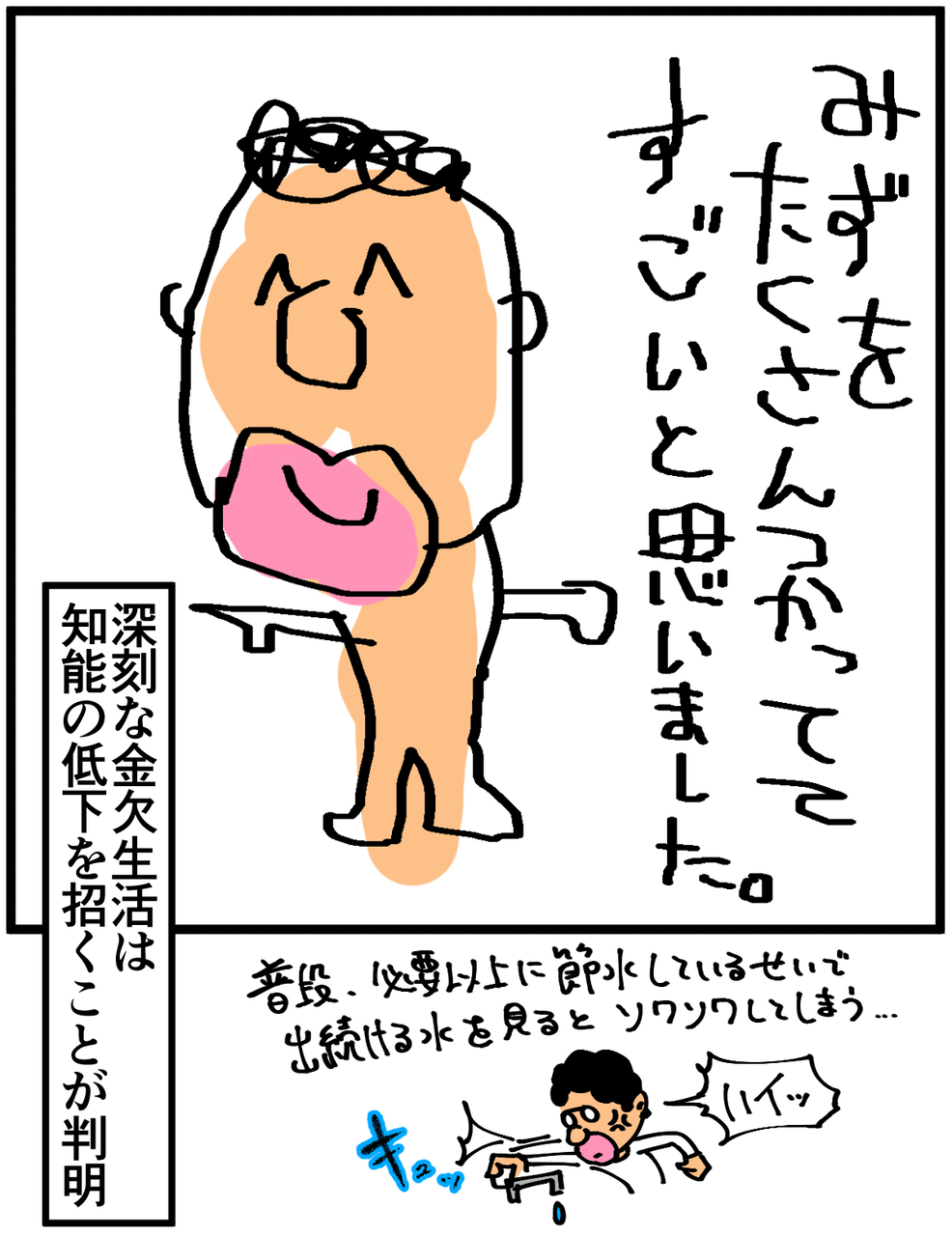 第404話「久々の銭湯」 2020年03月22日 「水がたくさん出ててすげえ!」なんて意味不明な感想、仮に友人と一緒だったとしたら口が裂けても声に出せないですね。水どころかお湯だからさらにすげえ!!●お知らせ●ゲーム記事を更新しました(画像クリックで記事に飛びます)。今話題の『あつまれ どうぶつの森』始めました。※追記:申し訳ございません、リンクし忘れておりました!ご指摘ありがとうございます!!●Twitterやってます。●登録していただくと更新通知がLINEで届きます↓ 「絵日記」カテゴリの最新記事 < 前の記事次の記事 > コメント コメント一覧 (12) 1. 昼寝部 2020年03月22日 20:41 気にしなければ、色々考えると銭湯は効率よく気持ちいい〜。私は回数券を買ってます 0 taikutsu_ken がしました 2. はるきち 2020年03月22日 20:48 いやでも水道キュッと閉めない人はほんとに嫌ですねえ 0 taikutsu_ken がしました 3. あおきんぐ 2020年03月22日 21:06 3コマ目のおっさん めっちゃ鼻血出しながら入浴してるのかと思った 0 taikutsu_ken がしました 4. 2020年03月22日 21:16 全コマ全裸!!と思ったけどぎり最後のコマ服着てた 0 taikutsu_ken がしました 5. 牡蠣 2020年03月22日 21:22 ゲーム記事に飛べない? 0 taikutsu_ken がしました 8. なめこ 2020年03月22日 22:58 >>5 とべないですね。 0 taikutsu_ken がしました 6. 手抜き主婦 2020年03月22日 21:44 先生には是非 銭湯をご利用いただきたいと思ってたので 嬉しいです。 しっかりあたたまって帰ってください。 0 taikutsu_ken がしました 7. なめこ 2020年03月22日 22:02 いつか大浴場のある豪邸を建てましょう😁 0 taikutsu_ken がしました 9. 糸田Jll 2020年03月23日 00:14 節約癖がつくことはいい事なので別に友人さんの前で言ってもいいんじゃないすか?笑 0 taikutsu_ken がしました 10. なーの 2020年03月23日 01:31 お水を大切に使うことはたいへん良いと思います 洗顔、歯磨き中出しっぱなしの人とかすごく美人の方でもドン引きします。 0 taikutsu_ken がしました 11. ももたろー 2020年03月23日 08:11 いろいろケチになる… by 一人暮らしあるある 0 taikutsu_ken がしました 12. まや 2020年03月23日 23:25 おもわずワロタwww 0 taikutsu_ken がしました コメントフォーム 名前 コメント 記事の評価 リセット リセット 顔 星 情報を記憶 コメントを投稿する
