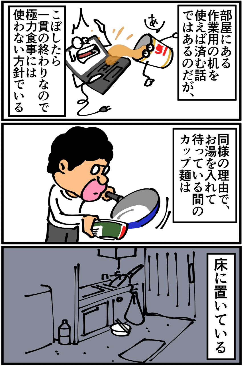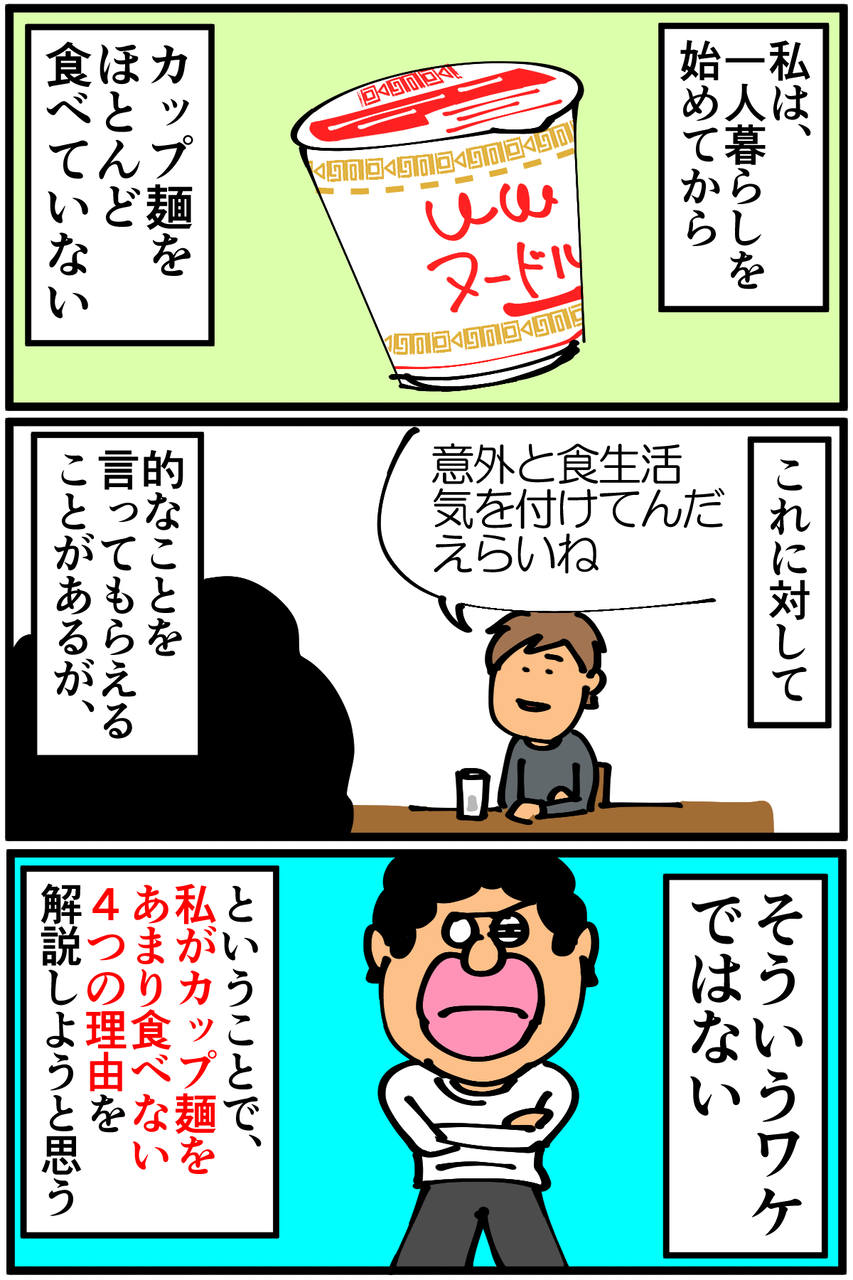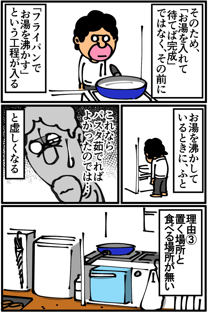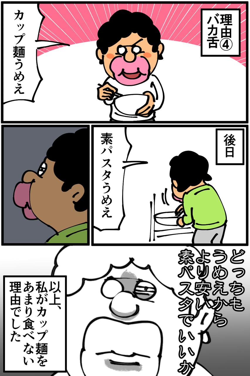 第427話「私がカップ麺をほとんど買わない4つの理由」 2020年04月18日 熱々のIHに置いたら容器が溶けちゃいそうだなと勝手に怖がってるんですが実際のところはどうなんだろう。●お知らせ●ゲーム記事更新しました(画像クリックで記事に飛びます)。あつ森プレイ日記第12回。こんな魅力的な家具があったとは!●Twitterやってます。●登録していただくと更新通知がLINEで届きます↓ 「絵日記」カテゴリの最新記事 < 前の記事次の記事 > コメント コメント一覧 (17) 1. ままま 2020年04月18日 22:59 4番目が1番本心に忠実そう 0 taikutsu_ken がしました 2. ペドロ 2020年04月18日 23:06 素うどんは食べないの? 0 taikutsu_ken がしました 3. kn 2020年04月18日 23:06 IHにカップ麺置いたら絶対溶けますよね〜。 ミルクココアの袋をそれでやってしまい慌てたことがあります…😭 私はどん兵衛が無性に食べたくなる時があります(笑) 0 taikutsu_ken がしました 4. あ 2020年04月18日 23:17 残り汁を取っておいて、別に茹でた麺のスープとして再利用することありますよね。ない? 0 taikutsu_ken がしました 5. 稲庭風うどん 2020年04月18日 23:21 「電気ポットや電気ケトルが無い」→わかる 「フライパンでお湯を沸かす」→何か突っ込みたい という感じでした。 袋麺についてはどうなのかも知りたいです! 0 taikutsu_ken がしました 13. ごはん 2020年04月19日 09:35 >>5 袋麺 20食入りのミニラーメンとかすごく安いですよね。 近所のスーパーでは確か¥250くらいです。 食事として食べるなら2個必要ですが、一ヶ¥12.5×2=¥25で 味も付いてるので調味料もいらないし、素パスタより安いんじゃない? 添加物あるので体には悪そう 0 taikutsu_ken がしました 6. レオぴ 2020年04月18日 23:39 カップ麺ラバーの自分からしたらカップ麺の無い生活なんて耐えられない… 0 taikutsu_ken がしました 7. 糸田Jll 2020年04月18日 23:53 いつぞやのミニテーブルは使われないんですね。笑 部屋の隅にでも出しとけば意外と使い勝手いいかも知れませんよ?笑 0 taikutsu_ken がしました 8. なめこ 2020年04月18日 23:57 脚気にならない事を祈りますわ(-人-) 0 taikutsu_ken がしました 9. みり子 2020年04月18日 23:58 カップ麺、フライパンで煮て食べれば2と3はクリアできますよ 高いのとバカ舌は……………うん笑 0 taikutsu_ken がしました 10. あおきんぐ 2020年04月19日 00:07 食生活意外と気をつけてんだ。えらいねー って言ってた人に是非ともこの漫画を1話から読ませたい。 0 taikutsu_ken がしました 11. 2020年04月19日 00:25 改めてまともな生活してねぇなって再確認しました! 0 taikutsu_ken がしました 12. ハスる 2020年04月19日 00:43 無限カップ麺しないんですか?笑 退屈先生の残ったスープに豆乳入れる記事読んでからたまに真似してます笑 0 taikutsu_ken がしました 14. さだもさし 2020年04月19日 16:03 だから稼ごうという気にならないのでは…… 0 taikutsu_ken がしました 15. えいにゃんマン 2020年04月19日 16:53 我が家もカップヌードルはあまり食べません。 理由は作る工程もありますが、味が濃すぎてすぐ飽きるのです。 だからパスタに野菜を投入して炒めて味を調節しています。( *・ω・)ノ 0 taikutsu_ken がしました 16. はるきち 2020年04月19日 22:15 やかん便利ですよ 0 taikutsu_ken がしました 17. まき 2020年04月20日 20:13 ゆでたパスタにだしのもと混ぜるだけの「素パスタ」あなどれないよ 読者の人も一度やってみるといい(うまみ調味料や添加物を避けたいなら、リケ●とかの無添加かつおだし/こんぶだしでも作れる) うまいけど2度目はないかな、ってなりつつ既に5回くらい食べてる…… 0 taikutsu_ken がしました コメントフォーム 名前 コメント 記事の評価 リセット リセット 顔 星 情報を記憶 コメントを投稿する