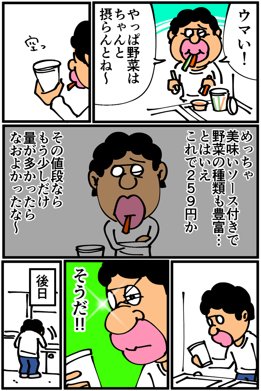 第435話「野菜スティックを買う」 2020年04月27日 変なところで区切ってすみません。次回(明後日)に続きます。続き→ ●Twitterやってます。●登録していただくと更新通知がLINEで届きます↓ 「絵日記」カテゴリの最新記事 < 前の記事次の記事 > コメント コメント一覧 (9) 1. へー 2020年04月27日 22:30 野菜スティックって高いんですね! リッチじゃないですか…。 ちょっと買うのん躊躇う値段です。 0 taikutsu_ken がしました 2. なめこ 2020年04月27日 22:31 ドレッシングを再利用ですね😃 0 taikutsu_ken がしました 3. かっとびランサー 2020年04月27日 22:38 丸かじりと結果は変わらないけど こうやってスティックにしてソースも作って 容器に入れるとあら不思議 0 taikutsu_ken がしました 4. ラズ 2020年04月27日 23:32 バランス◎ 0 taikutsu_ken がしました 5. とちゃ 2020年04月27日 23:39 ツイッターに投稿し忘れてますよー🙌 0 taikutsu_ken がしました 6. 糸田Jll 2020年04月28日 00:05 毎度毎度野菜は丸かじりが主流だった先生が野菜を切るとは...。笑 続き楽しみにしてます。笑 0 taikutsu_ken がしました 7. ももえちん 2020年04月28日 22:12 これめちゃうまいのよね 0 taikutsu_ken がしました 8. ピタゴラ 2020年04月29日 00:37 味噌とマヨネーズと七味で近いものが再現できますよ 0 taikutsu_ken がしました 9. non 2020年04月29日 23:13 相変わらず先生は手が綺麗✨ 0 taikutsu_ken がしました コメントフォーム 名前 コメント 記事の評価 リセット リセット 顔 星 情報を記憶 コメントを投稿する