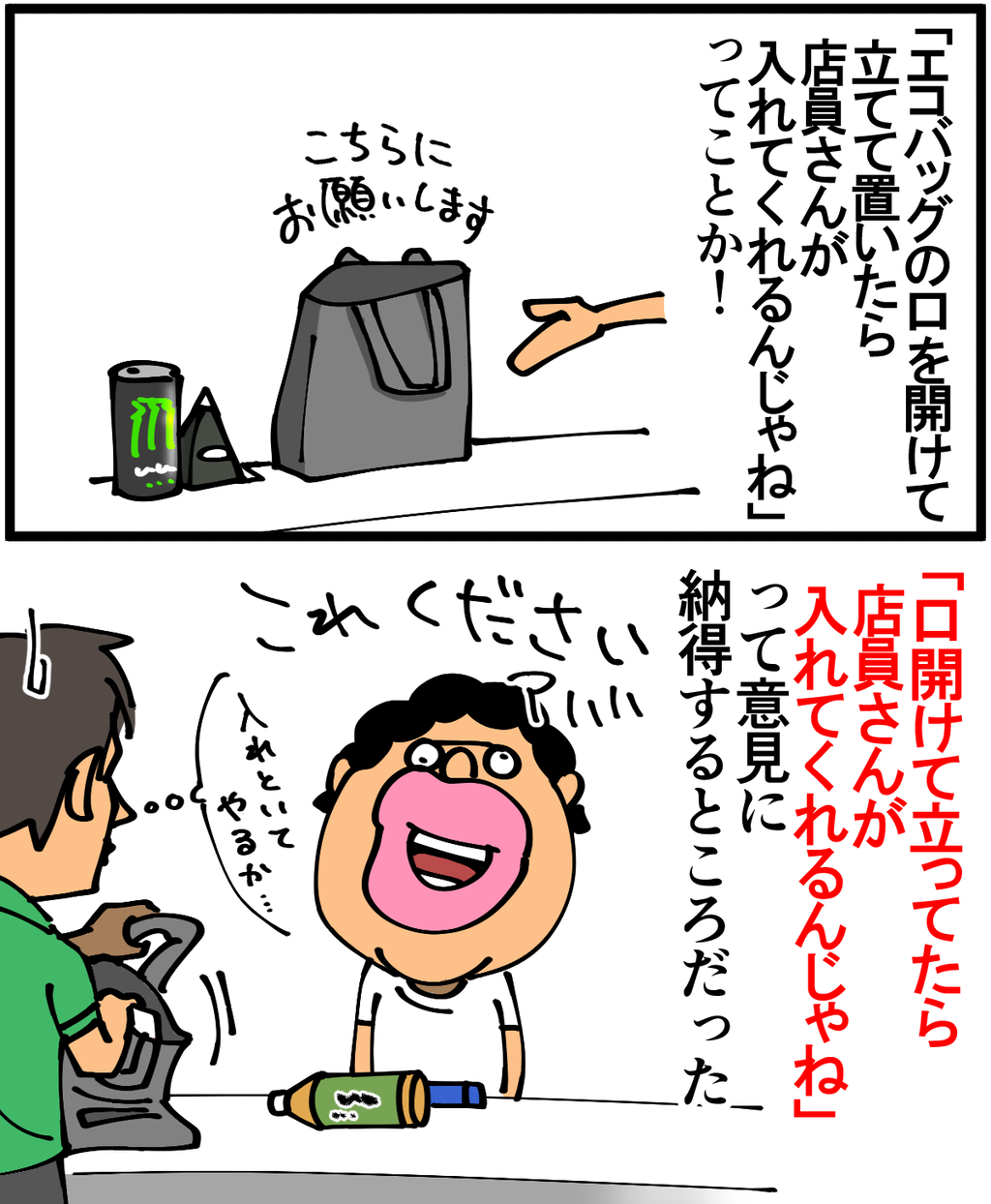 移すのが面倒なら作中の様にレジカウンターの出口側の方に口を開けて置いてそこに商品を入れてもらうか、自分で口を開けておいて店員さんに商品を入れてもらうですかね?