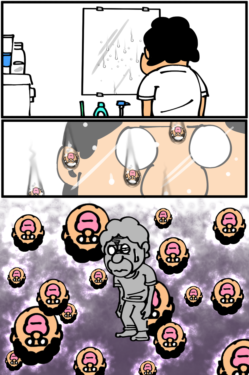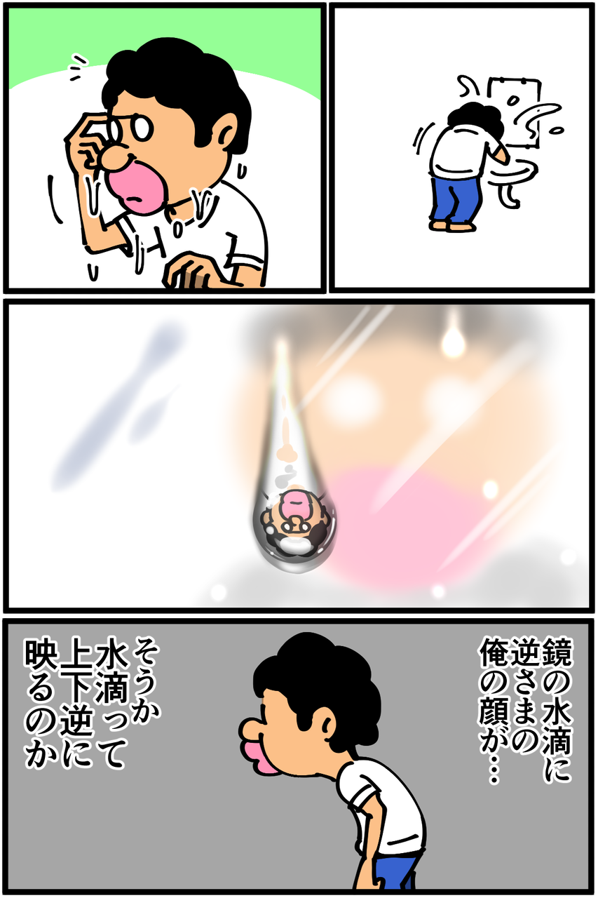 一度気付いてしまったので、水滴だらけの鏡がひっくり返った俺の顔軍団にしか見えなくなってしまって最悪です。