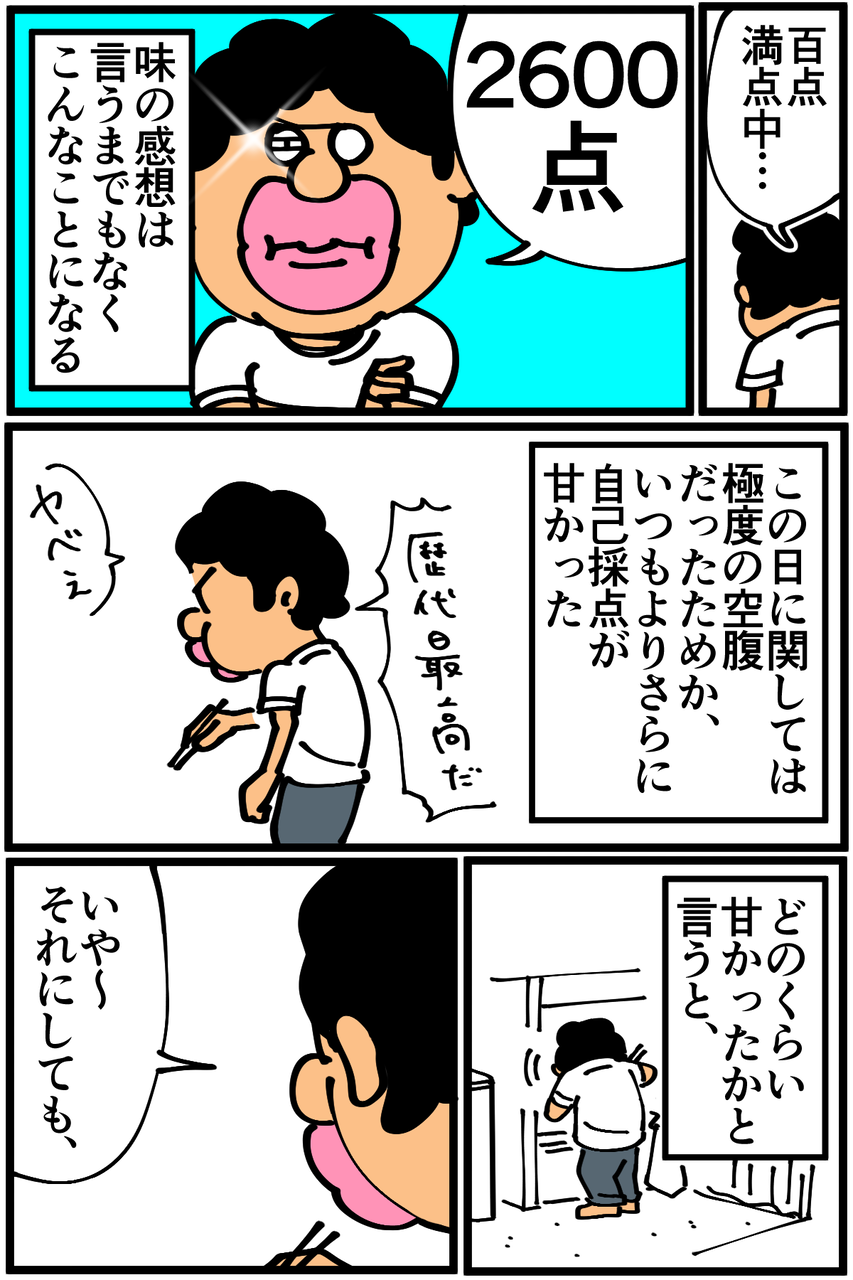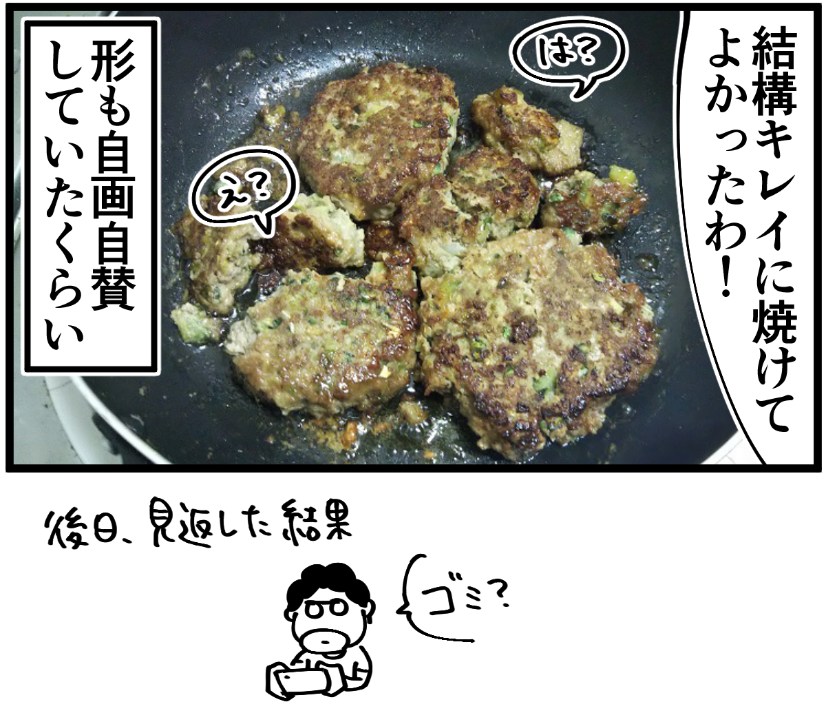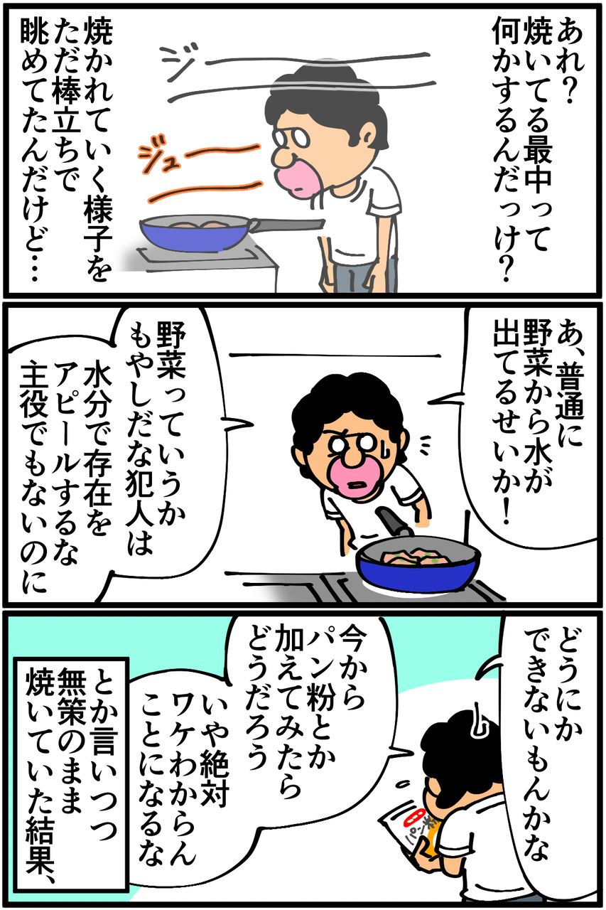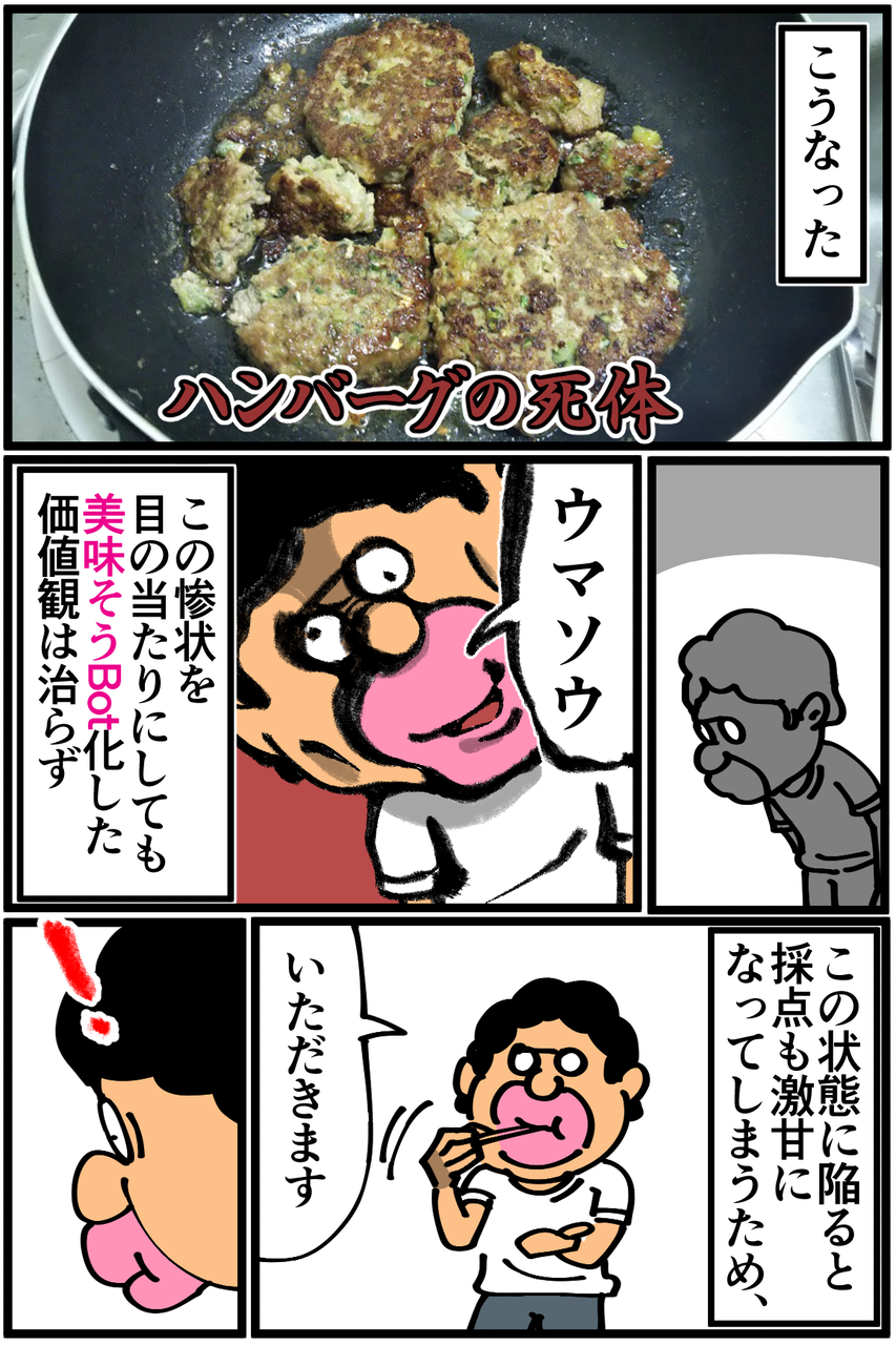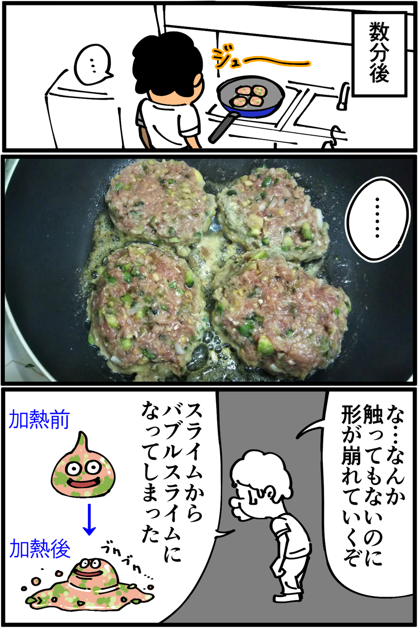 第507話「フルパワードラゴンハンバーグを作る・後編」 2020年07月22日 家賃3万円の6帖アパートでカツカツな生活を送る男の漫画ブログです。金が底を尽きてくたばるようなことがなければ毎日更新していきます。前回の記事の続きです。改めて見返すと「綺麗に焼くために4つにしとこ」の時点で歪だ!いつかフルパワーじゃないノーマルドラゴンハンバーグでリベンジしようと思います。●お知らせ●ゲーム記事更新しました(画像クリックで記事に飛びます)。あつ森プレイ日記第39回、釣り堀を作ってみました。●Twitterやってます。●登録していただくと更新通知がLINEで届きます↓ 「絵日記」カテゴリの最新記事 「料理」カテゴリの最新記事 < 前の記事次の記事 > コメント コメント一覧 (13) 1. カイジ 2020年07月22日 21:34 だがそれでいい! 0 taikutsu_ken がしました 2. ハマーン 2020年07月22日 21:35 皮なしギョーザ 0 taikutsu_ken がしました 3. ゴ 2020年07月22日 21:43 ゴーヤ入りハンバーグの味が… わたし、気になります 0 taikutsu_ken がしました 4. なめこ 2020年07月22日 21:48 前も焼き飯にもやし入れてビチョビチョにしてませんでしたか? 0 taikutsu_ken がしました 5. スズメ 2020年07月22日 22:10 フルパワードラゴンハンバーグをクックパッドに載せましょう 0 taikutsu_ken がしました 6. カットマン 2020年07月22日 22:12 生肉スライム そのうちドラクエに出てきそう。 0 taikutsu_ken がしました 7. 手抜き主婦 2020年07月22日 22:14 自分が作る豆腐ハンバーグに似てます! 緑が入ってる分、見た目 美味しそう!! 0 taikutsu_ken がしました 8. 糸田Jll 2020年07月22日 22:23 先生クオリティだからこそ楽しく見れるんですよ。笑 0 taikutsu_ken がしました 9. 昼寝部 2020年07月22日 22:49 先生、ハンバーグヘルパーを使えば、挽き肉、水、ヘルパーのみでいけますよ。 0 taikutsu_ken がしました 10. ギリヂン 2020年07月22日 22:51 これぞたいくつキッチンクオリティ。。 だがそれがいいっっ! 0 taikutsu_ken がしました 11. へいよー 2020年07月23日 23:30 わしもたいくつバーグ美味そうにみえるぞな 0 taikutsu_ken がしました 12. まき 2020年07月24日 11:49 スライム→バブルスライムの色合いエグすぎて草 こういうセンスほんとすこ 0 taikutsu_ken がしました 13. ハンド 2020年07月27日 01:19 ハンバーグちゃんと叩きました? 0 taikutsu_ken がしました コメントフォーム 名前 コメント 記事の評価 リセット リセット 顔 星 情報を記憶 コメントを投稿する