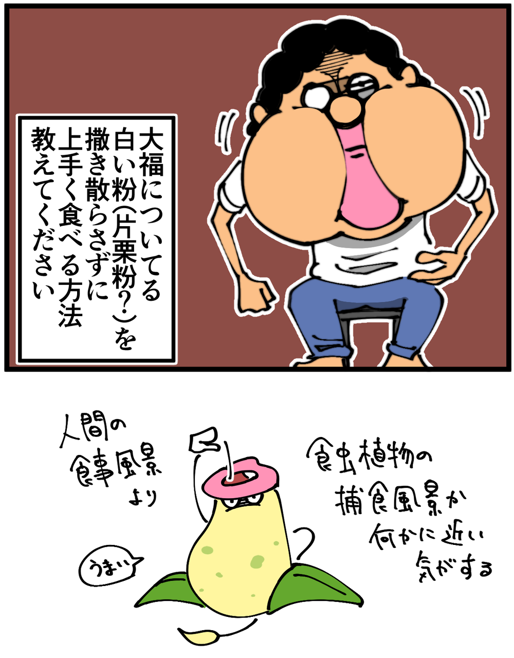 お砂糖とか溶かしたお湯に大福を入れて「逆汁粉」とかにすれば、粉でとろみが付いたお湯でお腹も膨れて、粉も散らないし、喉にも詰まらせにくいかなと。