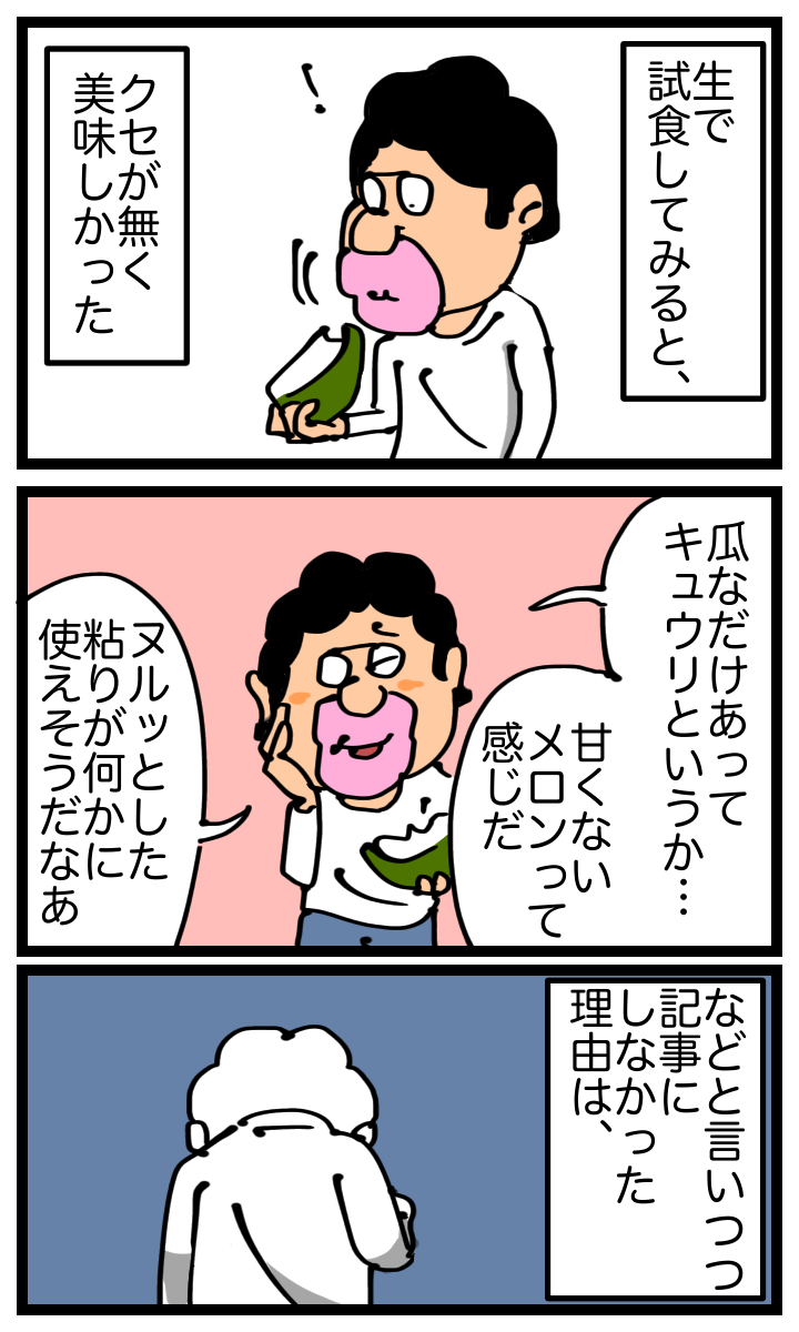 帰ってきたパソコン故障記・その5「冬瓜を食べたときの話」 2020年09月27日 家賃3万円の6帖アパートでカツカツな生活を送る男の漫画ブログです。現在パソコンを修理に出しているのでスマホから更新中。予想以上に食べやすくて爆食してしまいました。結局あれ以来買ってないんですが、あのガタイと食べやすさは魅力的なのでまた近いうちに食べたいところです。今度はちゃんと調理しよう(フラグ)。●お知らせ●屑山くんのノープラン高校入学物語、最新話更新しました。 まだ学校に入ってません。今回も次の展開をリンク先のコメント欄で指示していただけると幸いです。 「パソコン故障記」カテゴリの最新記事 < 前の記事次の記事 > コメント コメント一覧 (9) 1. なめこ 2020年09月27日 21:56 その量を試食とは言わへんΣヽ(゚∀゚;) 0 taikutsu_ken がしました 2. ごみむしまん 2020年09月27日 21:57 どんな野菜だろうがとりあえず最初は生で行く男 0 taikutsu_ken がしました 3. プイ 2020年09月27日 22:47 冬瓜って生で食べられるのですか? お腹大丈夫ですか?(^o^;) 0 taikutsu_ken がしました 4. どどん 2020年09月27日 22:56 冬瓜!存在すら今知りました! 東京だとメジャーな野菜なのかな……? 0 taikutsu_ken がしました 5. ふーちゃ 2020年09月27日 23:26 冬瓜を生で食べる人、初めて見た(笑) あのガタイで生で行こうと思えるのがすごい(笑) 0 taikutsu_ken がしました 6. 2020年09月27日 23:44 ぶどうジュースで煮込んで冷やすと美味しいですぞ 0 taikutsu_ken がしました 7. 糸田Jll 2020年09月28日 00:29 でもなんか分かります。試食とかつまみ食いが1番美味しい気がしますよね。笑 0 taikutsu_ken がしました 8. たーばりん 2020年09月28日 02:27 醤油を付ければ何でも生で食べれる気がしないでもないけど、やっぱホクホクに煮たりしたいwww 0 taikutsu_ken がしました 9. kyakya 2020年09月28日 03:18 まさか皮まで全部? 0 taikutsu_ken がしました コメントフォーム 名前 コメント 記事の評価 リセット リセット 顔 星 情報を記憶 コメントを投稿する