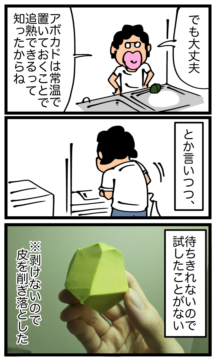 帰ってきたパソコン故障記・その9「熟していないアボカド」 2020年10月01日 家賃3万円の6帖アパートでカツカツな生活を送る男の漫画ブログです。現在パソコンを修理に出しているのでスマホから更新中。自分でやっといて何だけどこんなパズドラの魔法石みたいな形状のアボカド他で見たことない。こうなった場合は種スレスレまでスライスしてから炒めるという意味不明な食べ方してます。でも結構美味しい。●お知らせ●屑山くんのノープラン高校入学物語、最新話更新しました。 「パソコン故障記」カテゴリの最新記事 < 前の記事次の記事 > コメント コメント一覧 (14) 1. 糸田Jll 2020年10月01日 21:53 どうせなら美味しく食べてくださいよ。笑 0 taikutsu_ken がしました 2. 楼蘭 2020年10月01日 21:53 アボカドって真ん中を切って種に沿って一周してふたつにしてからスプーンで取る方がいいですよー 0 taikutsu_ken がしました 3. アボカド大好き 2020年10月01日 21:53 アボカド美味しいですよね~ 見分け方は、皮の色が緑のはまだ熟れてない証拠です。熟れてるやつは色が濃い茶色になるので見ただけで分かると思いますよ~ あと軽く指で押した時柔らかい感じがしたら熟れてるってことです!お試しあれ~ 0 taikutsu_ken がしました 4. なめこ 2020年10月01日 22:13 みどりポリゴン😓 0 taikutsu_ken がしました 5. 名無し 2020年10月01日 22:53 りんごを一緒に買ってきて置いておくといいですよ 0 taikutsu_ken がしました 6. ちぇーん 2020年10月02日 00:03 ポリゴン食べてる人初めて見た。。。笑 0 taikutsu_ken がしました 7. kyakya 2020年10月02日 01:01 すぐ食べるのに なんでわざわざ緑色のを買ってくるかなぁ… (─.─||) 0 taikutsu_ken がしました 8. てか 2020年10月02日 04:40 残ったタネ植えて育ててみていただけませんか 0 taikutsu_ken がしました 9. いち 2020年10月02日 06:59 アボカドはヘタが真っ黒でポロリと落ちるくらいが食べ頃ですよ♪ ちなみにファーマインドの「真の実(まのみ)アボカド」は常に食べ頃で売られてます☆ 0 taikutsu_ken がしました 10. しじみ 2020年10月02日 10:39 プールに落ちてる宝石っぽいアレかと思った 0 taikutsu_ken がしました 11. charaんporan 2020年10月02日 20:12 試した事はないけど、スライスして、ニンニク&バター&めんつゆで炒めれば、ご飯の友になりそうな気がします😃。 0 taikutsu_ken がしました 12. 2020年10月02日 22:25 カービィ64のラスボスかな? 0 taikutsu_ken がしました 13. lucy 2020年10月03日 03:10 買う時は皮の柔らかさとヘタの色をよく見ましょうね…! 0 taikutsu_ken がしました 14. 多忙 2020年10月03日 04:16 先生は今もわさび醤油でアボカド食べてるのかな?私も熟れてるの選ぶの苦手です…熟れてないと消しゴムみたいな味する 0 taikutsu_ken がしました コメントフォーム 名前 コメント 記事の評価 リセット リセット 顔 星 情報を記憶 コメントを投稿する