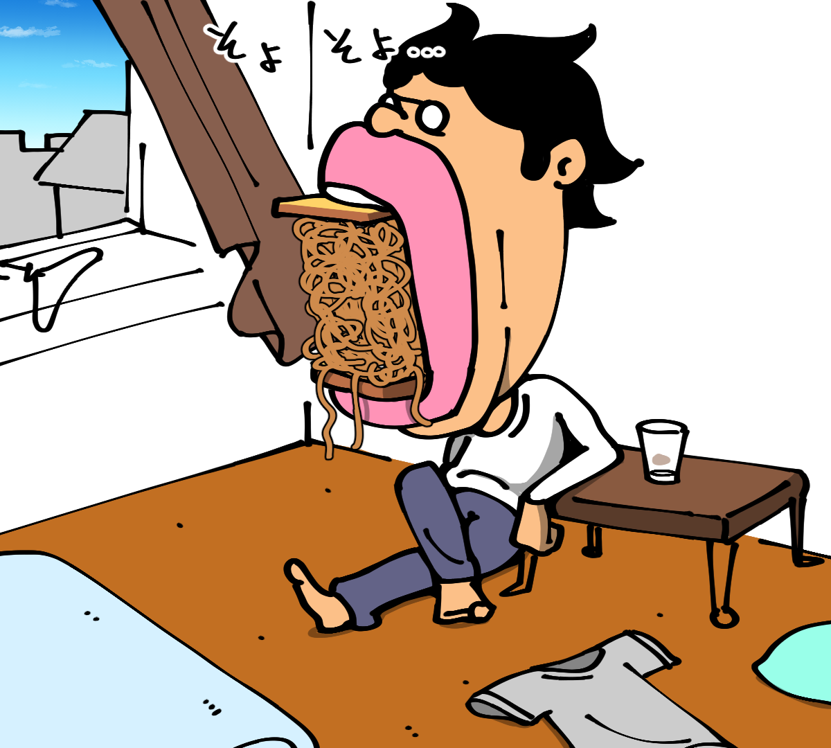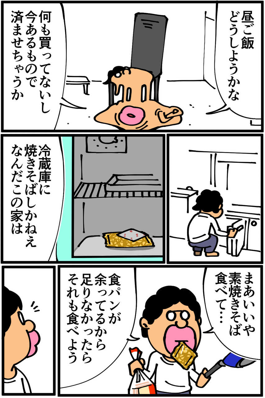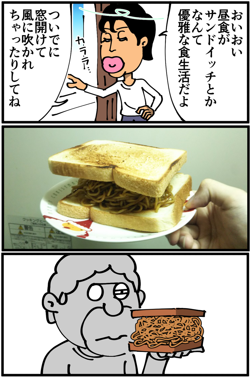 第565話「焼きそばパン(サンド)を作る」 2020年10月27日 家賃3万円の6帖アパートでカツカツな生活を送る男の漫画ブログです。金が底を尽きてくたばるようなことがなければ毎日更新していきます。俺が作るサンドイッチはいつも標高がおかしいし終盤のジェンガ並に安定感が無い。 このときからまるで成長していない!あとどうでもいいけど久しぶりに部屋で座って食事した気がします。皆さんご存知かもしれませんが、座って食事をとると疲れないのでオススメです。●Twitterやってます。●登録していただくと更新通知がLINEで届きます↓ 「絵日記」カテゴリの最新記事 「料理」カテゴリの最新記事 < 前の記事次の記事 > コメント コメント一覧 (16) 1. 後継者 2020年10月27日 20:39 一コマ目の先生ダリの時計みたいになってて笑う 0 taikutsu_ken がしました 2. じゃお 2020年10月27日 20:42 最後のコマ 不気味な怪物が高校生を無差別に食い散らかしていくタイプのパニック漫画 のワンシーンっぽいです笑 0 taikutsu_ken がしました 3. こーだい 2020年10月27日 20:47 一コマ目から人間の形をしてなくて笑いました 0 taikutsu_ken がしました 4. ソーラ 2020年10月27日 20:51 また退屈先生のブログを最初から読んでいるんですけど、全然内容のクオリティ変わってなくて凄いですw これからも頑張ってくださいヽ(*´∀`*) 0 taikutsu_ken がしました 5. なめこ 2020年10月27日 20:54 切るなり押さえるなりしたらいいと思うんだ😓 0 taikutsu_ken がしました 6. みしえる 2020年10月27日 20:55 退屈さんの漫画ツボすぎて1話から全部見返しました。 おなじ一人暮らしなのに共感する点少なすぎて笑いました 0 taikutsu_ken がしました 7. 名無し 2020年10月27日 21:16 退屈先生の誇張表現大好き 0 taikutsu_ken がしました 8. カットマン 2020年10月27日 21:29 とろけるチーズみたいになってる先生見て思いついたんですけど 焼きそばサンドにチーズ挟んでみたらおいしそうじゃないですか? 0 taikutsu_ken がしました 9. ゆ 2020年10月27日 21:53 最後のイラストめっちゃ笑いました!こんな時間なのに焼きそば食べたくなった・・・(ダイエット中)先生、罪です・・・・・・ 0 taikutsu_ken がしました 10. gas 2020年10月27日 22:22 テーブルと椅子買って、どうぞ 0 taikutsu_ken がしました 11. 匿名 2020年10月27日 23:20 先生は寄生獣かなにかですか? 0 taikutsu_ken がしました 12. ギリヂン 2020年10月28日 00:08 口を大きく(長く?)開いた先生を見て、 バオウ・ザケルガが口をめっちゃ開くシーンを 思い出したのは私だけではないはず。 0 taikutsu_ken がしました 13. ひまこ 2020年10月28日 00:44 窓カララ…のときの顔、最高にいいです。 小さな幸せでも、うふふふって楽しんで生きていきたいですね! 0 taikutsu_ken がしました 14. のめ 2020年10月28日 07:04 お皿かわいいですね笑 0 taikutsu_ken がしました 15. ぺく 2020年10月28日 20:40 自分の食べ物にはとことんまでこだわらない(素で食べられるものは素で、生で食べられる野菜は生で、切らずに食べられるものは丸のまま)という一点においてブレがなさすぎる 退屈先生なんだかんだ友人と飲みに行くことが多いみたいなので、友人を招いて料理を振舞えば「ちょっと手間かけて見栄えとか味とか良くしよう」って気持ちになって上達しませんかね……? 0 taikutsu_ken がしました 16. カナヘビ 2020年10月29日 11:56 サンドイッチは押しつぶすと○ 0 taikutsu_ken がしました コメントフォーム 名前 コメント 記事の評価 リセット リセット 顔 星 情報を記憶 コメントを投稿する