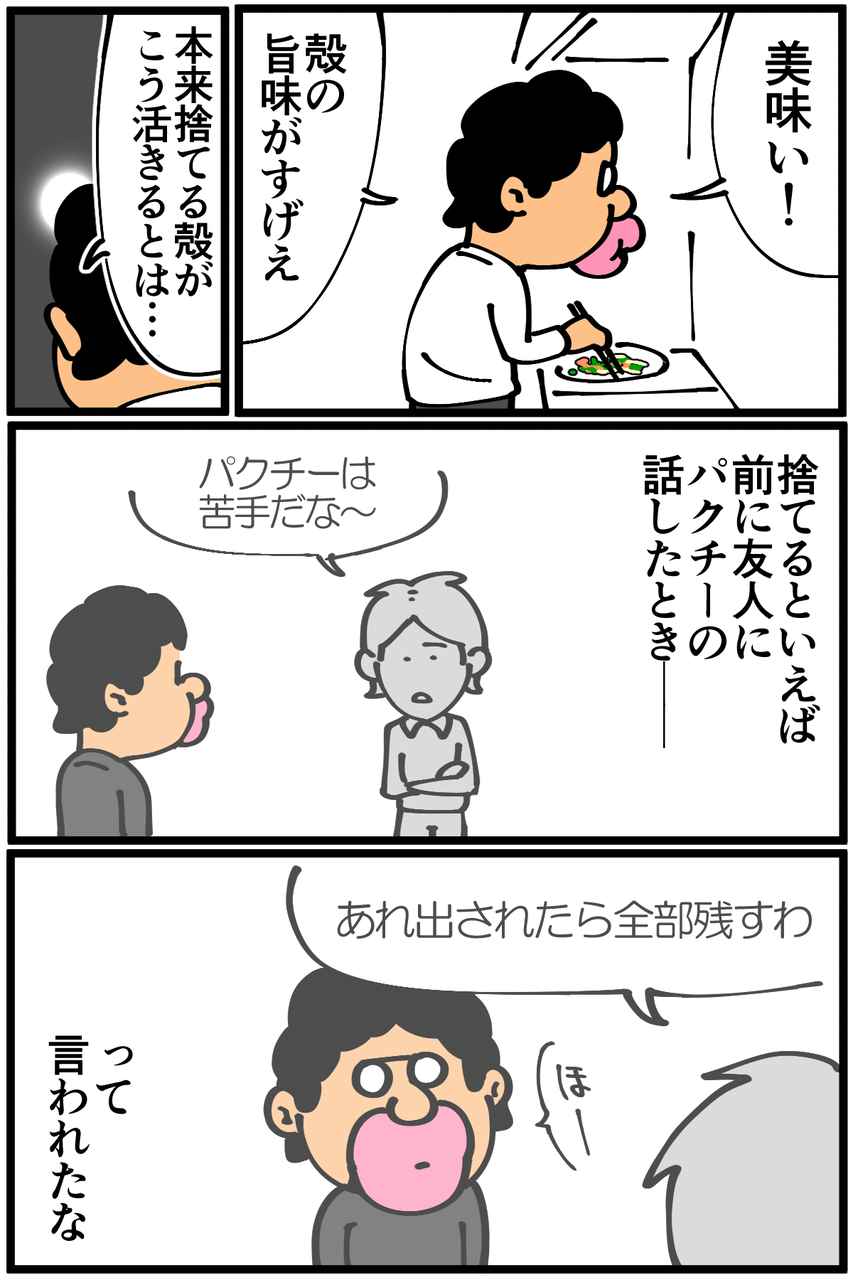 コメントでご指摘いただき致命的な勘違いに気付きました!入れた香草はパクチーではなくディルでした…!大変申し訳ございません!!パクチーを食べたときの記事はコチラ