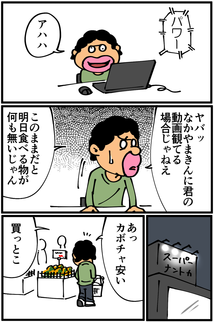 第568話「ハッピーハロウィン」 2020年10月31日 家賃3万円の6帖アパートでカツカツな生活を送る男の漫画ブログです。金が底を尽きてくたばるようなことがなければ毎日更新していきます。あつ森起動して今日がハロウィン当日だということに気が付きました。●お知らせ●屑山くんのノープラン高校入学物語、最新話更新しました。●Twitterやってます。●登録していただくと更新通知がLINEで届きます↓ 「絵日記」カテゴリの最新記事 < 前の記事次の記事 > コメント コメント一覧 (6) 1. 麺 2020年10月31日 22:54 ゲームとかであっ、今日○○の日だったんだ!ってのはあるあるですねw 0 taikutsu_ken がしました 2. あおきんぐ 2020年10月31日 23:01 カボチャを種ごと食す話かと思いましたw 0 taikutsu_ken がしました 3. 手抜き主婦 2020年10月31日 23:09 クモを素手で… レベルアップされましたね! 0 taikutsu_ken がしました 4. なめこ 2020年10月31日 23:22 さすがに近所に突撃はしなかったのですね(笑) 0 taikutsu_ken がしました 5. 糸田Jll 2020年10月31日 23:57 楽しそうで何よりです。笑 0 taikutsu_ken がしました 6. はるた 2020年11月01日 11:16 ケチャップは蓋あけるまえに振ると水っぽくなくなるよ 0 taikutsu_ken がしました コメントフォーム 名前 コメント 記事の評価 リセット リセット 顔 星 情報を記憶 コメントを投稿する