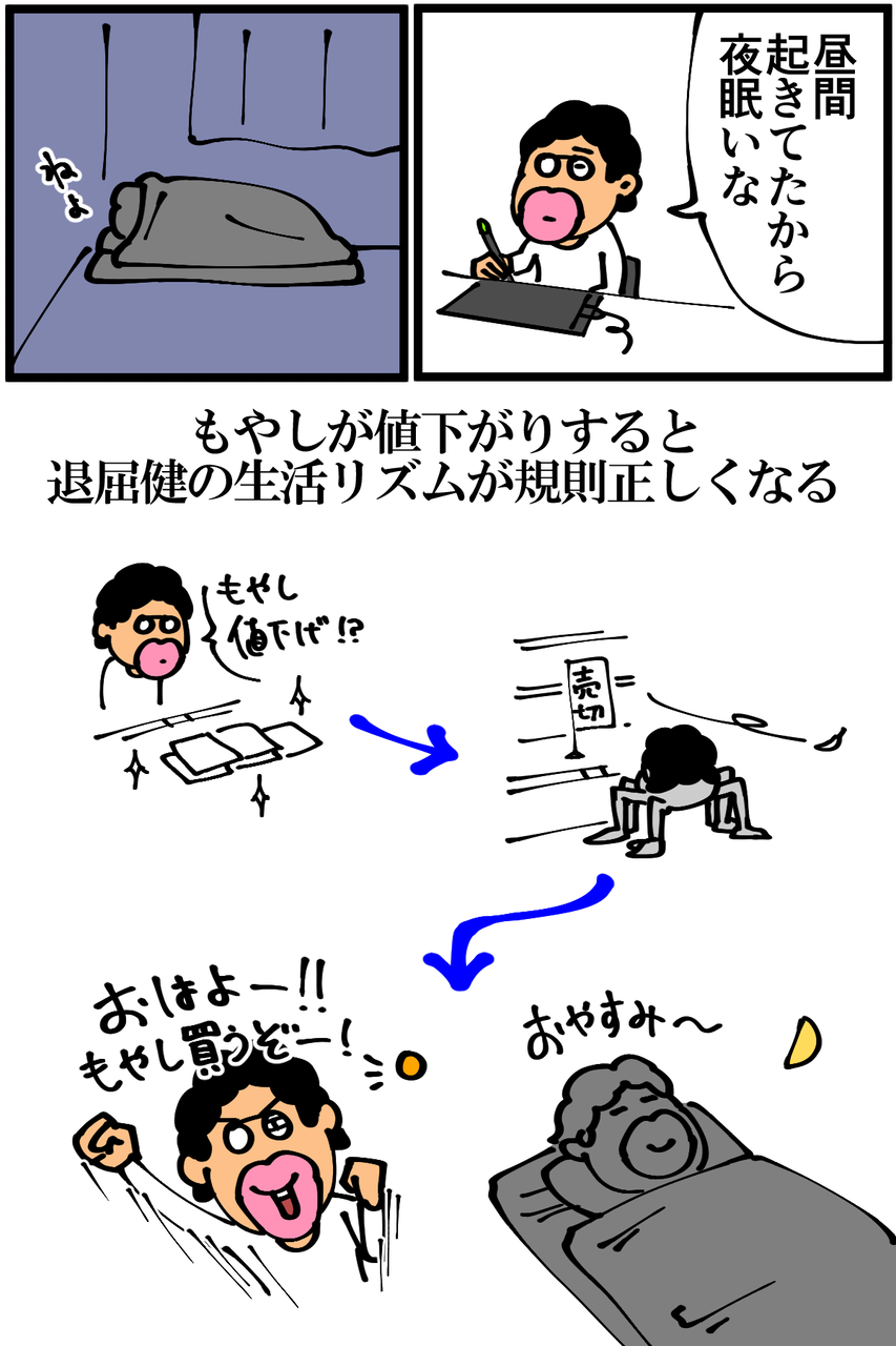 第583話「風が吹けば桶屋が儲かる」 2020年11月17日 家賃3万円の6帖アパートでカツカツな生活を送る男の漫画ブログです。金が底を尽きてくたばるようなことがなければ毎日更新します。ちょっと「風が吹けば~」のことわざっぽいなと思ったけど描いてみたら全然そんなことなかった。ちなみに日中に買い物に出かける機会が増えたことで値引きされていない惣菜や魚を買うことも増えたため、もやしの値引き分も結局意味ない気がします。●Twitterやってます。●登録していただくと更新通知がLINEで届きます↓ 「絵日記」カテゴリの最新記事 < 前の記事次の記事 > コメント コメント一覧 (17) 1. もやし 2020年11月17日 21:25 食べてくれ 0 taikutsu_ken がしました 9. 退屈健 2020年11月18日 14:07 >>1 もやしから直々のコメント!笑 0 taikutsu_ken がしました 2. M.DUBLIN 2020年11月17日 21:26 「ことわざを学べ」 「先生のリズムが整った」 これ全て、もやしのおかげですね! 0 taikutsu_ken がしました 10. 退屈健 2020年11月18日 14:07 >>2 もやし様様ですね!笑 0 taikutsu_ken がしました 3. おれ 2020年11月17日 21:30 もやしがコメントしててワロタ 0 taikutsu_ken がしました 11. 退屈健 2020年11月18日 14:07 >>3 もやしから直接いただけるとはありがたいですね!笑 0 taikutsu_ken がしました 4. 豆苗 2020年11月17日 21:44 アタシのことも忘れないでね❤️ 0 taikutsu_ken がしました 12. 退屈健 2020年11月18日 14:08 >>4 豆苗も安くて最高ですね! 0 taikutsu_ken がしました 5. なめこ 2020年11月17日 21:50 ここまでもやしに支配されてる人もいないだろうなぁ😱 0 taikutsu_ken がしました 13. 退屈健 2020年11月18日 14:08 >>5 もやしに生活を振り回されてます!笑 0 taikutsu_ken がしました 6. シュフ 2020年11月17日 22:23 ためになるっ!笑 スーパーは朝・閉店間際と2度通って、さらに健康になってみては? 0 taikutsu_ken がしました 14. 退屈健 2020年11月18日 14:08 >>6 確かに!見切り品も魅力的なのでそうするべきですね! 0 taikutsu_ken がしました 7. まー 2020年11月17日 22:34 うちの方も朝イチも値下げされてるもの結構あります⭐︎ 0 taikutsu_ken がしました 15. 退屈健 2020年11月18日 14:09 >>7 朝イチも狙い目なんですね~! 0 taikutsu_ken がしました 8. みり子 2020年11月18日 00:00 生活リズムが規則正しくなる→夜中にウロウロする人が減る つまりもやしが安くなると不審者が減る、とw 0 taikutsu_ken がしました 16. 退屈健 2020年11月18日 14:09 >>8 うちの近所限定のことわざですね!笑 0 taikutsu_ken がしました 17. 退屈_mania 2023年12月09日 10:20 アーマードコアの新作が本当に出た ↓ アーマードコアがGOTYのベストアクションゲーム賞を受賞する ↓ モンハンの新作「モンスターハンターワイルズ」が発表される ↓ 野獣先輩が復帰を決意する ↓ 真夏の夜の淫夢の新作が出る 0 taikutsu_ken がしました コメントフォーム 名前 コメント 記事の評価 リセット リセット 顔 星 情報を記憶 コメントを投稿する