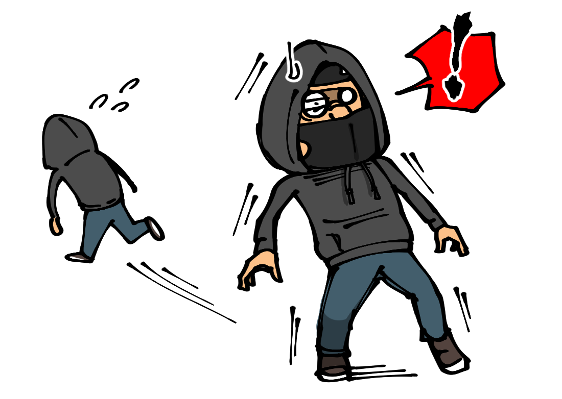 警察官の姿を視認して慌てて逃げた人みたいになっていたと思われるので、格好と人相だけでなく行動も不審というコンボを知らずのうちに決めておりました。