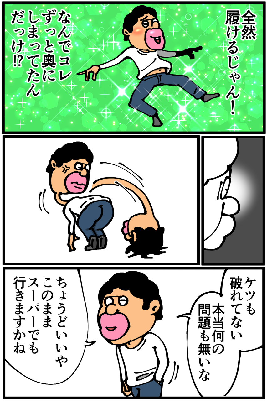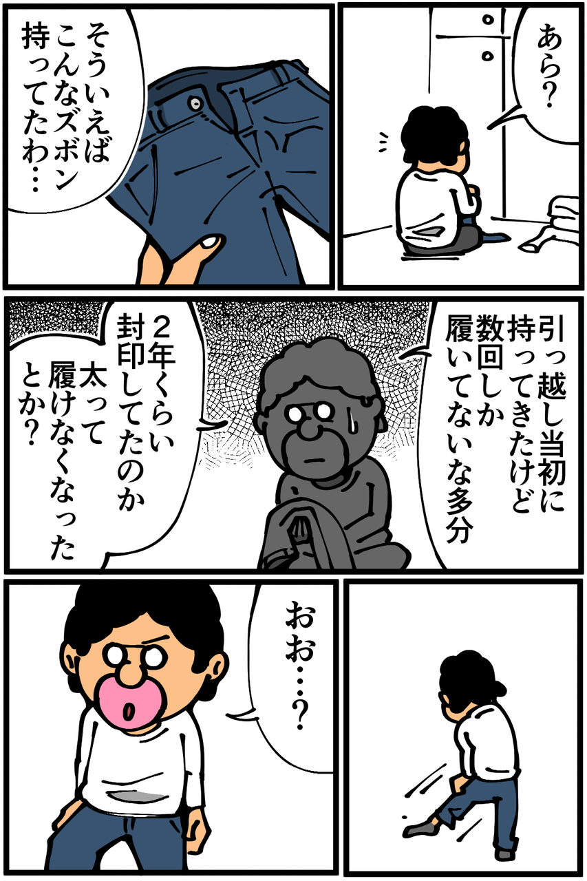 第589話「封印していたズボン」 2020年11月24日 家賃3万円の6帖アパートでカツカツな生活を送る男の漫画ブログです。金が底を尽きてくたばるようなことがなければ毎日更新します。穴と呼ぶにはあまりに巨大な穴がポケットの中に空いてたからしまってたんだった。財布はギリ通りませんがスマホはちょうど抜けられます。再び封印したのでまた2年後くらいに「こんなのあったんだ!」とか言い出すと思う。関係ないけど「ズボン」という名前で呼ぶのってオッサンですか?●Twitterやってます。●登録していただくと更新通知がLINEで届きます↓ 「絵日記」カテゴリの最新記事 < 前の記事次の記事 > コメント コメント一覧 (44) 1. 通りすがりの名無し 2020年11月24日 22:36 ズボンのポケットぐらいなら簡単に縫えると思いますよ!次実家に帰られる時にお持ちになってはいかがですか? 0 taikutsu_ken がしました 16. 退屈健 2020年11月25日 23:19 >>1 確かに縫えば解決ですね!ただ、果たして俺に裁縫ができるかという不安要素が…!笑 0 taikutsu_ken がしました 2. Bixis 2020年11月24日 22:38 忘れて洗濯しちゃうの防止してくれるって事で 0 taikutsu_ken がしました 17. 退屈健 2020年11月25日 23:20 >>2 忘れて選択しちゃうのは穴あき靴下でよくやります!笑 0 taikutsu_ken がしました 3. アリサ 2020年11月24日 22:39 いつも楽しく拝見してます。 2年後には100均で裁縫セットを買って節約スキルが上がっているかも!笑 0 taikutsu_ken がしました 18. 退屈健 2020年11月25日 23:20 >>3 ありがとうございます! 裁縫セットを買ってランクアップしたカツカツ生活を送りたいですね~!笑 0 taikutsu_ken がしました 4. 匿名 2020年11月24日 22:41 ズボンのポケットの穴なら縫いましょwwwwww新しいズボン買うよりはるかに安いですよwwwwwwww 0 taikutsu_ken がしました 19. 退屈健 2020年11月25日 23:21 >>4 確かに縫えば解決ですね!ただ、俺に裁縫ができるかという不安要素が…!笑 0 taikutsu_ken がしました 5. mou 2020年11月24日 22:48 せっかくだから穴を縫う続編が見てみたいです(笑 自分もズボンと呼びますが、おじさん臭いのかなあとつい思ってしまいますね。 かといってスムーズにパンツと言えるかというと何となく引っ掛かって言いづらいです。 0 taikutsu_ken がしました 20. 退屈健 2020年11月25日 23:22 >>5 裁縫編も挑戦したいですね! 俺もパンツというとどうしても下着が先に浮かんでしまい…!笑 0 taikutsu_ken がしました 6. なめこ 2020年11月24日 22:50 なぜ捨てない……😒 0 taikutsu_ken がしました 21. 退屈健 2020年11月25日 23:22 >>6 もったいなくて…!笑 0 taikutsu_ken がしました 7. バンボーバンボー 2020年11月24日 22:59 高校生ですがズボン普通に使いますよ〜 0 taikutsu_ken がしました 22. 退屈健 2020年11月25日 23:22 >>7 おおー!それはよかったです!笑 0 taikutsu_ken がしました 8. 1124 2020年11月24日 22:59 退屈先生に倣ってもやしを買い始めました。美味しー! 0 taikutsu_ken がしました 23. 退屈健 2020年11月25日 23:23 >>8 もやしは最高の食材ですね!! 0 taikutsu_ken がしました 9. スズメ 2020年11月24日 23:12 僕もパンツ呼びに切り替えるタイミングを逃しましたw 0 taikutsu_ken がしました 24. 退屈健 2020年11月25日 23:23 >>9 逃し続けて今更呼ぶに呼べない感じになってしまいました!笑 0 taikutsu_ken がしました 10. とくめい 2020年11月25日 00:48 人の動きしてください 0 taikutsu_ken がしました 25. 退屈健 2020年11月25日 23:24 >>10 つい人でなくなってしまう時が!笑 0 taikutsu_ken がしました 11. カットマン 2020年11月25日 02:11 読み方としては ズボン パ↑ンツ↓ パ↑ンツ …の順に世代が変わっていきます。(たぶん) 0 taikutsu_ken がしました 26. 退屈健 2020年11月25日 23:24 >>11 おおお、そんな変化が…! 若者気取ってパ↑ンツ呼びしたいところです!笑 0 taikutsu_ken がしました 12. ギリヂン 2020年11月25日 04:51 あるギャグ漫画の春巻龍ってキャラを思い出したチョー。 0 taikutsu_ken がしました 27. 退屈健 2020年11月25日 23:25 >>12 えっ、こんなキャラが!笑 調べてみます! 0 taikutsu_ken がしました 13. 🏳️🌈🗿🏳️🌈 2020年11月25日 05:52 縫うのがめんどかったら安全ピンで何ヵ所か止めてしまってはどうですか? 0 taikutsu_ken がしました 28. 退屈健 2020年11月25日 23:25 >>13 おおー!それは楽でいいですね! 0 taikutsu_ken がしました 14. ビーフストロガノフって強そうですよね 2020年11月25日 09:53 ピチピチの19歳男子ですがズボン呼びなので大丈夫かと 0 taikutsu_ken がしました 29. 退屈健 2020年11月25日 23:25 >>14 おおー!それはよかったです!笑 0 taikutsu_ken がしました 15. モナー 2020年11月25日 13:43 学生だけどパンツって言わないお 0 taikutsu_ken がしました 30. 退屈健 2020年11月25日 23:26 >>15 お若い方もズボン呼びの方が多いようで安堵しました!笑 0 taikutsu_ken がしました 31. ももし 2020年11月25日 23:32 縫えなきゃ最悪、安全ピンで応急処置してご実家帰った時にお母さんに教えてもらいましょ! ちなみに私はホチキスで応急処置したことあります(`・ω・´)b あとは100均にも布用接着剤とかもありますよー 0 taikutsu_ken がしました 34. 退屈健 2020年11月27日 14:20 >>31 