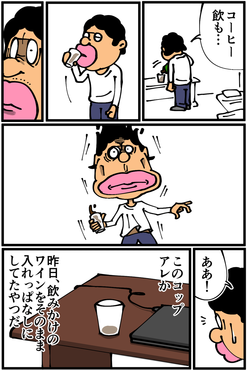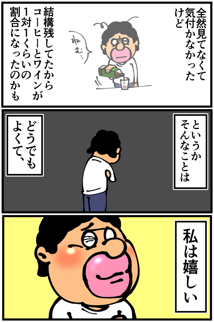 発酵しすぎて酸っぱくなっているワインは飲めたけれど、プラスコーヒーにはさすがに耐えられなかったわけか。