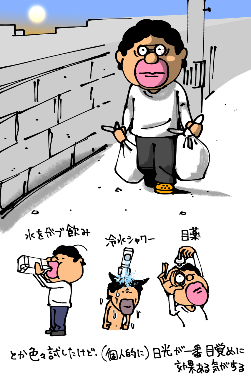 今日のひとコマ・その95「目覚めに最も効くもの」 2020年11月26日 昨日の記事のおまけなんですが、寝起きの悪さに何が効くか色々試した結果、太陽光を浴びるのが個人的に一番効果的ということに気が付きました。冷水シャワーでセルフ拷問する手段とかでも覚めるっちゃ覚めるんですが、無理やり叩き起こされた感じだからか脳がシャキッとしない。気がする。ちなみに俺の生活において、起きて太陽光を浴びる機会はゴミ出ししかないです。●Twitterやってます。●登録していただくと更新通知がLINEで届きます↓ 「今日のひとコマ」カテゴリの最新記事 < 前の記事次の記事 > コメント コメント一覧 (18) 1. スズメ 2020年11月26日 23:30 自律神経も整いますからね 太陽は偉大です〜 0 taikutsu_ken がしました 8. 退屈健 2020年11月27日 14:26 >>1 浴びるだけでシャキッとしますね~! 0 taikutsu_ken がしました 2. なめこ 2020年11月26日 23:30 覚悟を決めた吸血鬼みたいに見えます((( ;゚Д゚))) 0 taikutsu_ken がしました 9. 退屈健 2020年11月27日 14:26 >>2 日光関係無くなりますがどちらかというとゾンビかもしれないです!笑 0 taikutsu_ken がしました 3. 後継者 2020年11月26日 23:31 健康な生活に1歩近づいたって感じがしていいですね 0 taikutsu_ken がしました 10. 退屈健 2020年11月27日 14:29 >>3 まずは生活リズムからですね!笑 0 taikutsu_ken がしました 4. Nnnn 2020年11月26日 23:31 朝起きたらすぐ窓開けて太陽の光を浴びると健康にいいとか聞いたことあります🤔 0 taikutsu_ken がしました 11. 退屈健 2020年11月27日 14:30 >>4 健康にもいいんですね!これは習慣化しないと…! 0 taikutsu_ken がしました 5. ノ 2020年11月27日 02:41 スマホの明るさ最大にしてスマホをいじるのも目覚めますよ!なんか日光とブルーライトは同じ目覚めの効果?があるらしいです。 0 taikutsu_ken がしました 12. 退屈健 2020年11月27日 14:30 >>5 えっ、そうなんですか!それなら家にいてできますね…!笑 0 taikutsu_ken がしました 6. シュフ 2020年11月27日 04:34 朝に日光浴びてセロトニン分泌させると目が覚めるしやる気出ますよね!うつ病予防にも効果的なので、イイ習慣…て、なんかえらい顔しながら買い物に出てますね!笑 0 taikutsu_ken がしました 13. 退屈健 2020年11月27日 14:31 >>6 おおお、そんな効果があったんですね! 目が覚めすぎてこんな顔になりました!笑 0 taikutsu_ken がしました 7. ゆきちお 2020年11月27日 06:28 窓際で仕事しましょう。光合成出来るかも 0 taikutsu_ken がしました 14. 退屈健 2020年11月27日 14:31 >>7 確かに!気付いたら背が伸びてそうです!笑 0 taikutsu_ken がしました 15. kyakya 2020年11月27日 14:52 起きてカーテン開けたとき、 雨が降ってて太陽出てないと いまいちシャッキリしない気がします。 おひさまの光で自然に目覚める方がいいから、 遮光カーテンはあまりよろしくないというので 遮光カーテン買ったことないです〜。 0 taikutsu_ken がしました 16. 退屈健 2020年11月27日 20:01 >>15 確かに晴れてないとこの目覚まし方法が使えないのは難点ですね~;; 遮光カーテン、そう考えると一長一短かもしれないですね! 0 taikutsu_ken がしました 17. メガスッキリサメルマン 2020年12月02日 17:39 光を浴びると目が覚めるのはガチらしいです。 特に、耳の中に光を当てると一気に目が覚めますよ! 0 taikutsu_ken がしました 18. 退屈健 2020年12月03日 23:04 >>17 耳の中ですか!それは是非実践してみないと…! 0 taikutsu_ken がしました コメントフォーム 名前 コメント 記事の評価 リセット リセット 顔 星 情報を記憶 コメントを投稿する